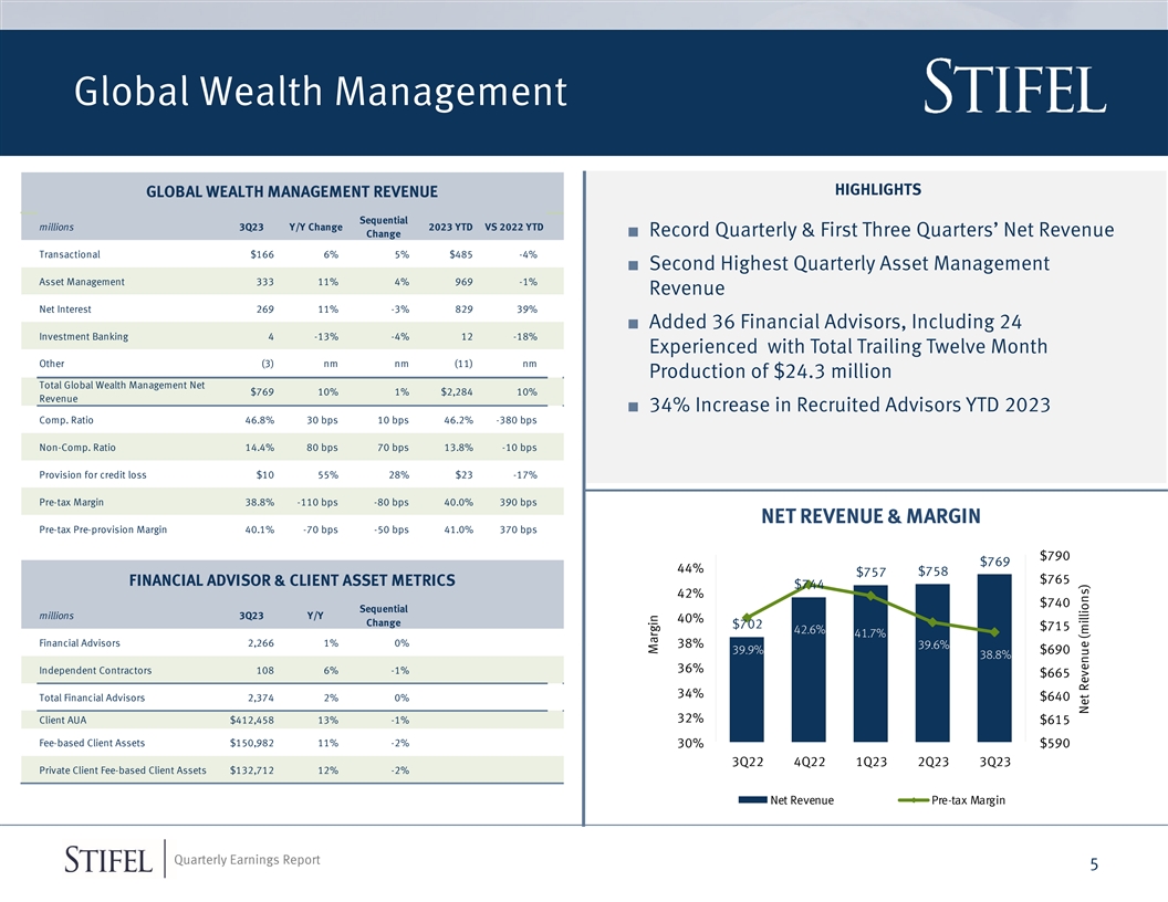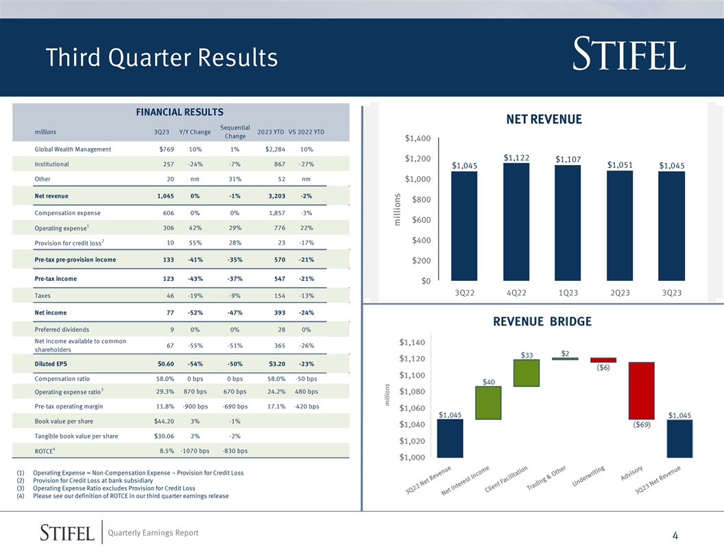 Third Quarter Results FINANCIAL RESULTS NET REVENUE Sequential millions 3Q23 Y/Y Change 2023 YTD VS 2022 YTD Change $1,400 Global Wealth Management $769 10% 1% $2,284 10% $1,122 $1,200 $1,107 Institutional 257 -24% -7% 867 -27% $1,045 $1,051 $1,045 Other 20 nm 31% 52 nm $1,000 Net revenue 1,045 0% -1% 3,203 -2% $800 Compensation expense 606 0% 0% 1,857 -3% $600 1 306 42% 29% 776 22% Operating expense 2 $400 10 55% 28% 23 -17% Provision for credit loss Pre-tax pre-provision income 133 -41% -35% 570 -21% $200 Pre-tax income 123 -43% -37% 547 -21% $0 3Q22 4Q22 1Q23 2Q23 3Q23 Taxes 46 -19% -9% 154 -13% Net income 77 -52% -47% 393 -24% Preferred dividends 9 0% 0% 28 0% Net income available to common 67 -55% -51% 365 -26% shareholders Diluted EPS $0.60 -54% -50% $3.20 -23% Compensation ratio 58.0% 0 bps 0 bps 58.0% -50 bps 3 29.3% 870 bps 670 bps 24.2% 480 bps Operating expense ratio Pre-tax operating margin 11.8% -900 bps -690 bps 17.1% -420 bps Book value per share $44.20 3% -1% Tangible book value per share $30.06 2% -2% 4 8.5% -1070 bps -830 bps ROTCE (1) Operating Expense = Non-Compensation Expense – Provision for Credit Loss (2) Provision for Credit Loss at bank subsidiary (3) Operating Expense Ratio excludes Provision for Credit Loss (4) Please see our definition of ROTCE in our third quarter earnings release Quarterly Earnings Report 4 millions