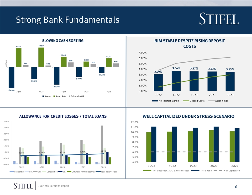 Global Wealth Management HIGHLIGHTS GLOBAL WEALTH MANAGEMENT REVENUE Sequential millions 3Q23 Y/Y Change 2023 YTD VS 2022 YTD Change■ Record Quarterly & First Three Quarters’ Net Revenue Transactional $166 6% 5% $485 -4% ■ Second Highest Quarterly Asset Management Asset Management 333 11% 4% 969 -1% Revenue Net Interest 269 11% -3% 829 39% ■ Added 36 Financial Advisors, Including 24 Investment Banking 4 -13% -4% 12 -18% Experienced with Total Trailing Twelve Month Other (3) nm nm (11) nm Production of $24.3 million Total Global Wealth Management Net $769 10% 1% $2,284 10% Revenue ■ 34% Increase in Recruited Advisors YTD 2023 Comp. Ratio 46.8% 30 bps 10 bps 46.2% -380 bps Non-Comp. Ratio 14.4% 80 bps 70 bps 13.8% -10 bps Provision for credit loss $10 55% 28% $23 -17% Pre-tax Margin 38.8% -110 bps -80 bps 40.0% 390 bps NET REVENUE & MARGIN Pre-tax Pre-provision Margin 40.1% -70 bps -50 bps 41.0% 370 bps $790 $769 44% $757 $758 $765 FINANCIAL ADVISOR & CLIENT ASSET METRICS $744 42% $740 Sequential millions 3Q23 Y/Y 40% Change $702 $715 42.6% 41.7% Financial Advisors 2,266 1% 0% 38% 39.6% 39.9% $690 38.8% 36% Independent Contractors 108 6% -1% $665 34% Total Financial Advisors 2,374 2% 0% $640 32% Client AUA $412,458 13% -1% $615 Fee-based Client Assets $150,982 11% -2% 30% $590 3Q22 4Q22 1Q23 2Q23 3Q23 Private Client Fee-based Client Assets $132,712 12% -2% Net Revenue Pre-tax Margin Quarterly Earnings Report 5 Margin Net Revenue (millions)