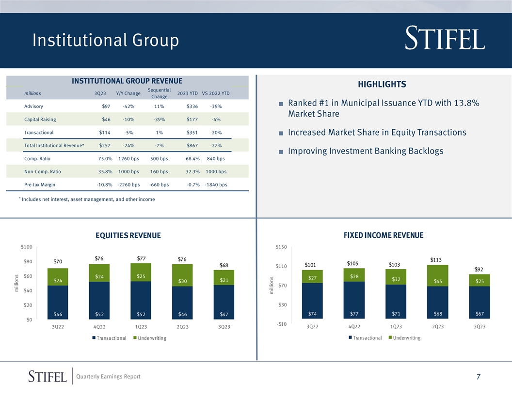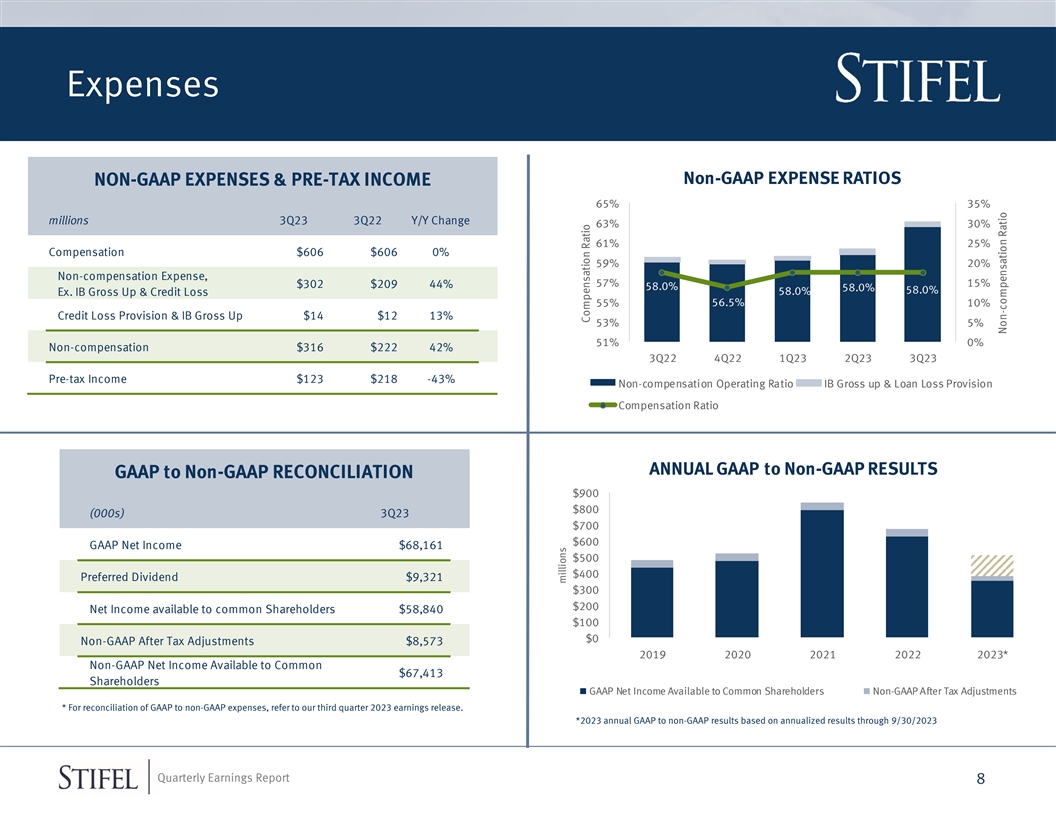 Institutional Group INSTITUTIONAL GROUP REVENUE HIGHLIGHTS Sequential millions 3Q23 Y/Y Change 2023 YTD VS 2022 YTD Change ■ Ranked #1 in Municipal Issuance YTD with 13.8% Advisory $97 -42% 11% $336 -39% Market Share Capital Raising $46 -10% -39% $177 -4% Transactional $114 -5% 1% $351 -20% ■ Increased Market Share in Equity Transactions Total Institutional Revenue* $257 -24% -7% $867 -27% ■ Improving Investment Banking Backlogs Comp. Ratio 75.0% 1260 bps 500 bps 68.4% 840 bps Non-Comp. Ratio 35.8% 1000 bps 160 bps 32.3% 1000 bps Pre-tax Margin -10.8% -2260 bps -660 bps -0.7% -1840 bps * Includes net interest, asset management, and other income EQUITIES REVENUE FIXED INCOME REVENUE $100 $150 $76 $77 $76 $113 $80 $70 $105 $101 $103 $68 $110 $92 $60 $24 $25 $28 $27 $32 $24 $21 $30 $45 $25 $70 $40 $30 $20 $74 $77 $71 $68 $67 $46 $52 $52 $46 $47 $0 -$10 3Q22 4Q22 1Q23 2Q23 3Q23 3Q22 4Q22 1Q23 2Q23 3Q23 Transactional Underwriting Transactional Underwriting * 2021 revenue based on annualized results through 9/30/2021 Quarterly Earnings Report 7 millions millions