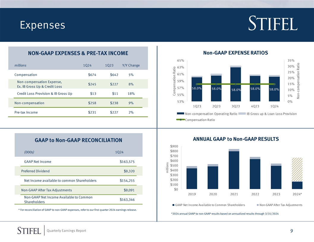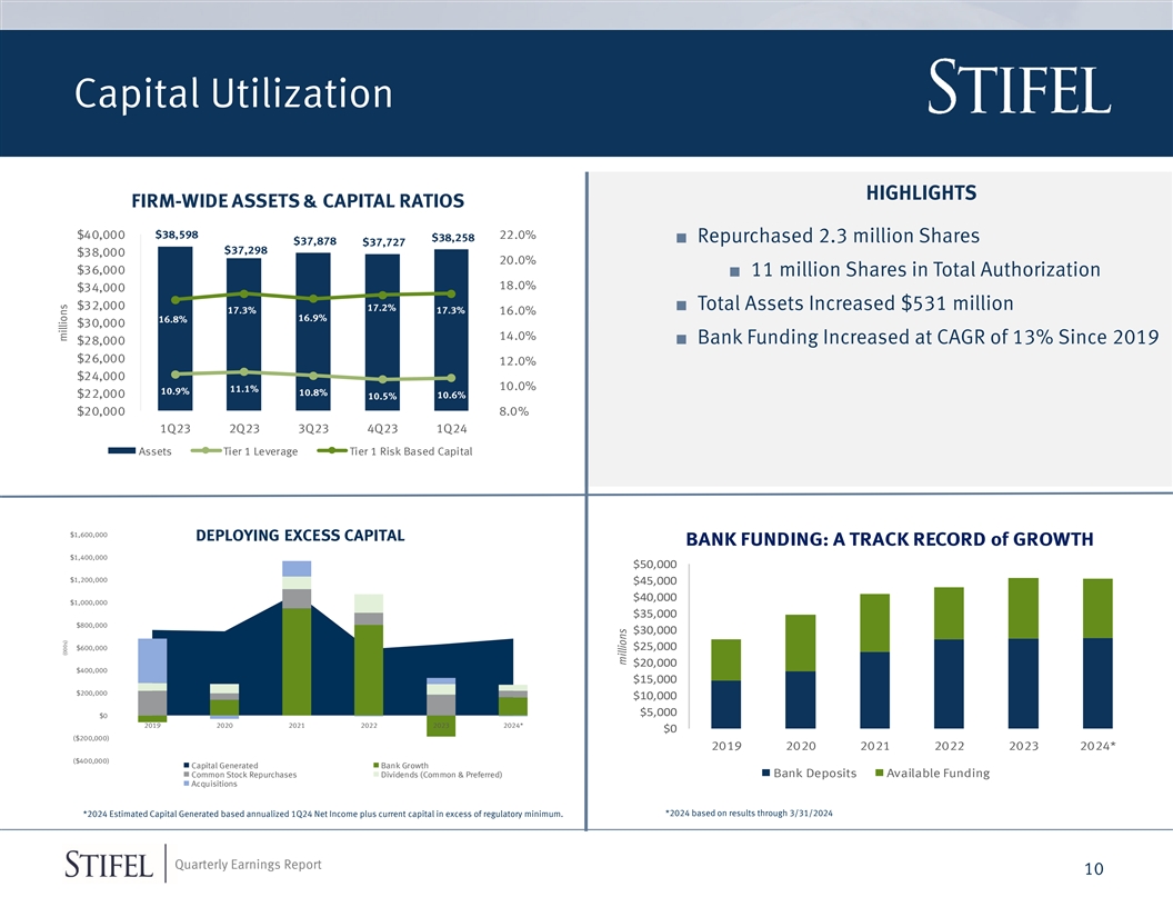 Expenses Non-GAAP EXPENSE RATIOS NON-GAAP EXPENSES & PRE-TAX INCOME 65% 35% millions 1Q24 1Q23 Y/Y Change 30% 63% 25% 61% Compensation $674 $642 5% 20% 59% Non-compensation Expense, 15% $245 $227 8% Ex. IB Gross Up & Credit Loss 57% 58.0% 58.0% 58.0% 58.0% 58.0% 10% Credit Loss Provision & IB Gross Up $13 $11 18% 55% 5% 53% 0% Non-compensation $258 $238 9% 1Q23 2Q23 3Q23 4Q23 1Q24 Pre-tax Income $231 $227 2% Non-compensation Operating Ratio IB Gross up & Loan Loss Provision Compensation Ratio ANNUAL GAAP to Non-GAAP RESULTS GAAP to Non-GAAP RECONCILIATION $900 $800 (000s) 1Q24 $700 $600 GAAP Net Income $163,575 $500 $400 Preferred Dividend $9,320 $300 $200 Net Income available to common Shareholders $154,255 $100 $0 Non-GAAP After Tax Adjustments $9,091 2019 2020 2021 2022 2023 2024* Non-GAAP Net Income Available to Common $163,346 Shareholders GAAP Net Income Available to Common Shareholders Non-GAAP After Tax Adjustments * For reconciliation of GAAP to non-GAAP expenses, refer to our first quarter 2024 earnings release. *2024 annual GAAP to non-GAAP results based on annualized results through 3/31/2024 Quarterly Earnings Report 9 millions Compensation Ratio Non-compensation Ratio