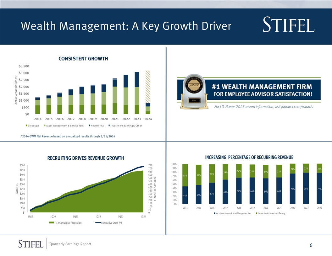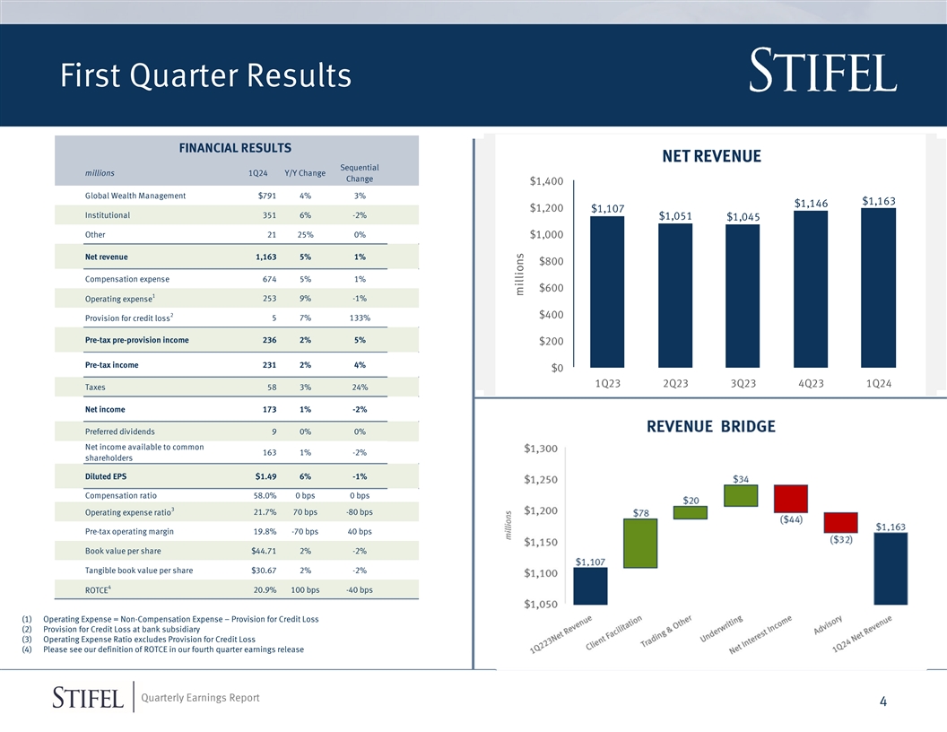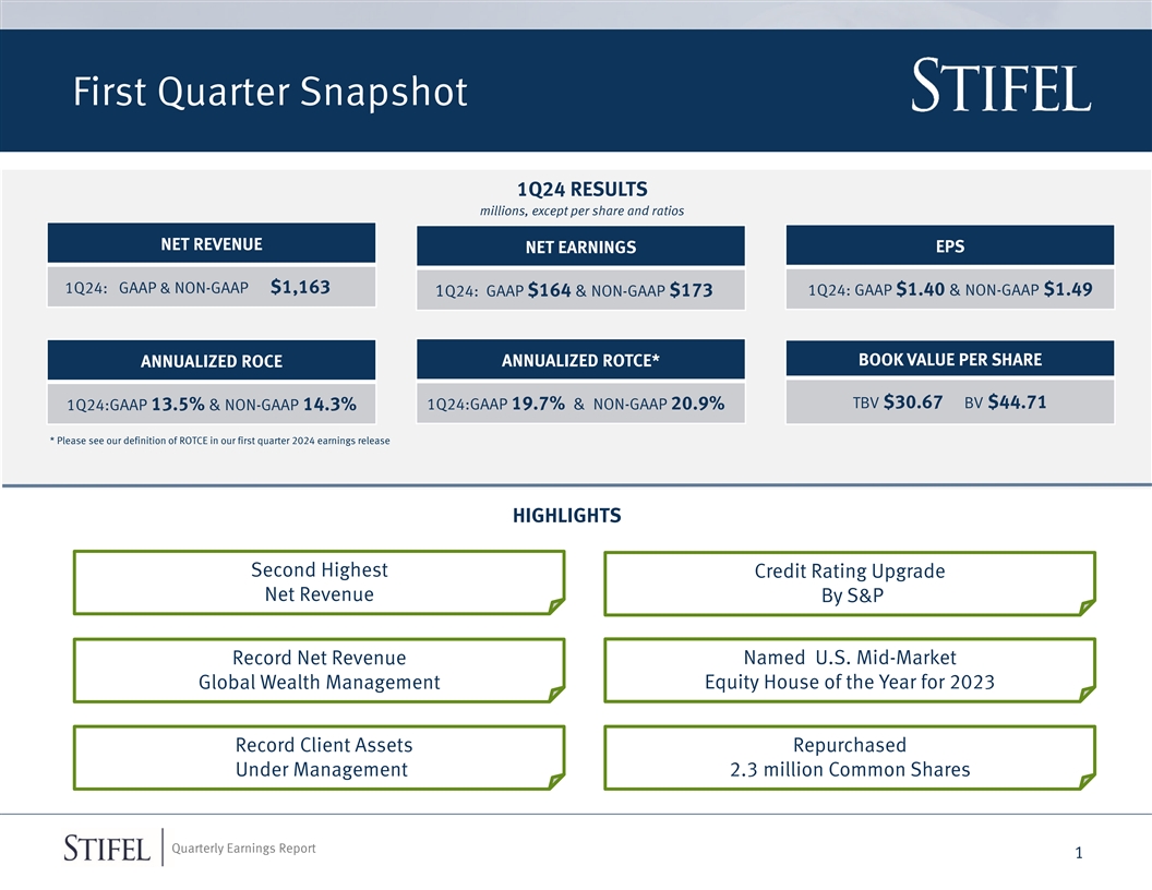 First Quarter Snapshot 1Q24 RESULTS millions, except per share and ratios NET REVENUE NET EARNINGS EPS 1Q24: GAAP & NON-GAAP $1,163 1Q24: GAAP $1.40 & NON-GAAP $1.49 1Q24: GAAP $164 & NON-GAAP $173 ANNUALIZED ROTCE* BOOK VALUE PER SHARE ANNUALIZED ROCE TBV $30.67 BV $44.71 1Q24:GAAP 13.5% & NON-GAAP 14.3% 1Q24:GAAP 19.7% & NON-GAAP 20.9% * Please see our definition of ROTCE in our first quarter 2024 earnings release HIGHLIGHTS Second Highest Credit Rating Upgrade Net Revenue By S&P Record Net Revenue Named U.S. Mid-Market Global Wealth Management Equity House of the Year for 2023 Record Client Assets Repurchased Under Management 2.3 million Common Shares Quarterly Earnings Report 1