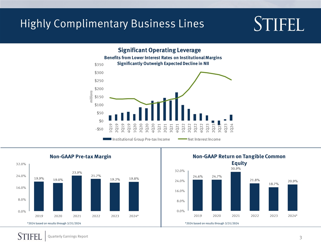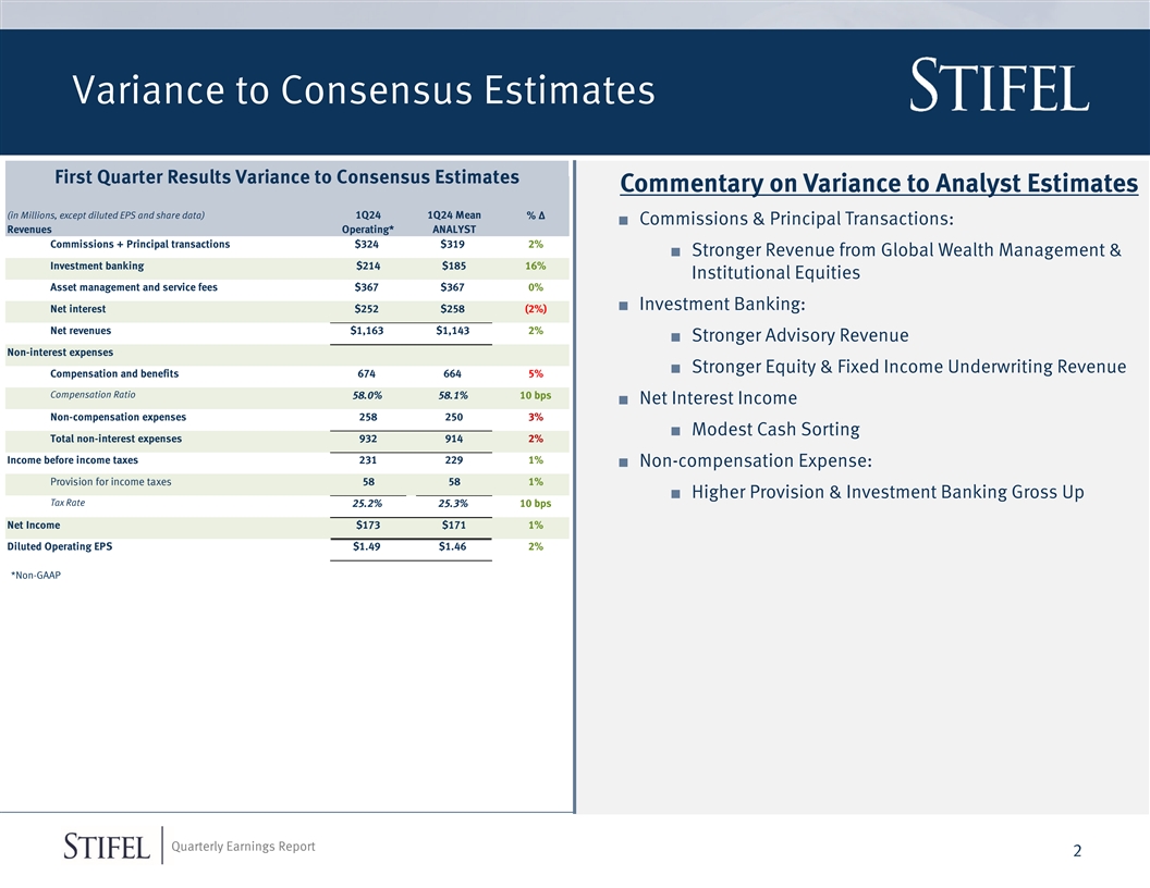 Variance to Consensus Estimates First Quarter Results Variance to Consensus Estimates Commentary on Variance to Analyst Estimates (in Millions, except diluted EPS and share data) 1Q24 1Q24 Mean % Δ ■ Commissions & Principal Transactions: Revenues Operating* ANALYST Commissions + Principal transactions $324 $319 2% ■ Stronger Revenue from Global Wealth Management & Investment banking $214 $185 16% Institutional Equities Asset management and service fees $367 $367 0% ■ Investment Banking: Net interest $252 $258 (2%) Net revenues $1,163 $1,143 2% ■ Stronger Advisory Revenue Non-interest expenses ■ Stronger Equity & Fixed Income Underwriting Revenue Compensation and benefits 674 664 5% Compensation Ratio 58.0% 58.1% 10 bps ■ Net Interest Income Non-compensation expenses 258 250 3% ■ Modest Cash Sorting Total non-interest expenses 932 914 2% Income before income taxes 231 229 1% ■ Non-compensation Expense: Provision for income taxes 58 58 1% ■ Higher Provision & Investment Banking Gross Up Tax Rate 25.2% 25.3% 10 bps Net Income $173 $171 1% Diluted Operating EPS $1.49 $1.46 2% *Non-GAAP Quarterly Earnings Report 2