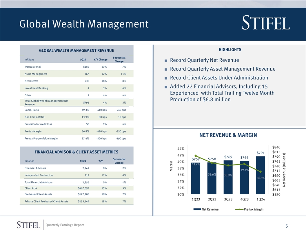 First Quarter Results FINANCIAL RESULTS NET REVENUE Sequential millions 1Q24 Y/Y Change Change $1,400 Global Wealth Management $791 4% 3% $1,163 $1,146 $1,200 $1,107 Institutional 351 6% -2% $1,051 $1,045 Other 21 25% 0% $1,000 Net revenue 1,163 5% 1% $800 Compensation expense 674 5% 1% $600 1 Operating expense 253 9% -1% 2 $400 57% 133% Provision for credit loss Pre-tax pre-provision income 236 2% 5% $200 Pre-tax income 231 2% 4% $0 1Q23 2Q23 3Q23 4Q23 1Q24 Taxes 58 3% 24% Net income 173 1% -2% Preferred dividends 9 0% 0% Net income available to common 163 1% -2% shareholders Diluted EPS $1.49 6% -1% Compensation ratio 58.0% 0 bps 0 bps 3 Operating expense ratio 21.7% 70 bps -80 bps Pre-tax operating margin 19.8% -70 bps 40 bps Book value per share $44.71 2% -2% Tangible book value per share $30.67 2% -2% 4 ROTCE 20.9% 100 bps -40 bps (1) Operating Expense = Non-Compensation Expense – Provision for Credit Loss (2) Provision for Credit Loss at bank subsidiary (3) Operating Expense Ratio excludes Provision for Credit Loss (4) Please see our definition of ROTCE in our fourth quarter earnings release Quarterly Earnings Report 4 millions
