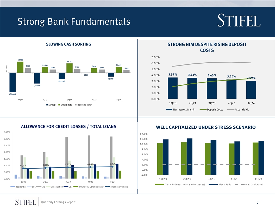 Wealth Management: A Key Growth Driver CONSISTENT GROWTH $3,500 $3,000 $2,500 $2,000 $1,500 $1,000 $500 $0 2014 2015 2016 2017 2018 2019 2020 2021 2022 2023 2024 Brokerage Asset Management & Service Fees Net Interest Investment Banking & Other *2024 GWM Net Revenue based on annualized results through 3/31/2024 INCREASING PERCENTAGE OF RECURRING REVENUE RECRUITING DRIVES REVENUE GROWTH 100% $500 750 90% 700 22% 23% 24% $450 34% 32% 32% 650 80% 39% 33% 46% $400 600 51% 55% 70% 550 $350 60% 500 50% $300 450 400 40% 78% $250 76% 77% 350 66% 66% 66% 64% 30% 60% 53% $200 300 47% 44% 20% 250 $150 200 10% $100 150 0% 100 $50 2014 2015 2016 2017 2018 2019 2020 2021 2022 2023 2024 50 $- 0 Net Interest Income & Asset Management Fees Transactional & Investment Banking 1Q19 1Q20 1Q21 1Q22 1Q23 1Q24 T-12 Cumulative Production Cumulative Gross FAs Quarterly Earnings Report 6 Net Revenue (millions) millions Financial Advisors