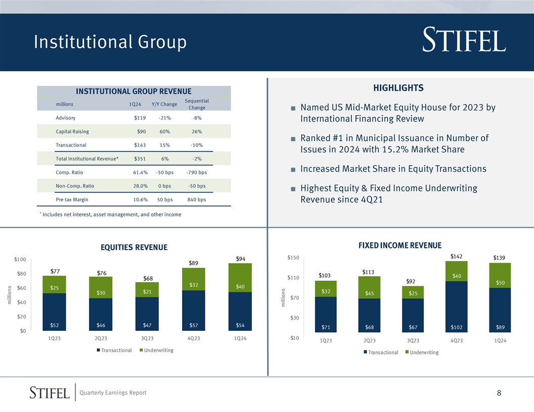 Institutional Group HIGHLIGHTS INSTITUTIONAL GROUP REVENUE Sequential millions 1Q24 Y/Y Change Change ■ Named US Mid-Market Equity House for 2023 by Advisory $119 -21% -8% International Financing Review Capital Raising $90 60% 26% ■ Ranked #1 in Municipal Issuance in Number of Transactional $143 15% -10% Issues in 2024 with 15.2% Market Share Total Institutional Revenue* $351 6% -2% ■ Increased Market Share in Equity Transactions Comp. Ratio 61.4% -50 bps -790 bps Non-Comp. Ratio 28.0% 0 bps -50 bps ■ Highest Equity & Fixed Income Underwriting Pre-tax Margin 10.6% 50 bps 840 bps Revenue since 4Q21 * Includes net interest, asset management, and other income FIXED INCOME REVENUE EQUITIES REVENUE $142 $150 $139 $94 $100 $89 $77 $113 $80 $76 $103 $40 $110 $68 $92 $50 $32 $40 $25 $60 $21 $32 $30 $45 $25 $70 $40 $20 $30 $52 $46 $47 $57 $54 $71 $68 $67 $102 $89 $0 1Q23 2Q23 3Q23 4Q23 1Q24 -$10 1Q23 2Q23 3Q23 4Q23 1Q24 Transactional Underwriting Transactional Underwriting * 2021 revenue based on annualized results through 9/30/2021 Quarterly Earnings Report 8 millions millions