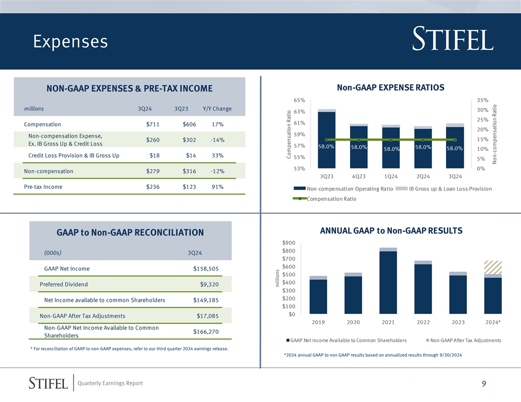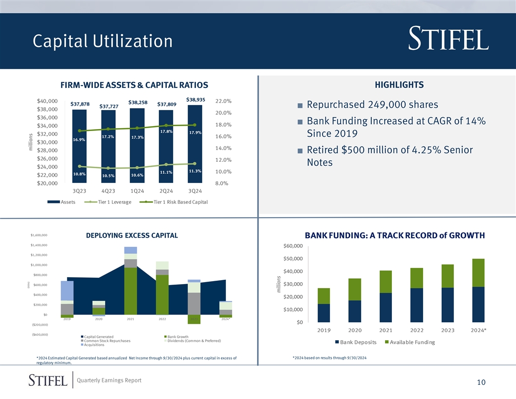 Expenses Non-GAAP EXPENSE RATIOS NON-GAAP EXPENSES & PRE-TAX INCOME 65% 35% millions 3Q24 3Q23 Y/Y Change 30% 63% 25% 61% Compensation $711 $606 17% 20% 59% Non-compensation Expense, 15% $260 $302 -14% Ex. IB Gross Up & Credit Loss 57% 58.0% 58.0% 58.0% 58.0% 58.0% 10% Credit Loss Provision & IB Gross Up $18 $14 33% 55% 5% 53% 0% Non-compensation $279 $316 -12% 3Q23 4Q23 1Q24 2Q24 3Q24 Pre-tax Income $236 $123 91% Non-compensation Operating Ratio IB Gross up & Loan Loss Provision Compensation Ratio ANNUAL GAAP to Non-GAAP RESULTS GAAP to Non-GAAP RECONCILIATION $900 $800 (000s) 3Q24 $700 $600 GAAP Net Income $158,505 $500 $400 Preferred Dividend $9,320 $300 $200 Net Income available to common Shareholders $149,185 $100 $0 Non-GAAP After Tax Adjustments $17,085 2019 2020 2021 2022 2023 2024* Non-GAAP Net Income Available to Common $166,270 Shareholders GAAP Net Income Available to Common Shareholders Non-GAAP After Tax Adjustments * For reconciliation of GAAP to non-GAAP expenses, refer to our third quarter 2024 earnings release. *2024 annual GAAP to non-GAAP results based on annualized results through 9/30/2024 Quarterly Earnings Report 9 millions Compensation Ratio Non-compensation Ratio