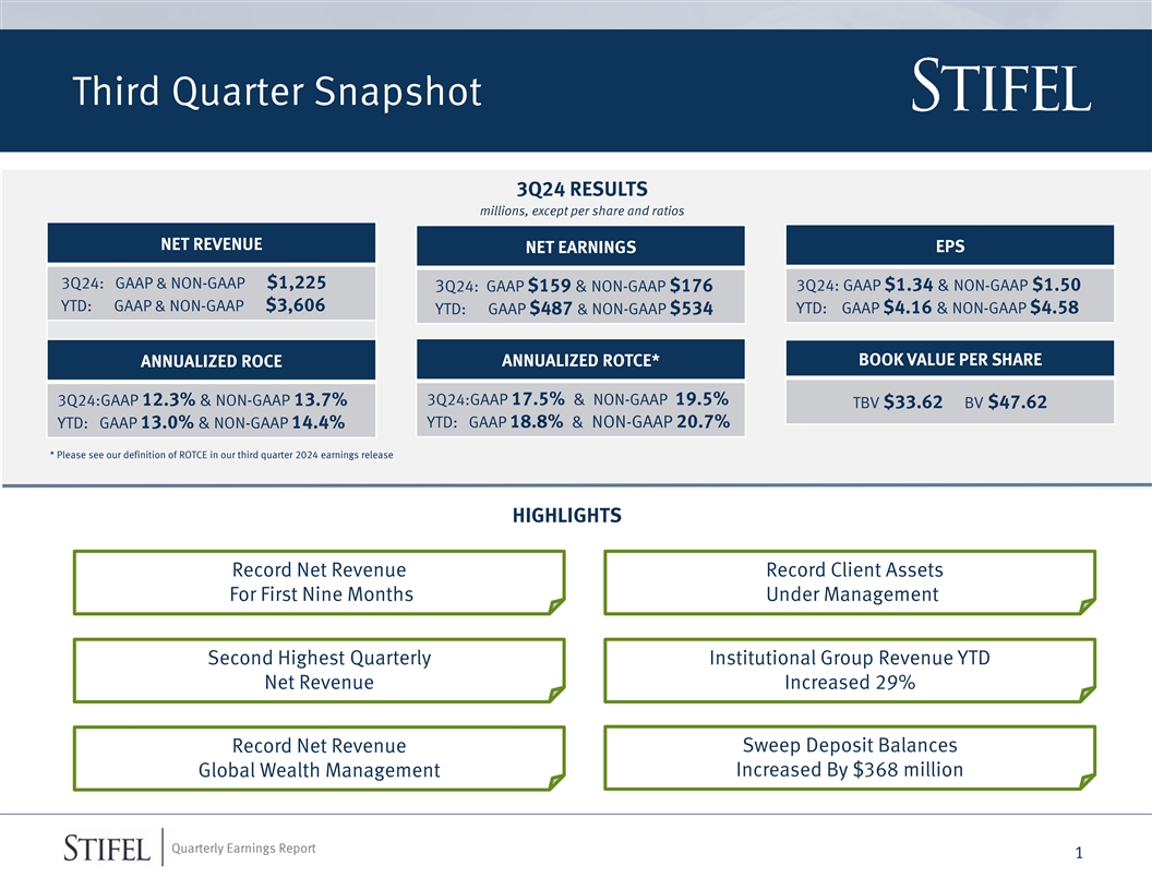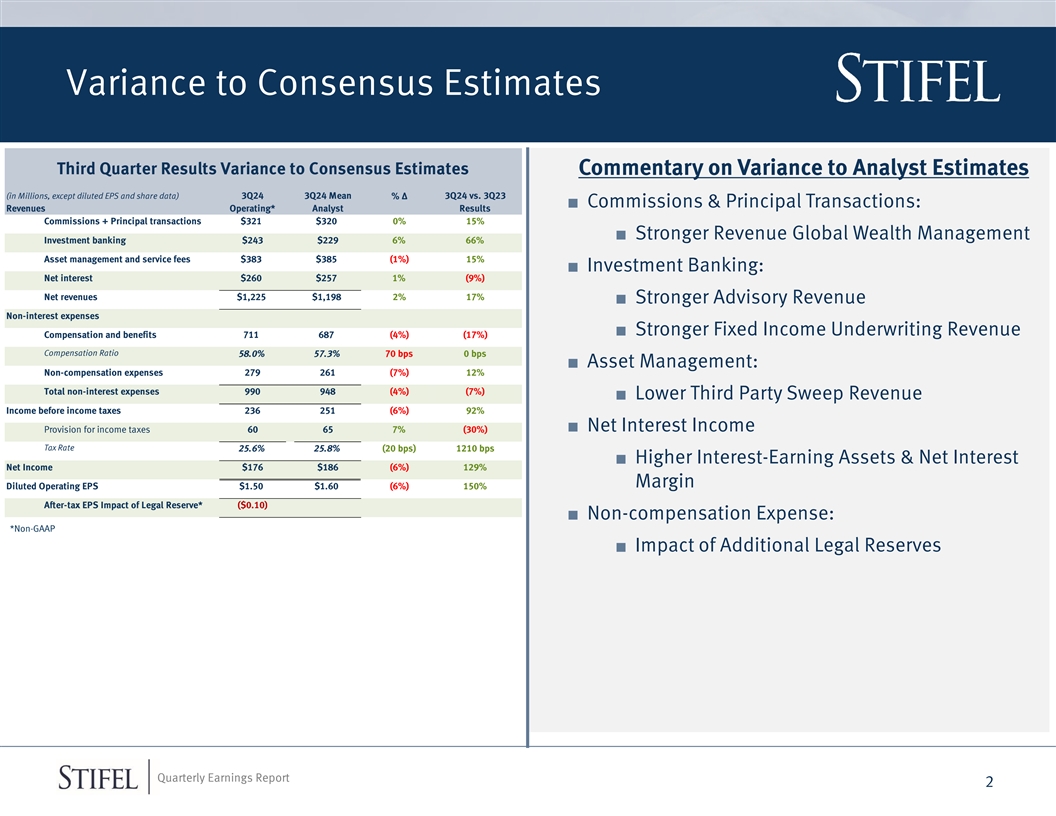 Third Quarter Snapshot 3Q24 RESULTS millions, except per share and ratios NET REVENUE NET EARNINGS EPS 3Q24: GAAP & NON-GAAP $1,225 3Q24: GAAP $1.34 & NON-GAAP $1.50 3Q24: GAAP $159 & NON-GAAP $176 YTD: GAAP & NON-GAAP $3,606 YTD: GAAP $487 & NON-GAAP $534 YTD: GAAP $4.16 & NON-GAAP $4.58 BOOK VALUE PER SHARE ANNUALIZED ROTCE* ANNUALIZED ROCE 3Q24:GAAP 12.3% & NON-GAAP 13.7% 3Q24:GAAP 17.5% & NON-GAAP 19.5% TBV $33.62 BV $47.62 YTD: GAAP 18.8% & NON-GAAP 20.7% YTD: GAAP 13.0% & NON-GAAP 14.4% * Please see our definition of ROTCE in our third quarter 2024 earnings release HIGHLIGHTS Record Net Revenue Record Client Assets For First Nine Months Under Management Second Highest Quarterly Institutional Group Revenue YTD Net Revenue Increased 29% Sweep Deposit Balances Record Net Revenue Global Wealth Management Increased By $368 million Quarterly Earnings Report 1