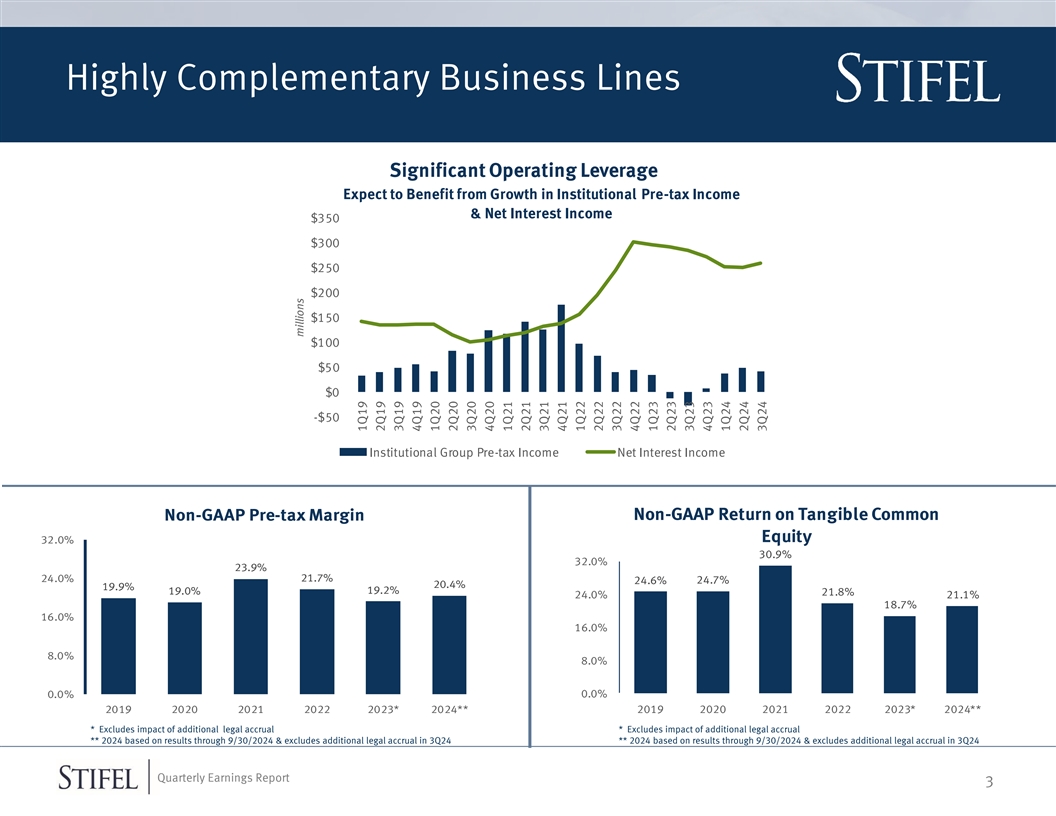 Variance to Consensus Estimates Third Quarter Results Variance to Consensus Estimates Commentary on Variance to Analyst Estimates (in Millions, except diluted EPS and share data) 3Q24 3Q24 Mean 3Q24 vs. 3Q23 % ∆ ■ Commissions & Principal Transactions: Revenues Operating* Analyst Results Commissions + Principal transactions $321 $320 0% 15% ■ Stronger Revenue Global Wealth Management Investment banking $243 $229 6% 66% Asset management and service fees $383 $385 (1%) 15% ■ Investment Banking: Net interest $260 $257 1% (9%) Net revenues $1,225 $1,198 2% 17% ■ Stronger Advisory Revenue Non-interest expenses ■ Stronger Fixed Income Underwriting Revenue Compensation and benefits 711 687 (4%) (17%) Compensation Ratio 58.0% 57.3% 70 bps 0 bps ■ Asset Management: Non-compensation expenses 279 261 (7%) 12% Total non-interest expenses 990 948 (4%) (7%) ■ Lower Third Party Sweep Revenue Income before income taxes 236 251 (6%) 92% ■ Net Interest Income Provision for income taxes 60 65 7% (30%) Tax Rate 25.6% 25.8% (20 bps) 1210 bps ■ Higher Interest-Earning Assets & Net Interest Net Income $176 $186 (6%) 129% Margin Diluted Operating EPS $1.50 $1.60 (6%) 150% After-tax EPS Impact of Legal Reserve* ($0.10) ■ Non-compensation Expense: *Non-GAAP ■ Impact of Additional Legal Reserves Quarterly Earnings Report 2
