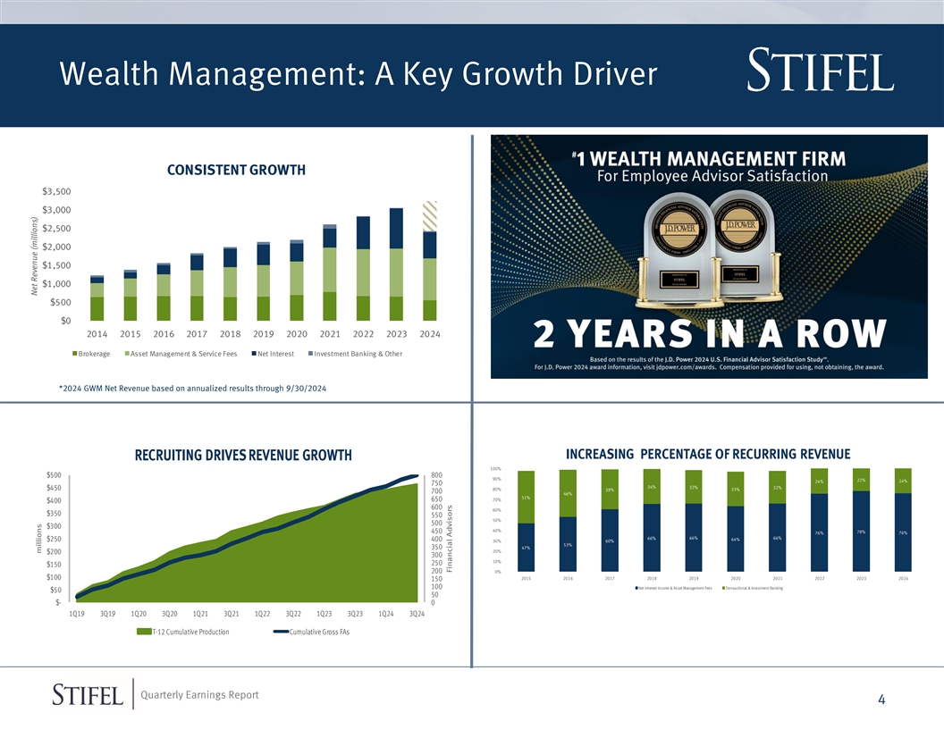 Highly Complementary Business Lines Significant Operating Leverage Expect to Benefit from Growth in Institutional Pre-tax Income & Net Interest Income $350 $300 $250 $200 $150 $100 $50 $0 -$50 Institutional Group Pre-tax Income Net Interest Income Non-GAAP Return on Tangible Common Non-GAAP Pre-tax Margin Equity 32.0% 30.9% 32.0% 23.9% 21.7% 24.0% 24.6% 24.7% 20.4% 19.9% 19.2% 19.0% 21.8% 24.0% 21.1% 18.7% 16.0% 16.0% 8.0% 8.0% 0.0% 0.0% 2019 2020 2021 2022 2023* 2024** 2019 2020 2021 2022 2023* 2024** * Excludes impact of additional legal accrual * Excludes impact of additional legal accrual ** 2024 based on results through 9/30/2024 & excludes additional legal accrual in 3Q24 ** 2024 based on results through 9/30/2024 & excludes additional legal accrual in 3Q24 Quarterly Earnings Report 3 millions 1Q19 2Q19 3Q19 4Q19 1Q20 2Q20 3Q20 4Q20 1Q21 2Q21 3Q21 4Q21 1Q22 2Q22 3Q22 4Q22 1Q23 2Q23 3Q23 4Q23 1Q24 2Q24 3Q24