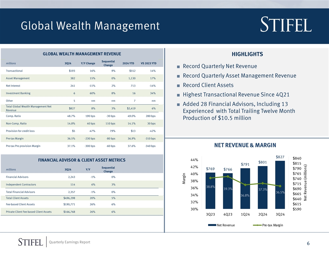 Third Quarter Results FINANCIAL RESULTS NET REVENUE Sequential millions 3Q24 Y/Y Change 2024 YTD VS 2023 YTD Change $1,400 $1,218 $1,225 Global Wealth Management $827 8% 3% $2,419 6% $1,163 $1,146 $1,200 $1,045 Institutional 372 45% -5% 1,114 29% $1,000 Other 26 28% -4% 73 40% $800 Net revenue 1,225 17% 1% 3,606 13% $600 Compensation expense 711 17% 1% 2,092 13% 1 273 -12% 6% 784 1% Operating expense $400 2 Provision for credit loss 5 -47% 79% 14 -41% $200 Pre-tax pre-provision income 241 81% -5% 731 28% $0 3Q23 4Q23 1Q24 2Q24 3Q24 Pre-tax income 236 92% -6% 717 31% Taxes 60 30% -7% 183 19% Net income 176 129% -6% 534 36% Preferred dividends 9 0% 0% 28 0% Net income available to common 166 147% -6% 506 39% shareholders Diluted EPS $1.50 150% -6% $4.58 43% Compensation ratio 58.0% 0 bps 0 bps 58.0% 0 bps 3 22.3% -700 bps 120 bps 21.7% -250 bps Operating expense ratio Pre-tax operating margin 19.2% 740 bps -140 bps 19.9% 280 bps Book value per share $47.62 8% 4% Tangible book value per share $33.62 12% 5% 4 ROTCE 19.5% 1100 bps -240 bps (1) Operating Expense = Non-Compensation Expense – Provision for Credit Loss (2) Provision for Credit Loss at bank subsidiary (3) Operating Expense Ratio excludes Provision for Credit Loss (4) Please see our definition of ROTCE in our second quarter earnings release Quarterly Earnings Report 5 millions