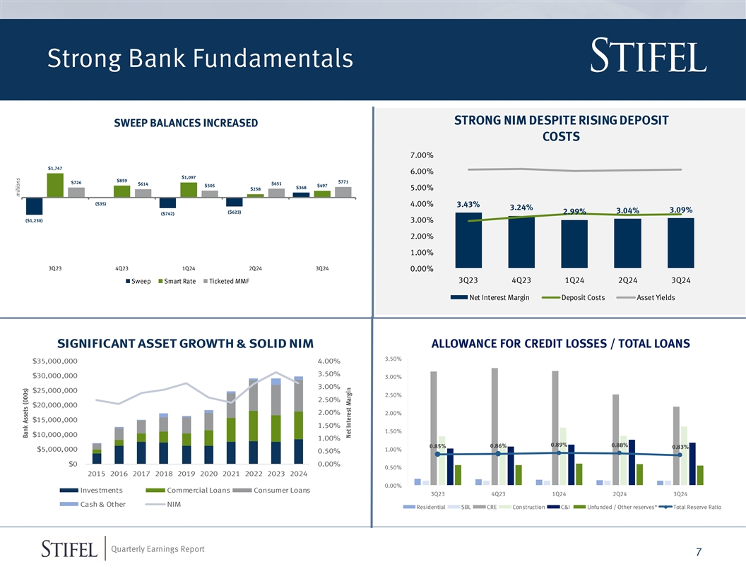 Strong Bank Fundamentals STRONG NIM DESPITE RISING DEPOSIT SWEEP BALANCES INCREASED COSTS 7.00% $1,747 6.00% $1,097 $859 $771 $726 $614 $651 $505 $497 $368 5.00% $258 ($35) 4.00% 3.43% 3.24% 3.09% ($623) 3.04% 2.99% ($742) ($1,230) 3.00% 2.00% 1.00% 3Q23 4Q23 1Q24 2Q24 3Q24 0.00% Sweep Smart Rate Ticketed MMF 3Q23 4Q23 1Q24 2Q24 3Q24 Net Interest Margin Deposit Costs Asset Yields SIGNIFICANT ASSET GROWTH & SOLID NIM ALLOWANCE FOR CREDIT LOSSES / TOTAL LOANS 3.50% $35,000,000 4.00% 3.50% $30,000,000 3.00% 3.00% $25,000,000 2.50% 2.50% $20,000,000 2.00% 2.00% $15,000,000 1.50% 1.50% $10,000,000 1.00% 0.89% 0.88% 0.85% 0.86% 0.83% $5,000,000 1.00% 0.50% $0 0.00% 0.50% 2015 2016 2017 2018 2019 2020 2021 2022 2023 2024 0.00% Investments Commercial Loans Consumer Loans 3Q23 4Q23 1Q24 2Q24 3Q24 Cash & Other NIM Residential SBL CRE Construction C&I Unfunded / Other reserves* Total Reserve Ratio Quarterly Earnings Report 7 millions Bank Assets (000s) Net Interest Margin