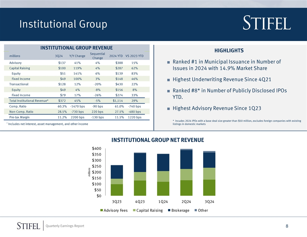 Institutional Group INSTITUTIONAL GROUP REVENUE HIGHLIGHTS Sequential millions 3Q24 Y/Y Change 2024 YTD VS 2023 YTD Change ■ Ranked #1 in Municipal Issuance in Number of Advisory $137 41% 4% $388 15% Capital Raising $100 119% 4% $287 62% Issues in 2024 with 14.9% Market Share Equity $51 141% 6% $139 83% Fixed Income $49 100% 3% $148 46% ■ Highest Underwriting Revenue Since 4Q21 Transactional $128 12% -20% $430 22% Equity $49 4% -8% $156 8% ■ Ranked #8* in Number of Publicly Disclosed IPOs Fixed Income $79 17% -26% $274 33% YTD. Total Institutional Revenue* $372 45% -5% $1,114 29% Comp. Ratio 60.3% -1470 bps -90 bps 61.0% -740 bps ■ Highest Advisory Revenue Since 1Q23 Non-Comp. Ratio 28.5% -730 bps 220 bps 27.5% -480 bps Pre-tax Margin 11.2% 2200 bps -130 bps 11.5% 1220 bps * Incudes 2024 IPOs with a base deal size greater than $50 million, excludes foreign companies with existing * Includes net interest, asset management, and other income listings in domestic markets INSTITUTIONAL GROUP NET REVENUE $400 $350 $300 $250 $200 $150 $100 $50 $0 3Q23 4Q23 1Q24 2Q24 3Q24 Advisory Fees Capital Raising Brokerage Other * 2021 revenue based on annualized results through 9/30/2021 Quarterly Earnings Report 8 millions