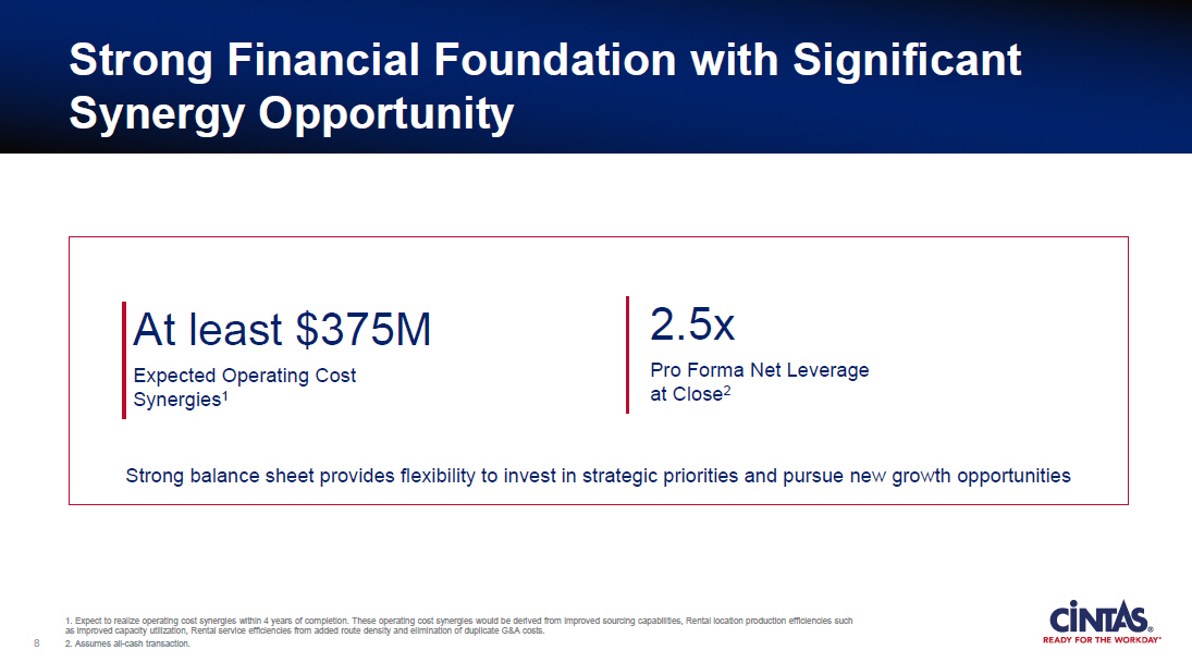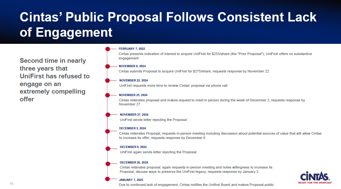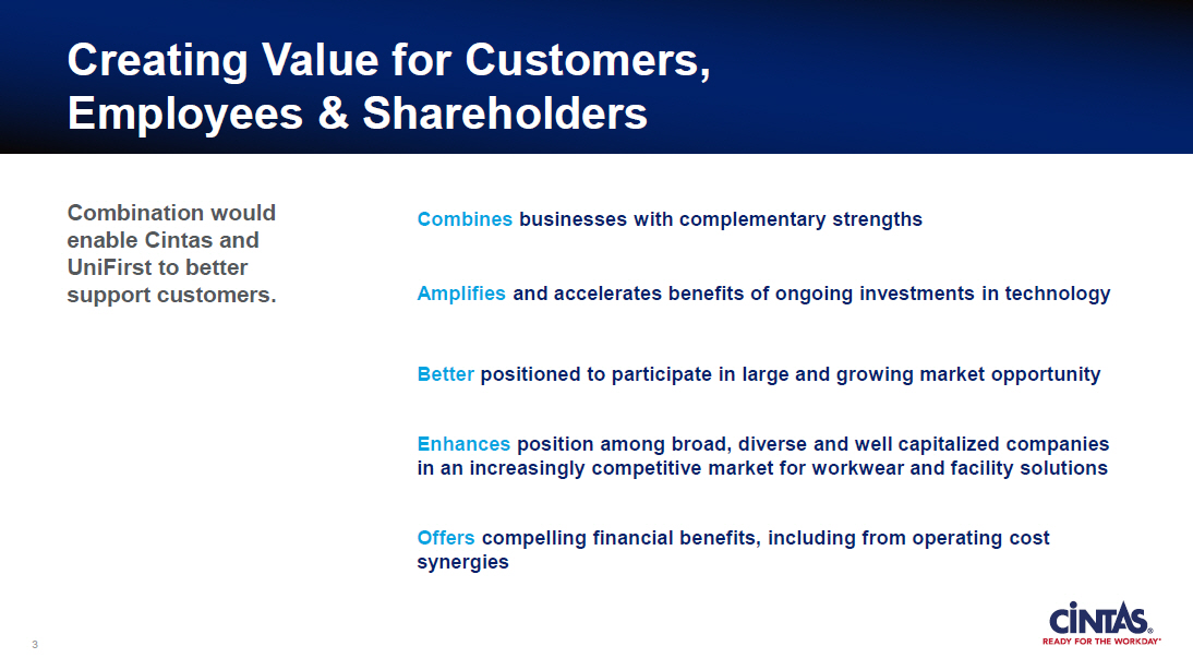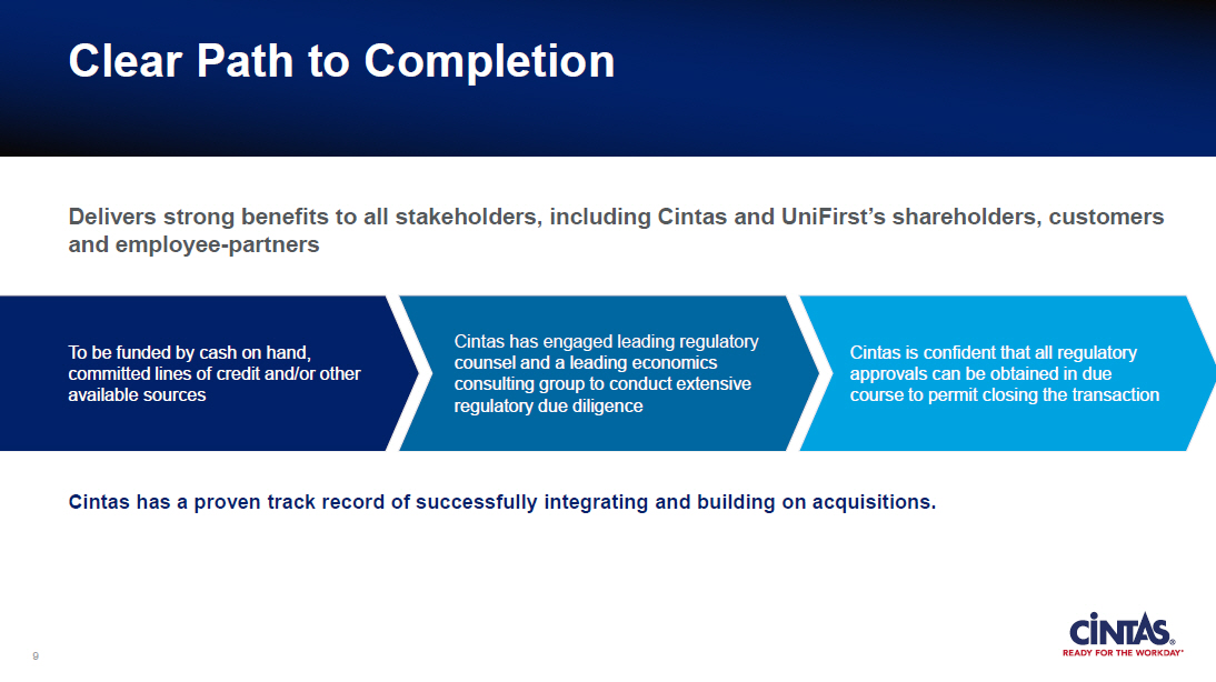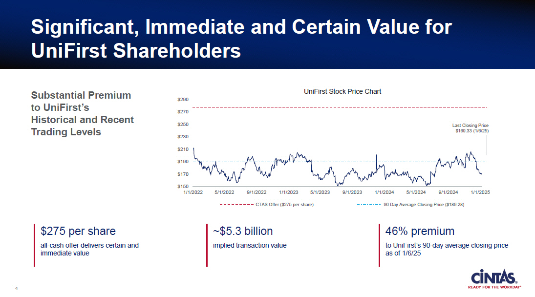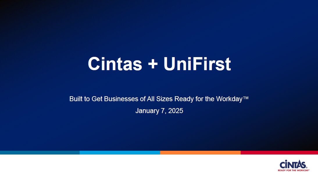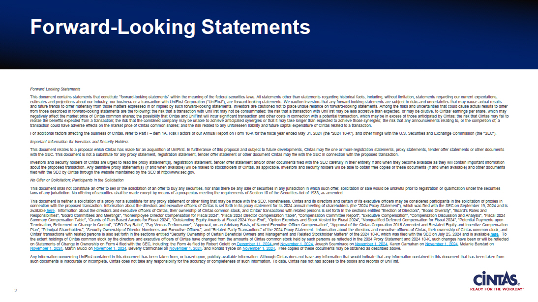 Forward Looking Statements This document contains statements that constitute "forward - looking statements" within the meaning of the federal securities laws . All statements other than statements regarding historical facts, including, without limitation, statements regarding our current expectations, estimates and projections about our industry, our business or a transaction with UniFirst Corporation (“UniFirst”), are forward - looking statements. We caution investors that any forward - looking statements are subject to risks and uncertainties that may cause actual results and future trends to differ materially from those matters expressed in or implied by such forward - looking statements. Investors are cautioned not to place undue reliance on forward - looking statements. Among the risks and uncertainties that could cause actual results to differ from those described in forward - looking statements are the following: the risk that a transaction with UniFirst may not be consummated; the risk that a transaction with UniFirst may be less accretive than expected, or may be dilutive, to Cintas’ earnings per share, which may negatively affect the market price of Cintas common shares; the possibility that Cintas and UniFirst will incur significant transaction and other costs in connection with a potential transaction, which may be in excess of those anticipated by Cintas; the risk that Cintas may fail to realize the benefits expected from a transaction; the risk that the combined company may be unable to achieve anticipated synergies or that it may take longer than expected to achieve those synergies; the risk that any announcements relating to, or the completion of, a transaction could have adverse effects on the market price of Cintas common shares; and the risk related to any unforeseen liability and future capital expenditure of Cintas related to a transaction. For additional factors affecting the business of Cintas, refer to Part I – Item 1A. Risk Factors of our Annual Report on Form 10 - K for the fiscal year ended May 31, 2024 (the “2024 10 - K”), and other filings with the U.S. Securities and Exchange Commission (the “SEC”). Important Information for Investors and Security Holders This document relates to a proposal which Cintas has made for an acquisition of UniFirst. In furtherance of this proposal and subject to future developments, Cintas may file one or more registration statements, proxy statements, tender offer statements or other documents with the SEC. This document is not a substitute for any proxy statement, registration statement, tender offer statement or other document Cintas may file with the SEC in connection with the proposed transaction. Investors and security holders of Cintas are urged to read the proxy statement(s), registration statement, tender offer statement and/or other documents filed with the SEC carefully in their entirety if and when they become available as they will contain important information about the proposed transaction . Any definitive proxy statement(s) (if and when available) will be mailed to stockholders of Cintas, as applicable . Investors and security holders will be able to obtain free copies of these documents (if and when available) and other documents filed with the SEC by Cintas through the website maintained by the SEC at http : //www . sec . gov . No Offer or Solicitation ; Participants in the Solicitation This document shall not constitute an offer to sell or the solicitation of an offer to buy any securities, nor shall there be any sale of securities in any jurisdiction in which such offer, solicitation or sale would be unlawful prior to registration or qualification under the securities laws of any jurisdiction. No offering of securities shall be made except by means of a prospectus meeting the requirements of Section 10 of the Securities Act of 1933, as amended. This document is neither a solicitation of a proxy nor a substitute for any proxy statement or other filing that may be made with the SEC. Nonetheless, Cintas and its directors and certain of its executive officers may be considered participants in the solicitation of proxies in connection with the proposed transaction. Information about the directors and executive officers of Cintas is set forth in its proxy statement for its 2024 annual meeting of shareholders (the “2024 Proxy Statement”), which was filed with the SEC on September 19, 2024 and is available here . Information about the directors and executive officers of Cintas, their ownership of Cintas common stock, and Cintas’ transactions with related persons is set forth in the sections entitled “Election of Directors”, “Board Diversity”, “Board’s Roles and Responsibilities”, “Board Committees and Meetings”, “Nonemployee Director Compensation for Fiscal 2024”, “Fiscal 2024 Director Compensation Table”, “Compensation Committee Report”, “Executive Compensation”, “Compensation Discussion and Analysis”, “Fiscal 2024 Summary Compensation Table”, “Grants of Plan - Based Awards for Fiscal 2024”, “Outstanding Equity Awards at Fiscal 2024 Year - End”, “Option Exercises and Stock Vested for Fiscal 2024”, “Nonqualified Deferred Compensation for Fiscal 2024”, “Potential Payments upon Termination, Retirement or Change in Control”, “CEO Pay Ratio”, “Pay Versus Performance”, “Approval, on an Advisory Basis, of Named Executive Officer Compensation”, “Approval of the Cintas Corporation 2016 Amended and Restated Equity and Incentive Compensation Plan”, “Principal Shareholders”, “Security Ownership of Director Nominees and Executive Officers”, and “Related Party Transactions” of the 2024 Proxy Statement. Information about the directors and executive officers of Cintas, their ownership of Cintas common stock, and Cintas’ transactions with related persons is also set forth in the sections entitled “Security Ownership of C