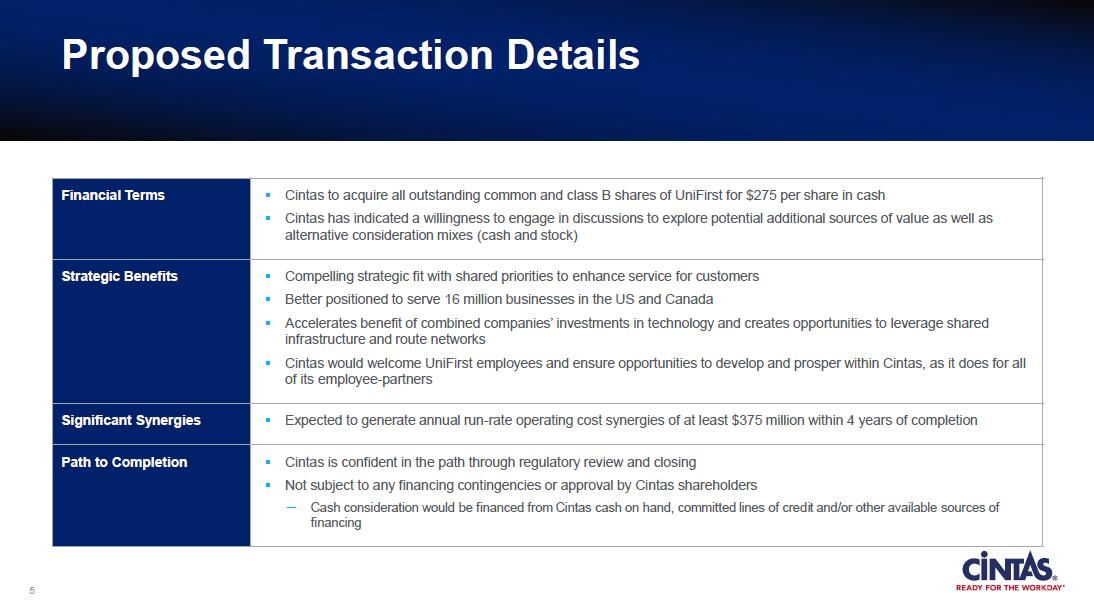 Significant, Immediate and Certain Value for UniFirst Shareholders $210 $190 $170 $ 2 30 $ 2 50 $ 2 70 $ 2 90 $150 1 / 3 /2 0 2 2 5/3/2022 9/3/2022 1/3/2023 5 / 3 /2 0 2 3 1 / 3 /2 0 2 5 9/3/2023 1/3/2024 5/3/2024 9/3/2024 90 Day Average Closing Price ($189.20) CTAS Offer ($275 per share) La s t - C losing $171.28 (1/3/25) Substantial Premium to UniFirst’s Historical and Recent Trading Levels $275 per share all - cash offer delivers certain and immediate value ~$5.3 billion implied transaction value [X]% premium to UniFirst’s 90 - day average closing price as of 1/6/25 UniFirst Stock Price Chart CALLOUTS TO BE UPDATED TO 1/6 CLOSE PRIOR TO RELEASE 4