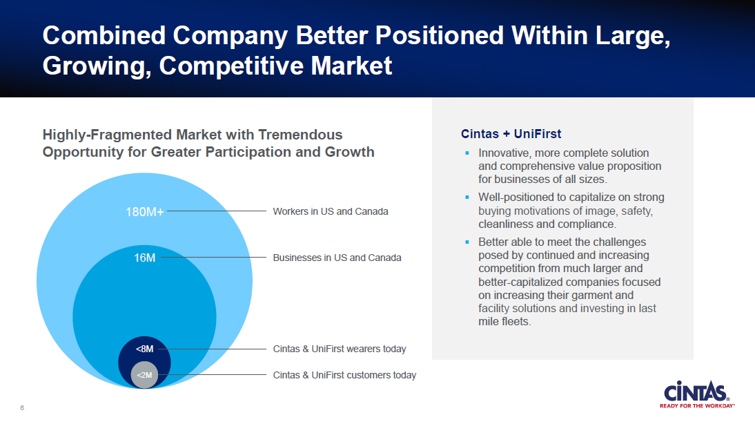 Proposed Transaction Details 5 ▪ Cintas to acquire all outstanding common and class B shares of UniFirst for $275 per share in cash ▪ Cintas has indicated a willingness to engage in discussions to explore potential additional sources of value as well as alternative consideration mixes (cash and stock) Financial Terms ▪ Compelling strategic fit with shared priorities to enhance service for customers ▪ Better positioned to serve 16 million businesses in the US and Canada ▪ Accelerates benefit of combined companies’ investments in technology and creates opportunities to leverage shared infrastructure and route networks ▪ Cintas would welcome UniFirst employees and ensure opportunities to develop and prosper within Cintas, as it does for all of its employee - partners Strategic Benefits ▪ Expected to generate annual run - rate operating cost synergies of at least $375 million within 4 years of completion Significant Synergies ▪ Cintas is confident in the path through regulatory review and closing ▪ Not subject to any financing contingencies or approval by Cintas shareholders — Cash consideration would be financed from Cintas cash on hand, committed lines of credit and/or other available sources of financing Path to Completion