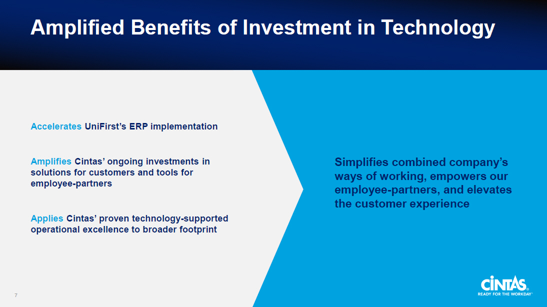 Combined Company Better Positioned Within Large, Growing, Competitive Market Cintas + UniFirst ▪ Innovative, more complete solution and comprehensive value proposition for businesses of all sizes. ▪ Well - positioned to capitalize on strong buying motivations of image, safety, cleanliness and compliance. ▪ Better able to meet the challenges posed by continued and increasing competition from much larger and better - capitalized companies focused on increasing their garment and facility solutions and investing in last mile fleets. Highly - Fragmented Market with Tremendous Opportunity for Greater Participation and Growth Businesses in US and Canada Cintas & UniFirst wearers today Cintas & UniFirst customers today Workers in US and Canada 16M 6 < 8 M < 2 M 180M+