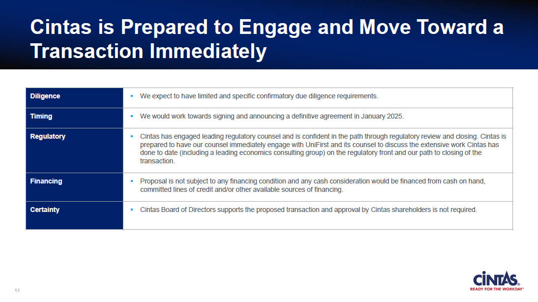 Cintas’ Public Proposal Follows Consistent Lack of Engagement Second time in nearly three years that UniFirst has refused to engage on an extremely compelling offer 10 FEBRUARY 7, 2022 Cintas presents indication of interest to acquire UniFirst for $255/share (the "Prior Proposal"); UniFirst offers no substantive engagement NOVEMBER 8, 2024 Cintas submits Proposal to acquire UniFirst for $275/share; requests response by November 22 NOVEMBER 22, 2024 UniFirst requests more time to review Cintas’ proposal via phone call NOVEMBER 25, 2024 Cintas reiterates proposal and makes request to meet in person during the week of December 2; requests response by November 27 NOVEMBER 27, 2024 UniFirst sends letter rejecting the Proposal DECEMBER 3, 2024 Cintas reiterates Proposal; requests in - person meeting including discussion about potential sources of value that will allow Cintas to increase its offer; requests response by December 6 DECEMBER 9, 2024 UniFirst again sends letter rejecting the Proposal DECEMBER 20, 2024 Cintas reiterates proposal; again requests in - person meeting and notes willingness to increase its Proposal, discuss ways to preserve the UniFirst legacy; requests response by January 3