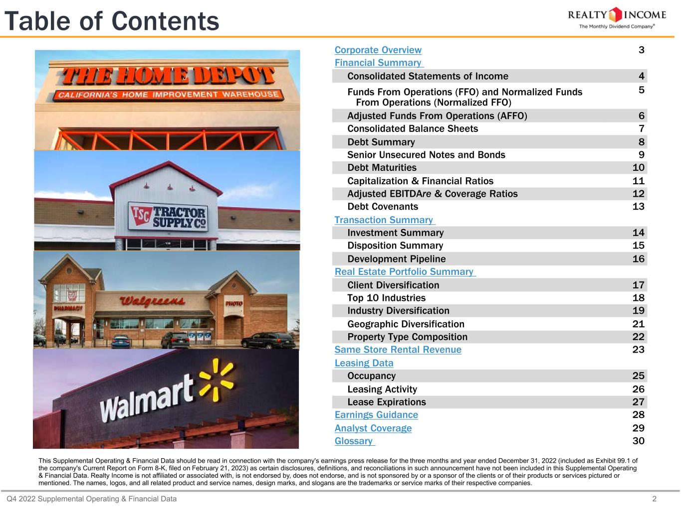 Q4 2022 Supplemental Operating & Financial Data 2 Table of Contents Corporate Overview 3 Financial Summary Consolidated Statements of Income 4 Funds From Operations (FFO) and Normalized Funds From Operations (Normalized FFO) 5 Adjusted Funds From Operations (AFFO) 6 Consolidated Balance Sheets 7 Debt Summary 8 Senior Unsecured Notes and Bonds 9 Debt Maturities 10 Capitalization & Financial Ratios 11 Adjusted EBITDAre & Coverage Ratios 12 Debt Covenants 13 Transaction Summary Investment Summary 14 Disposition Summary 15 Development Pipeline 16 Real Estate Portfolio Summary Client Diversification 17 Top 10 Industries 18 Industry Diversification 19 Geographic Diversification 21 Property Type Composition 22 Same Store Rental Revenue 23 Leasing Data Occupancy 25 Leasing Activity 26 Lease Expirations 27 Earnings Guidance 28 Analyst Coverage 29 Glossary 30 This Supplemental Operating & Financial Data should be read in connection with the company's earnings press release for the three months and year ended December 31, 2022 (included as Exhibit 99.1 of the company's Current Report on Form 8-K, filed on February 21, 2023) as certain disclosures, definitions, and reconciliations in such announcement have not been included in this Supplemental Operating & Financial Data. Realty Income is not affiliated or associated with, is not endorsed by, does not endorse, and is not sponsored by or a sponsor of the clients or of their products or services pictured or mentioned. The names, logos, and all related product and service names, design marks, and slogans are the trademarks or service marks of their respective companies.