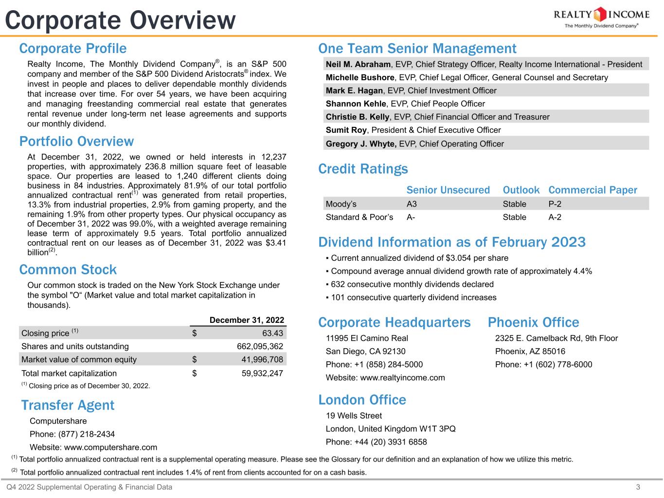 Q4 2022 Supplemental Operating & Financial Data 3 One Team Senior Management Neil M. Abraham, EVP, Chief Strategy Officer, Realty Income International - President Michelle Bushore, EVP, Chief Legal Officer, General Counsel and Secretary Mark E. Hagan, EVP, Chief Investment Officer Shannon Kehle, EVP, Chief People Officer Christie B. Kelly, EVP, Chief Financial Officer and Treasurer Sumit Roy, President & Chief Executive Officer Gregory J. Whyte, EVP, Chief Operating Officer Credit Ratings Senior Unsecured Outlook Commercial Paper Moody’s A3 Stable P-2 Standard & Poor’s A- Stable A-2 Dividend Information as of February 2023 ▪ Current annualized dividend of $3.054 per share ▪ Compound average annual dividend growth rate of approximately 4.4% ▪ 632 consecutive monthly dividends declared ▪ 101 consecutive quarterly dividend increases Corporate Headquarters Phoenix Office 11995 El Camino Real 2325 E. Camelback Rd, 9th Floor San Diego, CA 92130 Phoenix, AZ 85016 Phone: +1 (858) 284-5000 Phone: +1 (602) 778-6000 Website: www.realtyincome.com London Office 19 Wells Street London, United Kingdom W1T 3PQ Phone: +44 (20) 3931 6858 Corporate Overview Transfer Agent Computershare Phone: (877) 218-2434 Website: www.computershare.com (1) Total portfolio annualized contractual rent is a supplemental operating measure. Please see the Glossary for our definition and an explanation of how we utilize this metric. (2) Total portfolio annualized contractual rent includes 1.4% of rent from clients accounted for on a cash basis. December 31, 2022 Closing price (1) $ 63.43 Shares and units outstanding 662,095,362 Market value of common equity $ 41,996,708 Total market capitalization $ 59,932,247 (1) Closing price as of December 30, 2022. Corporate Profile Realty Income, The Monthly Dividend Company®, is an S&P 500 company and member of the S&P 500 Dividend Aristocrats® index. We invest in people and places to deliver dependable monthly dividends that increase over time. For over 54 years, we have been acquiring and managing freestanding commercial real estate that generates rental revenue under long-term net lease agreements and supports our monthly dividend. Portfolio Overview At December 31, 2022, we owned or held interests in 12,237 properties, with approximately 236.8 million square feet of leasable space. Our properties are leased to 1,240 different clients doing business in 84 industries. Approximately 81.9% of our total portfolio annualized contractual rent(1) was generated from retail properties, 13.3% from industrial properties, 2.9% from gaming property, and the remaining 1.9% from other property types. Our physical occupancy as of December 31, 2022 was 99.0%, with a weighted average remaining lease term of approximately 9.5 years. Total portfolio annualized contractual rent on our leases as of December 31, 2022 was $3.41 billion(2). Common Stock Our common stock is traded on the New York Stock Exchange under the symbol "O“ (Market value and total market capitalization in thousands).