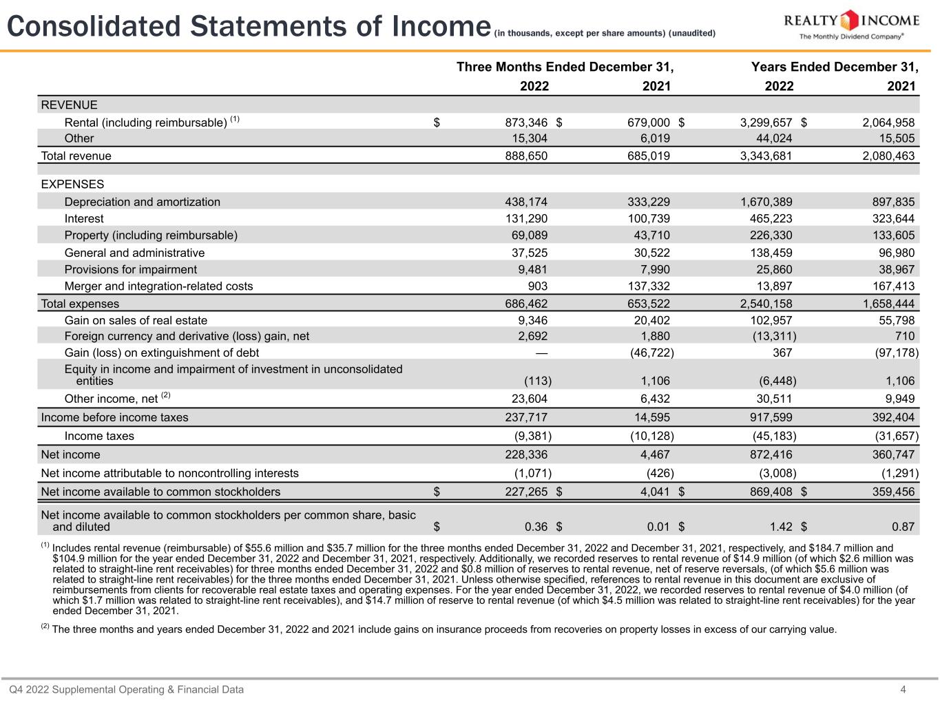 Q4 2022 Supplemental Operating & Financial Data 4 Three Months Ended December 31, Years Ended December 31, 2022 2021 2022 2021 REVENUE Rental (including reimbursable) (1) $ 873,346 $ 679,000 $ 3,299,657 $ 2,064,958 Other 15,304 6,019 44,024 15,505 Total revenue 888,650 685,019 3,343,681 2,080,463 EXPENSES Depreciation and amortization 438,174 333,229 1,670,389 897,835 Interest 131,290 100,739 465,223 323,644 Property (including reimbursable) 69,089 43,710 226,330 133,605 General and administrative 37,525 30,522 138,459 96,980 Provisions for impairment 9,481 7,990 25,860 38,967 Merger and integration-related costs 903 137,332 13,897 167,413 Total expenses 686,462 653,522 2,540,158 1,658,444 Gain on sales of real estate 9,346 20,402 102,957 55,798 Foreign currency and derivative (loss) gain, net 2,692 1,880 (13,311) 710 Gain (loss) on extinguishment of debt — (46,722) 367 (97,178) Equity in income and impairment of investment in unconsolidated entities (113) 1,106 (6,448) 1,106 Other income, net (2) 23,604 6,432 30,511 9,949 Income before income taxes 237,717 14,595 917,599 392,404 Income taxes (9,381) (10,128) (45,183) (31,657) Net income 228,336 4,467 872,416 360,747 Net income attributable to noncontrolling interests (1,071) (426) (3,008) (1,291) Net income available to common stockholders $ 227,265 $ 4,041 $ 869,408 $ 359,456 Net income available to common stockholders per common share, basic and diluted $ 0.36 $ 0.01 $ 1.42 $ 0.87 (1) Includes rental revenue (reimbursable) of $55.6 million and $35.7 million for the three months ended December 31, 2022 and December 31, 2021, respectively, and $184.7 million and $104.9 million for the year ended December 31, 2022 and December 31, 2021, respectively. Additionally, we recorded reserves to rental revenue of $14.9 million (of which $2.6 million was related to straight-line rent receivables) for three months ended December 31, 2022 and $0.8 million of reserves to rental revenue, net of reserve reversals, (of which $5.6 million was related to straight-line rent receivables) for the three months ended December 31, 2021. Unless otherwise specified, references to rental revenue in this document are exclusive of reimbursements from clients for recoverable real estate taxes and operating expenses. For the year ended December 31, 2022, we recorded reserves to rental revenue of $4.0 million (of which $1.7 million was related to straight-line rent receivables), and $14.7 million of reserve to rental revenue (of which $4.5 million was related to straight-line rent receivables) for the year ended December 31, 2021. (2) The three months and years ended December 31, 2022 and 2021 include gains on insurance proceeds from recoveries on property losses in excess of our carrying value. Consolidated Statements of Income (in thousands, except per share amounts) (unaudited)