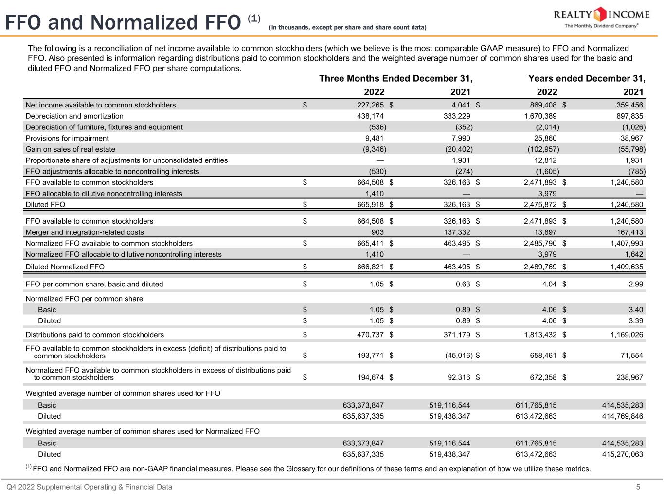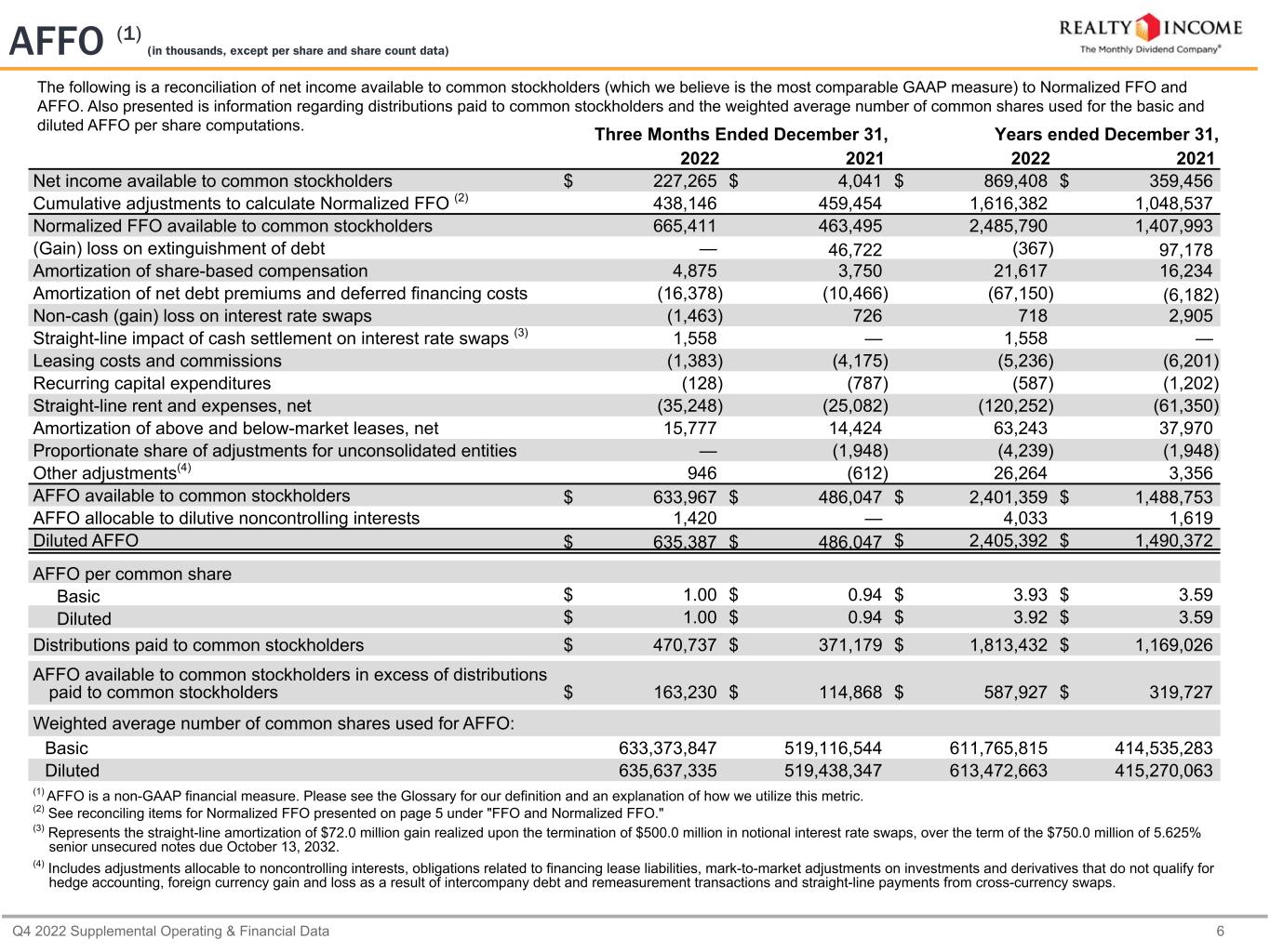 Q4 2022 Supplemental Operating & Financial Data 6 The following is a reconciliation of net income available to common stockholders (which we believe is the most comparable GAAP measure) to Normalized FFO and AFFO. Also presented is information regarding distributions paid to common stockholders and the weighted average number of common shares used for the basic and diluted AFFO per share computations. Three Months Ended December 31, Years ended December 31, 2022 2021 2022 2021 Net income available to common stockholders $ 227,265 $ 4,041 $ 869,408 $ 359,456 Cumulative adjustments to calculate Normalized FFO (2) 438,146 459,454 1,616,382 1,048,537 Normalized FFO available to common stockholders 665,411 463,495 2,485,790 1,407,993 (Gain) loss on extinguishment of debt — 46,722 (367) 97,178 Amortization of share-based compensation 4,875 3,750 21,617 16,234 Amortization of net debt premiums and deferred financing costs (16,378) (10,466) (67,150) (6,182) Non-cash (gain) loss on interest rate swaps (1,463) 726 718 2,905 Straight-line impact of cash settlement on interest rate swaps (3) 1,558 — 1,558 — Leasing costs and commissions (1,383) (4,175) (5,236) (6,201) Recurring capital expenditures (128) (787) (587) (1,202) Straight-line rent and expenses, net (35,248) (25,082) (120,252) (61,350) Amortization of above and below-market leases, net 15,777 14,424 63,243 37,970 Proportionate share of adjustments for unconsolidated entities — (1,948) (4,239) (1,948) Other adjustments(4) 946 (612) 26,264 3,356 AFFO available to common stockholders $ 633,967 $ 486,047 $ 2,401,359 $ 1,488,753 AFFO allocable to dilutive noncontrolling interests 1,420 — 4,033 1,619 Diluted AFFO $ 635,387 $ 486,047 $ 2,405,392 $ 1,490,372 AFFO per common share Basic $ 1.00 $ 0.94 $ 3.93 $ 3.59 Diluted $ 1.00 $ 0.94 $ 3.92 $ 3.59 Distributions paid to common stockholders $ 470,737 $ 371,179 $ 1,813,432 $ 1,169,026 AFFO available to common stockholders in excess of distributions paid to common stockholders $ 163,230 $ 114,868 $ 587,927 $ 319,727 Weighted average number of common shares used for AFFO: Basic 633,373,847 519,116,544 611,765,815 414,535,283 Diluted 635,637,335 519,438,347 613,472,663 415,270,063 (1) AFFO is a non-GAAP financial measure. Please see the Glossary for our definition and an explanation of how we utilize this metric. (2) See reconciling items for Normalized FFO presented on page 5 under "FFO and Normalized FFO." (3) Represents the straight-line amortization of $72.0 million gain realized upon the termination of $500.0 million in notional interest rate swaps, over the term of the $750.0 million of 5.625% senior unsecured notes due October 13, 2032. (4) Includes adjustments allocable to noncontrolling interests, obligations related to financing lease liabilities, mark-to-market adjustments on investments and derivatives that do not qualify for hedge accounting, foreign currency gain and loss as a result of intercompany debt and remeasurement transactions and straight-line payments from cross-currency swaps. AFFO (1) (in thousands, except per share and share count data)
