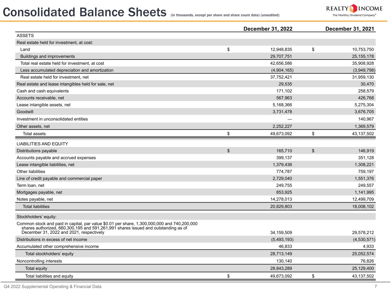 Q4 2022 Supplemental Operating & Financial Data 7 Consolidated Balance Sheets (in thousands, except per share and share count data) (unaudited) December 31, 2022 December 31, 2021 ASSETS Real estate held for investment, at cost: Land $ 12,948,835 $ 10,753,750 Buildings and improvements 29,707,751 25,155,178 Total real estate held for investment, at cost 42,656,586 35,908,928 Less accumulated depreciation and amortization (4,904,165) (3,949,798) Real estate held for investment, net 37,752,421 31,959,130 Real estate and lease intangibles held for sale, net 29,535 30,470 Cash and cash equivalents 171,102 258,579 Accounts receivable, net 567,963 426,768 Lease intangible assets, net 5,168,366 5,275,304 Goodwill 3,731,478 3,676,705 Investment in unconsolidated entities — 140,967 Other assets, net 2,252,227 1,369,579 Total assets $ 49,673,092 $ 43,137,502 LIABILITIES AND EQUITY Distributions payable $ 165,710 $ 146,919 Accounts payable and accrued expenses 399,137 351,128 Lease intangible liabilities, net 1,379,436 1,308,221 Other liabilities 774,787 759,197 Line of credit payable and commercial paper 2,729,040 1,551,376 Term loan, net 249,755 249,557 Mortgages payable, net 853,925 1,141,995 Notes payable, net 14,278,013 12,499,709 Total liabilities 20,829,803 18,008,102 Stockholders’ equity: Common stock and paid in capital, par value $0.01 per share, 1,300,000,000 and 740,200,000 shares authorized, 660,300,195 and 591,261,991 shares issued and outstanding as of December 31, 2022 and 2021, respectively 34,159,509 29,578,212 Distributions in excess of net income (5,493,193) (4,530,571) Accumulated other comprehensive income 46,833 4,933 Total stockholders’ equity 28,713,149 25,052,574 Noncontrolling interests 130,140 76,826 Total equity 28,843,289 25,129,400 Total liabilities and equity $ 49,673,092 $ 43,137,502