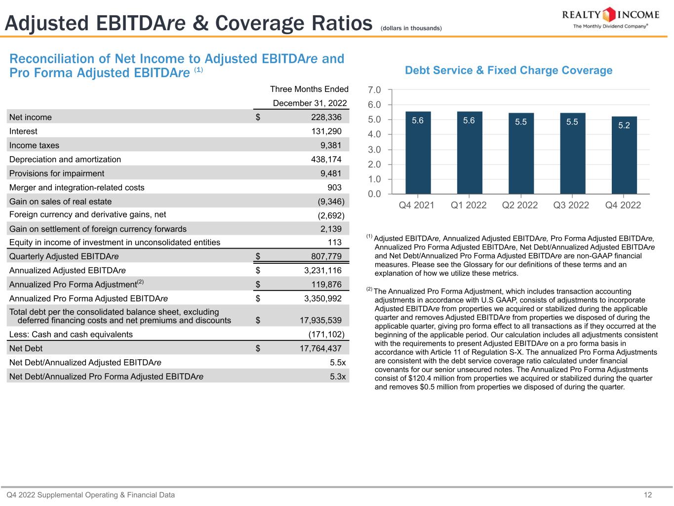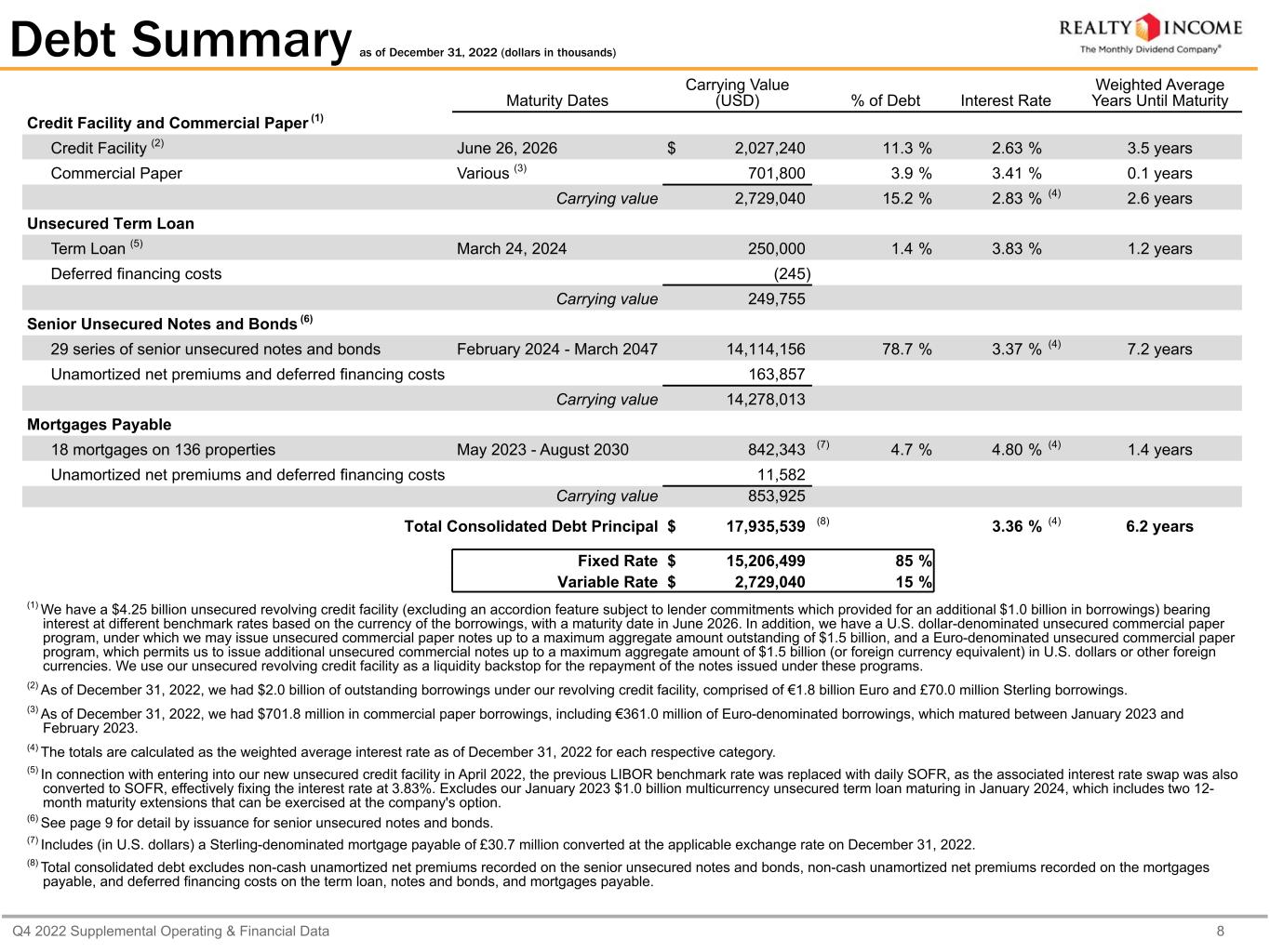 Q4 2022 Supplemental Operating & Financial Data 11 Capitalization & Financial Ratios (dollars in thousands, except as otherwise noted) Cash on Hand $ 171,102 Availability under Credit Facility 2,222,760 Less: Commercial Paper Borrowings (701,800) $ 1,692,062 (5) Liquidity calculation excludes borrowings under the $1.5 billion U.S Dollar- denominated commercial paper program and $1.5 billion Euro-denominated commercial paper program as of December 31, 2022. We use our unsecured revolving credit facility as a liquidity backstop for the repayment of the notes issued under these programs. Principal Debt Balance Credit Facility and Commercial Paper $ 2,729,040 Unsecured Term Loan (1) 250,000 Senior Unsecured Notes and Bonds (2) 14,114,156 Mortgages Payable 842,343 Total Debt $ 17,935,539 Equity Shares/Units Stock Price Market Value Common Stock (NYSE: "O") 660,300,195 $ 63.43 $ 41,882,841 Common Units (3) 1,795,167 $ 63.43 $ 113,867 $ 41,996,708 Total Market Capitalization (4) $ 59,932,247 Debt/Total Market Capitalization (4) 29.9 % (1) Excludes our January 2023 $1.0 billion multicurrency unsecured term loan maturing in January 2024, which includes two 12-month maturity extensions that can be exercised at the company's option. (2) Excludes our January 2023 issuances of $500 million of senior unsecured notes due January 2026, which are callable at par on January 13, 2024, and $600 million of senior unsecured notes due March 2030, which are callable at par on January 15, 2030. (3) Consists of common units issued by Realty Income Limited Partnership and held by third parties. (4) Our enterprise value was $59,761,145 (total market capitalization less cash and cash equivalents as of December 31, 2022). The percentage for debt to enterprise value is materially consistent with that presented for total market capitalization. Dividend Data 2022 2021 Year-over-Year Growth Rate Common Dividend Paid per Share $ 2.9670 $ 2.8330 4.7 % AFFO per Share (diluted) $ 3.92 $ 3.59 9.2 % AFFO Payout Ratio 75.7 % 78.9 % Liquidity as of December 31, 2022 (5) Capitalization as of December 31, 2022 Capital Structure as of December 31, 2022 Common Stock 70.1% Debt 29.9%