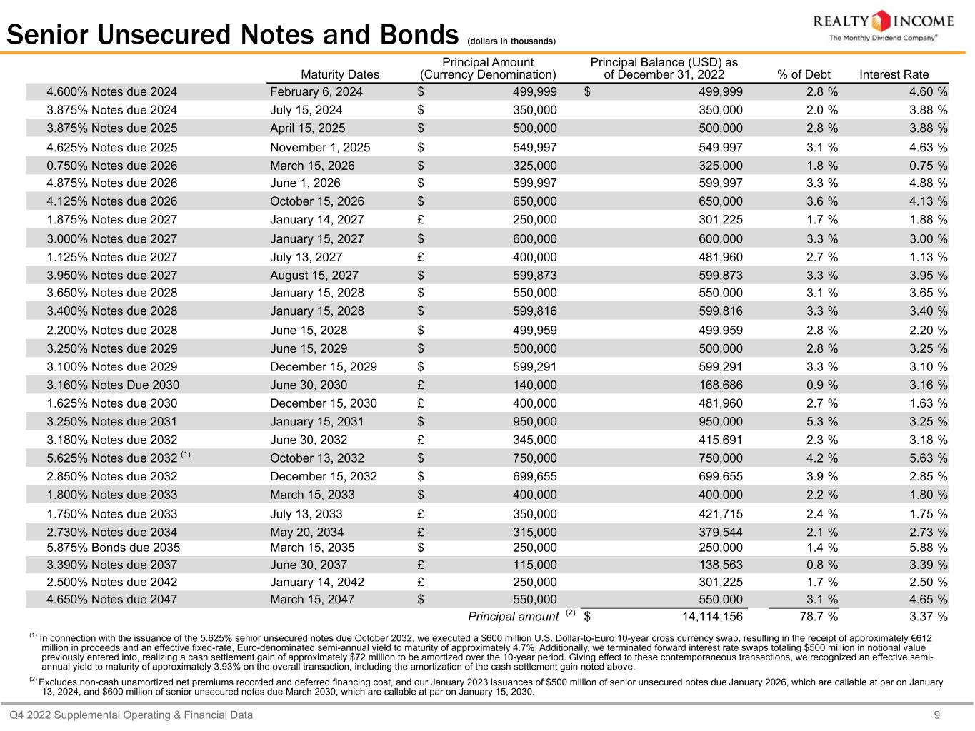 Q4 2022 Supplemental Operating & Financial Data 8 Debt Summary as of December 31, 2022 (dollars in thousands) Maturity Dates Carrying Value (USD) % of Debt Interest Rate Weighted Average Years Until Maturity Credit Facility and Commercial Paper (1) Credit Facility (2) June 26, 2026 $ 2,027,240 11.3 % 2.63 % 3.5 years Commercial Paper Various (3) 701,800 3.9 % 3.41 % 0.1 years Carrying value 2,729,040 15.2 % 2.83 % (4) 2.6 years Unsecured Term Loan Term Loan (5) March 24, 2024 250,000 1.4 % 3.83 % 1.2 years Deferred financing costs (245) Carrying value 249,755 Senior Unsecured Notes and Bonds (6) 29 series of senior unsecured notes and bonds February 2024 - March 2047 14,114,156 78.7 % 3.37 % (4) 7.2 years Unamortized net premiums and deferred financing costs 163,857 Carrying value 14,278,013 Mortgages Payable 18 mortgages on 136 properties May 2023 - August 2030 842,343 (7) 4.7 % 4.80 % (4) 1.4 years Unamortized net premiums and deferred financing costs 11,582 Carrying value 853,925 Total Consolidated Debt Principal $ 17,935,539 (8) 3.36 % (4) 6.2 years Fixed Rate $ 15,206,499 85 % Variable Rate $ 2,729,040 15 % (1) We have a $4.25 billion unsecured revolving credit facility (excluding an accordion feature subject to lender commitments which provided for an additional $1.0 billion in borrowings) bearing interest at different benchmark rates based on the currency of the borrowings, with a maturity date in June 2026. In addition, we have a U.S. dollar-denominated unsecured commercial paper program, under which we may issue unsecured commercial paper notes up to a maximum aggregate amount outstanding of $1.5 billion, and a Euro-denominated unsecured commercial paper program, which permits us to issue additional unsecured commercial notes up to a maximum aggregate amount of $1.5 billion (or foreign currency equivalent) in U.S. dollars or other foreign currencies. We use our unsecured revolving credit facility as a liquidity backstop for the repayment of the notes issued under these programs. (2) As of December 31, 2022, we had $2.0 billion of outstanding borrowings under our revolving credit facility, comprised of €1.8 billion Euro and £70.0 million Sterling borrowings. (3) As of December 31, 2022, we had $701.8 million in commercial paper borrowings, including €361.0 million of Euro-denominated borrowings, which matured between January 2023 and February 2023. (4) The totals are calculated as the weighted average interest rate as of December 31, 2022 for each respective category. (5) In connection with entering into our new unsecured credit facility in April 2022, the previous LIBOR benchmark rate was replaced with daily SOFR, as the associated interest rate swap was also converted to SOFR, effectively fixing the interest rate at 3.83%. Excludes our January 2023 $1.0 billion multicurrency unsecured term loan maturing in January 2024, which includes two 12- month maturity extensions that can be exercised at the company's option. (6) See page 9 for detail by issuance for senior unsecured notes and bonds. (7) Includes (in U.S. dollars) a Sterling-denominated mortgage payable of £30.7 million converted at the applicable exchange rate on December 31, 2022. (8) Total consolidated debt excludes non-cash unamortized net premiums recorded on the senior unsecured notes and bonds, non-cash unamortized net premiums recorded on the mortgages payable, and deferred financing costs on the term loan, notes and bonds, and mortgages payable.
