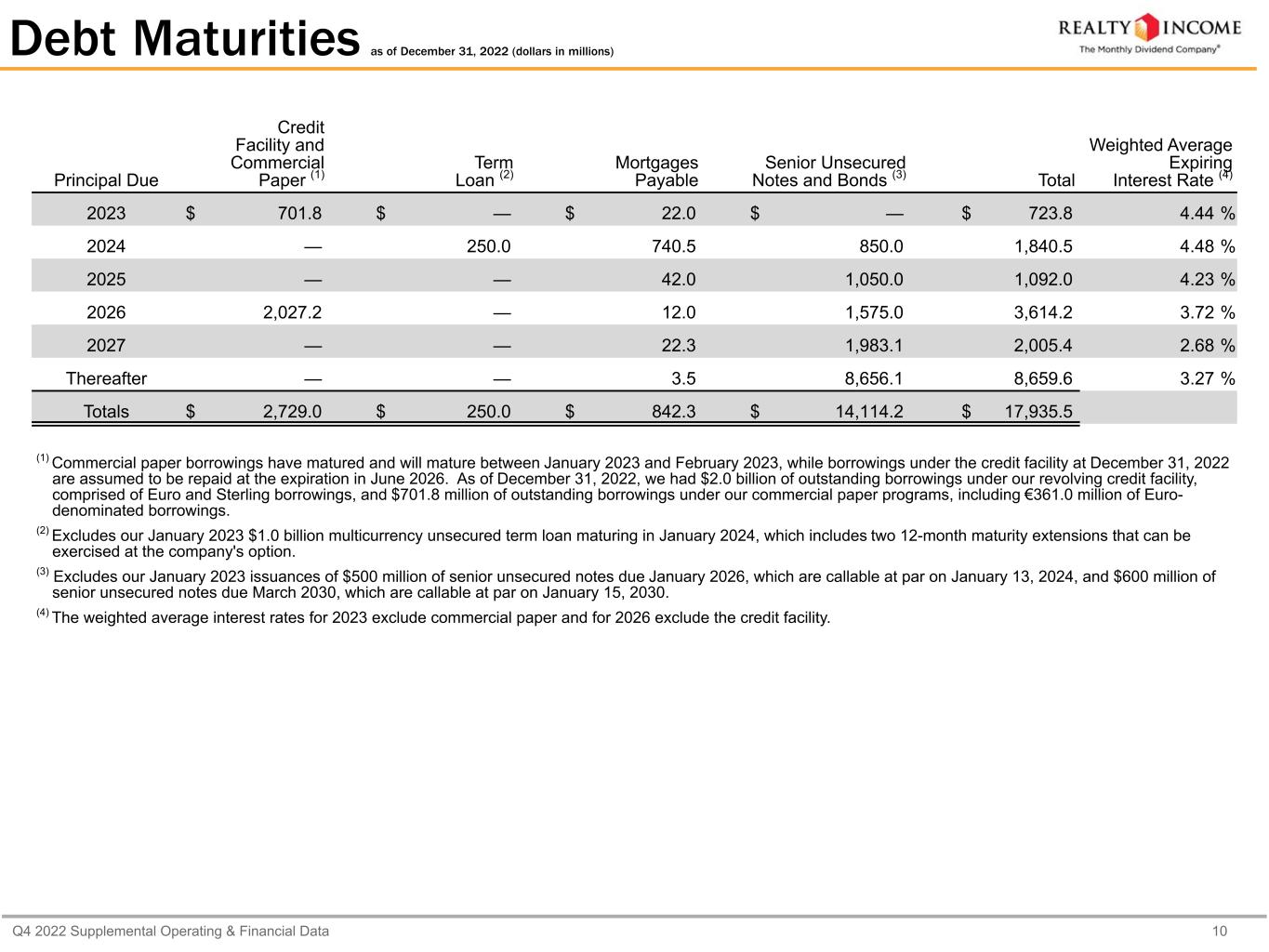 Q4 2022 Supplemental Operating & Financial Data 9 Senior Unsecured Notes and Bonds (dollars in thousands) Maturity Dates Principal Amount (Currency Denomination) Principal Balance (USD) as of December 31, 2022 % of Debt Interest Rate 4.600% Notes due 2024 February 6, 2024 $ 499,999 $ 499,999 2.8 % 4.60 % 3.875% Notes due 2024 July 15, 2024 $ 350,000 350,000 2.0 % 3.88 % 3.875% Notes due 2025 April 15, 2025 $ 500,000 500,000 2.8 % 3.88 % 4.625% Notes due 2025 November 1, 2025 $ 549,997 549,997 3.1 % 4.63 % 0.750% Notes due 2026 March 15, 2026 $ 325,000 325,000 1.8 % 0.75 % 4.875% Notes due 2026 June 1, 2026 $ 599,997 599,997 3.3 % 4.88 % 4.125% Notes due 2026 October 15, 2026 $ 650,000 650,000 3.6 % 4.13 % 1.875% Notes due 2027 January 14, 2027 £ 250,000 301,225 1.7 % 1.88 % 3.000% Notes due 2027 January 15, 2027 $ 600,000 600,000 3.3 % 3.00 % 1.125% Notes due 2027 July 13, 2027 £ 400,000 481,960 2.7 % 1.13 % 3.950% Notes due 2027 August 15, 2027 $ 599,873 599,873 3.3 % 3.95 % 3.650% Notes due 2028 January 15, 2028 $ 550,000 550,000 3.1 % 3.65 % 3.400% Notes due 2028 January 15, 2028 $ 599,816 599,816 3.3 % 3.40 % 2.200% Notes due 2028 June 15, 2028 $ 499,959 499,959 2.8 % 2.20 % 3.250% Notes due 2029 June 15, 2029 $ 500,000 500,000 2.8 % 3.25 % 3.100% Notes due 2029 December 15, 2029 $ 599,291 599,291 3.3 % 3.10 % 3.160% Notes Due 2030 June 30, 2030 £ 140,000 168,686 0.9 % 3.16 % 1.625% Notes due 2030 December 15, 2030 £ 400,000 481,960 2.7 % 1.63 % 3.250% Notes due 2031 January 15, 2031 $ 950,000 950,000 5.3 % 3.25 % 3.180% Notes due 2032 June 30, 2032 £ 345,000 415,691 2.3 % 3.18 % 5.625% Notes due 2032 (1) October 13, 2032 $ 750,000 750,000 4.2 % 5.63 % 2.850% Notes due 2032 December 15, 2032 $ 699,655 699,655 3.9 % 2.85 % 1.800% Notes due 2033 March 15, 2033 $ 400,000 400,000 2.2 % 1.80 % 1.750% Notes due 2033 July 13, 2033 £ 350,000 421,715 2.4 % 1.75 % 2.730% Notes due 2034 May 20, 2034 £ 315,000 379,544 2.1 % 2.73 % 5.875% Bonds due 2035 March 15, 2035 $ 250,000 250,000 1.4 % 5.88 % 3.390% Notes due 2037 June 30, 2037 £ 115,000 138,563 0.8 % 3.39 % 2.500% Notes due 2042 January 14, 2042 £ 250,000 301,225 1.7 % 2.50 % 4.650% Notes due 2047 March 15, 2047 $ 550,000 550,000 3.1 % 4.65 % Principal amount (2) $ 14,114,156 78.7 % 3.37 % (1) In connection with the issuance of the 5.625% senior unsecured notes due October 2032, we executed a $600 million U.S. Dollar-to-Euro 10-year cross currency swap, resulting in the receipt of approximately €612 million in proceeds and an effective fixed-rate, Euro-denominated semi-annual yield to maturity of approximately 4.7%. Additionally, we terminated forward interest rate swaps totaling $500 million in notional value previously entered into, realizing a cash settlement gain of approximately $72 million to be amortized over the 10-year period. Giving effect to these contemporaneous transactions, we recognized an effective semi- annual yield to maturity of approximately 3.93% on the overall transaction, including the amortization of the cash settlement gain noted above. (2) Excludes non-cash unamortized net premiums recorded and deferred financing cost, and our January 2023 issuances of $500 million of senior unsecured notes due January 2026, which are callable at par on January 13, 2024, and $600 million of senior unsecured notes due March 2030, which are callable at par on January 15, 2030.