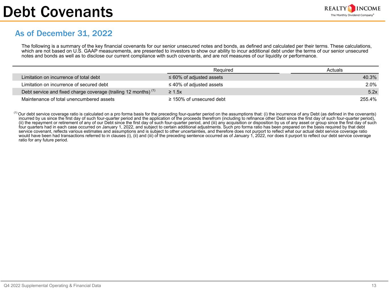 Q4 2022 Supplemental Operating & Financial Data 13 Debt Covenants The following is a summary of the key financial covenants for our senior unsecured notes and bonds, as defined and calculated per their terms. These calculations, which are not based on U.S. GAAP measurements, are presented to investors to show our ability to incur additional debt under the terms of our senior unsecured notes and bonds as well as to disclose our current compliance with such covenants, and are not measures of our liquidity or performance. Required Actuals Limitation on incurrence of total debt ≤ 60% of adjusted assets 40.3% Limitation on incurrence of secured debt ≤ 40% of adjusted assets 2.0% Debt service and fixed charge coverage (trailing 12 months) (1) ≥ 1.5x 5.2x Maintenance of total unencumbered assets ≥ 150% of unsecured debt 255.4% (1) Our debt service coverage ratio is calculated on a pro forma basis for the preceding four-quarter period on the assumptions that: (i) the incurrence of any Debt (as defined in the covenants) incurred by us since the first day of such four-quarter period and the application of the proceeds therefrom (including to refinance other Debt since the first day of such four-quarter period), (ii) the repayment or retirement of any of our Debt since the first day of such four-quarter period, and (iii) any acquisition or disposition by us of any asset or group since the first day of such four quarters had in each case occurred on January 1, 2022, and subject to certain additional adjustments. Such pro forma ratio has been prepared on the basis required by that debt service covenant, reflects various estimates and assumptions and is subject to other uncertainties, and therefore does not purport to reflect what our actual debt service coverage ratio would have been had transactions referred to in clauses (i), (ii) and (iii) of the preceding sentence occurred as of January 1, 2022, nor does it purport to reflect our debt service coverage ratio for any future period. As of December 31, 2022