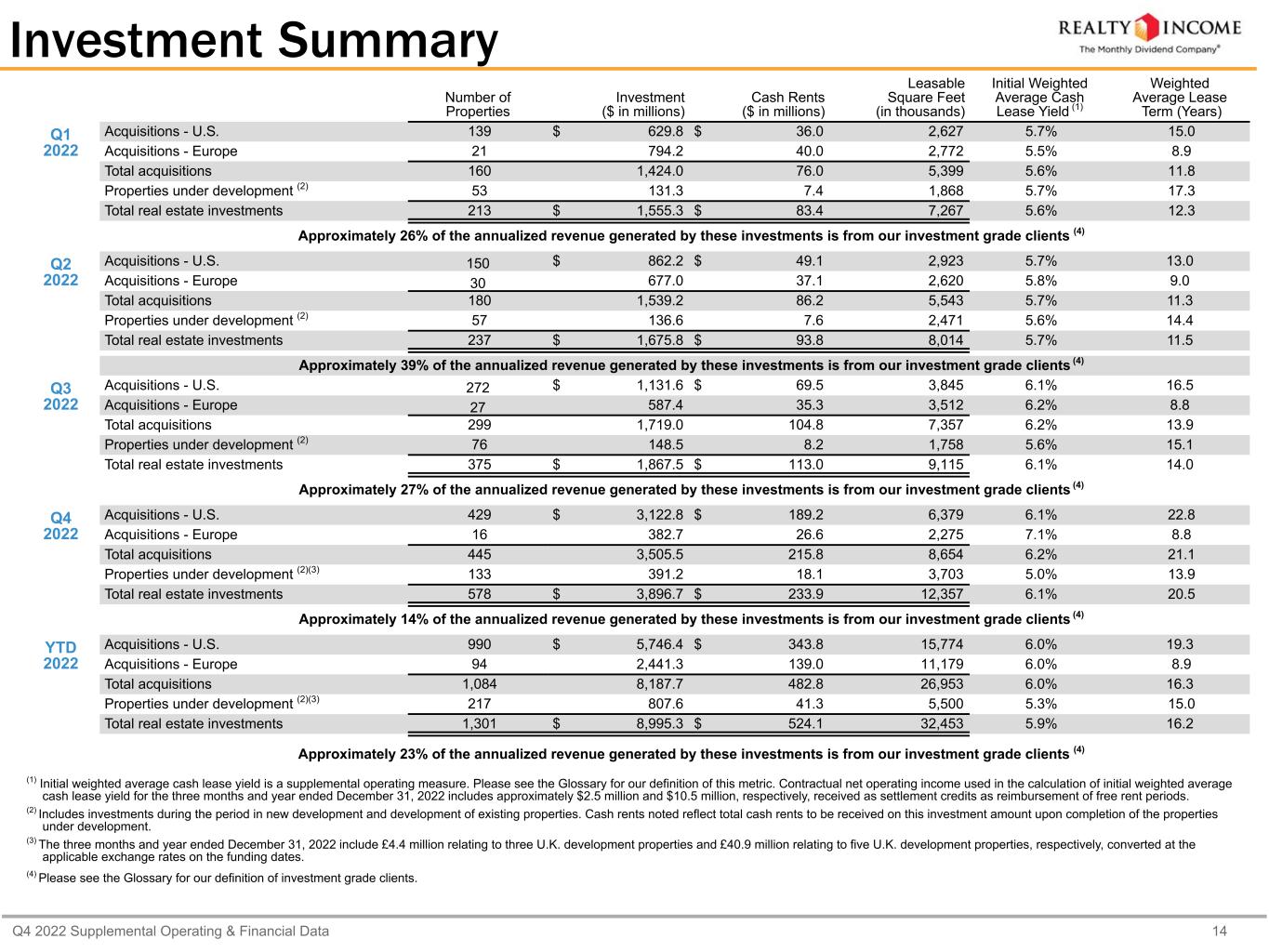 Q4 2022 Supplemental Operating & Financial Data 14 Investment Summary Number of Properties Investment ($ in millions) Cash Rents ($ in millions) Leasable Square Feet (in thousands) Initial Weighted Average Cash Lease Yield (1) Weighted Average Lease Term (Years) Q1 2022 Acquisitions - U.S. 139 $ 629.8 $ 36.0 2,627 5.7% 15.0 Acquisitions - Europe 21 794.2 40.0 2,772 5.5% 8.9 Total acquisitions 160 1,424.0 76.0 5,399 5.6% 11.8 Properties under development (2) 53 131.3 7.4 1,868 5.7% 17.3 Total real estate investments 213 $ 1,555.3 $ 83.4 7,267 5.6% 12.3 Approximately 26% of the annualized revenue generated by these investments is from our investment grade clients (4) Q2 2022 Acquisitions - U.S. 150 $ 862.2 $ 49.1 2,923 5.7% 13.0 Acquisitions - Europe 30 677.0 37.1 2,620 5.8% 9.0 Total acquisitions 180 1,539.2 86.2 5,543 5.7% 11.3 Properties under development (2) 57 136.6 7.6 2,471 5.6% 14.4 Total real estate investments 237 $ 1,675.8 $ 93.8 8,014 5.7% 11.5 Approximately 39% of the annualized revenue generated by these investments is from our investment grade clients (4) Q3 2022 Acquisitions - U.S. 272 $ 1,131.6 $ 69.5 3,845 6.1% 16.5 Acquisitions - Europe 27 587.4 35.3 3,512 6.2% 8.8 Total acquisitions 299 1,719.0 104.8 7,357 6.2% 13.9 Properties under development (2) 76 148.5 8.2 1,758 5.6% 15.1 Total real estate investments 375 $ 1,867.5 $ 113.0 9,115 6.1% 14.0 Approximately 27% of the annualized revenue generated by these investments is from our investment grade clients (4) Q4 2022 Acquisitions - U.S. 429 $ 3,122.8 $ 189.2 6,379 6.1% 22.8 Acquisitions - Europe 16 382.7 26.6 2,275 7.1% 8.8 Total acquisitions 445 3,505.5 215.8 8,654 6.2% 21.1 Properties under development (2)(3) 133 391.2 18.1 3,703 5.0% 13.9 Total real estate investments 578 $ 3,896.7 $ 233.9 12,357 6.1% 20.5 Approximately 14% of the annualized revenue generated by these investments is from our investment grade clients (4) YTD 2022 Acquisitions - U.S. 990 $ 5,746.4 $ 343.8 15,774 6.0% 19.3 Acquisitions - Europe 94 2,441.3 139.0 11,179 6.0% 8.9 Total acquisitions 1,084 8,187.7 482.8 26,953 6.0% 16.3 Properties under development (2)(3) 217 807.6 41.3 5,500 5.3% 15.0 Total real estate investments 1,301 $ 8,995.3 $ 524.1 32,453 5.9% 16.2 Approximately 23% of the annualized revenue generated by these investments is from our investment grade clients (4) (1) Initial weighted average cash lease yield is a supplemental operating measure. Please see the Glossary for our definition of this metric. Contractual net operating income used in the calculation of initial weighted average cash lease yield for the three months and year ended December 31, 2022 includes approximately $2.5 million and $10.5 million, respectively, received as settlement credits as reimbursement of free rent periods. (2) Includes investments during the period in new development and development of existing properties. Cash rents noted reflect total cash rents to be received on this investment amount upon completion of the properties under development. (3) The three months and year ended December 31, 2022 include £4.4 million relating to three U.K. development properties and £40.9 million relating to five U.K. development properties, respectively, converted at the applicable exchange rates on the funding dates. (4) Please see the Glossary for our definition of investment grade clients.