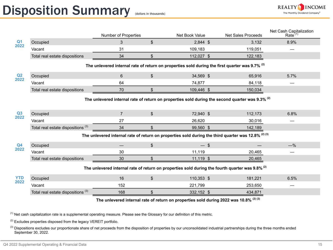 Q4 2022 Supplemental Operating & Financial Data 15 Disposition Summary (dollars in thousands) Number of Properties Net Book Value Net Sales Proceeds Net Cash Capitalization Rate (1) Q1 2022 Occupied 3 $ 2,844 $ 3,132 8.9% Vacant 31 109,183 119,051 — Total real estate dispositions 34 $ 112,027 $ 122,183 The unlevered internal rate of return on properties sold during the first quarter was 9.7% (2) Q2 2022 Occupied 6 $ 34,569 $ 65,916 5.7% Vacant 64 74,877 84,118 — Total real estate dispositions 70 $ 109,446 $ 150,034 The unlevered internal rate of return on properties sold during the second quarter was 9.3% (2) Q3 2022 Occupied 7 $ 72,940 $ 112,173 6.8% Vacant 27 26,620 30,016 — Total real estate dispositions (3) 34 $ 99,560 $ 142,189 The unlevered internal rate of return on properties sold during the third quarter was 12.8% (2) (3) Q4 2022 Occupied — $ — $ — —% Vacant 30 11,119 20,465 — Total real estate dispositions 30 $ 11,119 $ 20,465 The unlevered internal rate of return on properties sold during the fourth quarter was 9.8% (2) YTD 2022 Occupied 16 $ 110,353 $ 181,221 6.5% Vacant 152 221,799 253,650 — Total real estate dispositions (3) 168 $ 332,152 $ 434,871 The unlevered internal rate of return on properties sold during 2022 was 10.8% (2) (3) (1) Net cash capitalization rate is a supplemental operating measure. Please see the Glossary for our definition of this metric. (2) Excludes properties disposed from the legacy VEREIT portfolio. (3) Dispositions excludes our proportionate share of net proceeds from the disposition of properties by our unconsolidated industrial partnerships during the three months ended September 30, 2022.