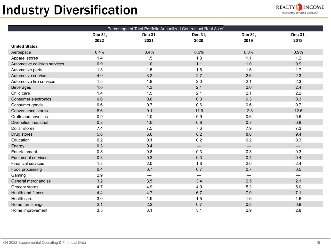 Q4 2022 Supplemental Operating & Financial Data 19 Percentage of Total Portfolio Annualized Contractual Rent As of Dec 31, Dec 31, Dec 31, Dec 31, Dec 31, 2022 2021 2020 2019 2018 United States Aerospace 0.4% 0.4% 0.6% 0.8% 0.9% Apparel stores 1.4 1.5 1.3 1.1 1.2 Automotive collision services 0.9 1.0 1.1 1.0 0.9 Automotive parts 1.3 1.5 1.6 1.6 1.7 Automotive service 4.0 3.2 2.7 2.6 2.3 Automotive tire services 1.5 1.8 2.0 2.1 2.3 Beverages 1.0 1.3 2.1 2.0 2.4 Child care 1.4 1.5 2.1 2.1 2.2 Consumer electronics 0.6 0.6 0.3 0.3 0.3 Consumer goods 0.6 0.7 0.6 0.6 0.7 Convenience stores 8.6 9.1 11.9 12.3 12.6 Crafts and novelties 0.9 1.0 0.9 0.6 0.6 Diversified industrial 0.8 1.0 0.8 0.7 0.8 Dollar stores 7.4 7.5 7.6 7.9 7.3 Drug stores 5.6 6.6 8.2 8.8 9.4 Education 0.2 0.1 0.2 0.2 0.3 Energy 0.3 0.4 — — — Entertainment 0.8 0.8 0.3 0.3 0.3 Equipment services 0.3 0.3 0.3 0.4 0.4 Financial services 1.8 2.0 1.8 2.0 2.4 Food processing 0.4 0.7 0.7 0.7 0.5 Gaming 2.9 — — — — General merchandise 3.2 3.5 3.4 2.5 2.1 Grocery stores 4.7 4.9 4.9 5.2 5.0 Health and fitness 4.4 4.7 6.7 7.0 7.1 Health care 3.0 1.9 1.5 1.6 1.6 Home furnishings 2.1 2.2 0.7 0.8 0.8 Home improvement 3.5 3.1 3.1 2.9 2.8 Industry Diversification
