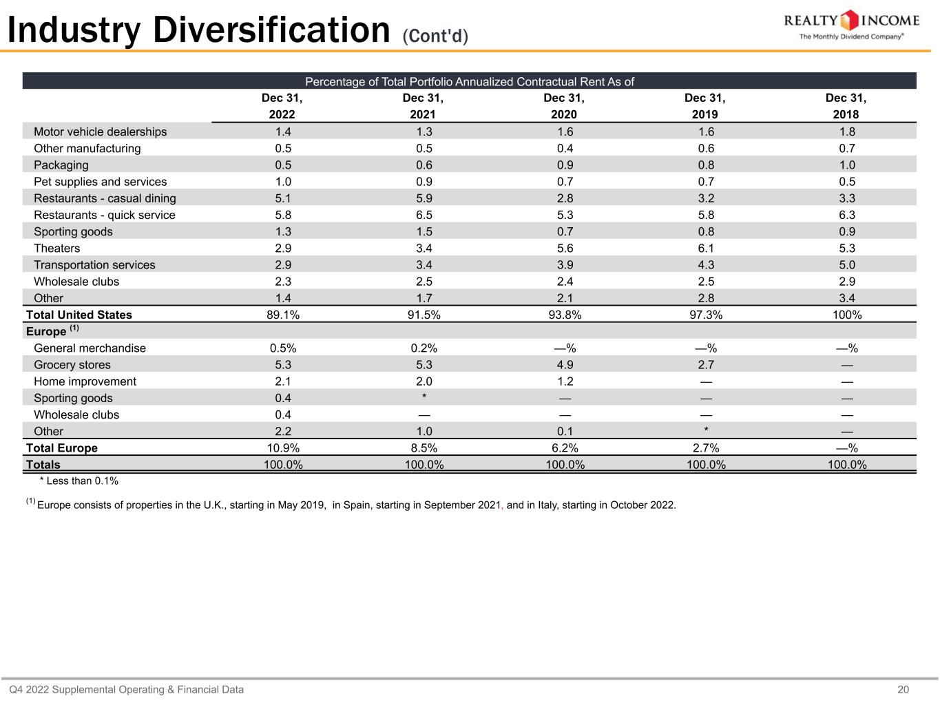 Q4 2022 Supplemental Operating & Financial Data 18 (1)Top 10 Industries Percentage of Total Portfolio Annualized Contractual Rent As of Dec 31, Dec 31, Dec 31, Dec 31, Dec 31, 2022 2021 2020 2019 2018 Grocery stores 10.0% 10.2% 9.8% 7.9% 5.0% Convenience stores 8.6 9.1 11.9 12.3 12.6 Dollar stores 7.4 7.5 7.6 7.9 7.3 Restaurants - quick service 6.0 6.6 5.3 5.8 6.3 Drug stores 5.7 6.6 8.2 8.8 9.4 Home improvement 5.6 5.1 4.3 2.9 2.8 Restaurants - casual dining 5.1 5.9 2.8 3.2 3.3 Health and fitness 4.4 4.7 6.7 7.0 7.1 Automotive service 4.0 3.2 2.7 2.6 2.2 General merchandise 3.7 3.7 3.4 2.5 2.1 (1) The presentation of Top 10 Industries combines total portfolio contractual rent from the U.S. and Europe. Europe consists of properties in the U.K., starting in May 2019, and Spain, starting in September 2021, and in Italy, starting in October 2022. Certain of the Top 10 Industries include both U.S. and Europe percentages for which the Europe percentages are included in the 'Europe- other' classification in the Industry Diversification table beginning on page 19.
