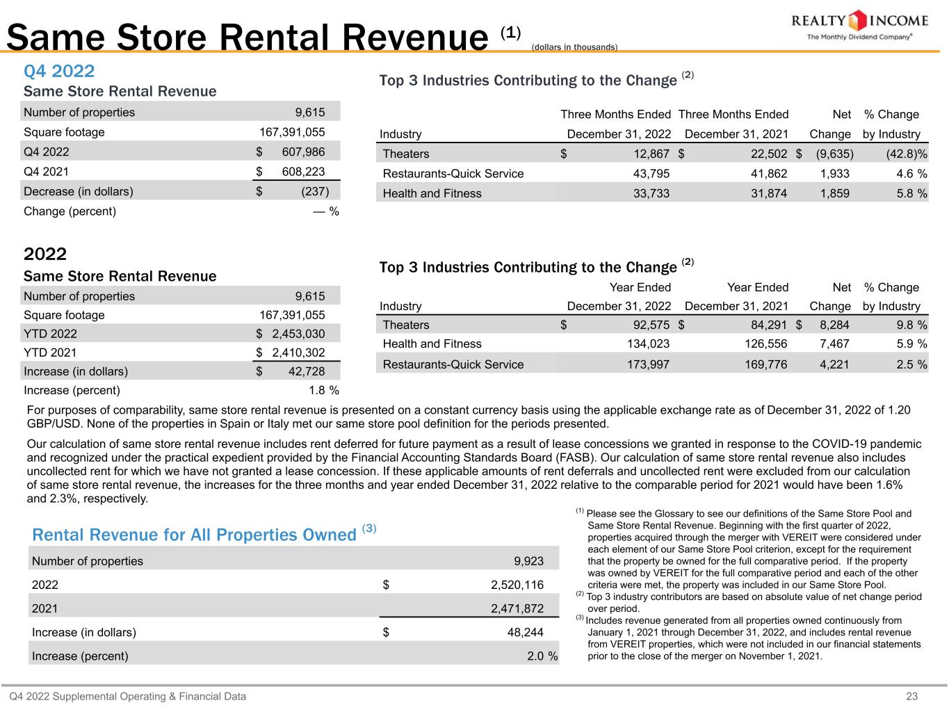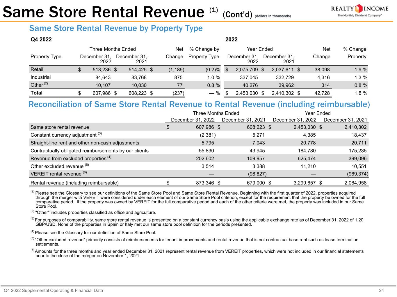Q4 2022 Supplemental Operating & Financial Data 23 Q4 2022 Same Store Rental Revenue Number of properties 9,615 Square footage 167,391,055 Q4 2022 $ 607,986 Q4 2021 $ 608,223 Decrease (in dollars) $ (237) Change (percent) — % 2022 Same Store Rental Revenue Number of properties 9,615 Square footage 167,391,055 YTD 2022 $ 2,453,030 YTD 2021 $ 2,410,302 Increase (in dollars) $ 42,728 Increase (percent) 1.8 % Same Store Rental Revenue (1) (dollars in thousands) Top 3 Industries Contributing to the Change (2) Three Months Ended Three Months Ended Net % Change Industry December 31, 2022 December 31, 2021 Change by Industry Theaters $ 12,867 $ 22,502 $ (9,635) (42.8) % Restaurants-Quick Service 43,795 41,862 1,933 4.6 % Health and Fitness 33,733 31,874 1,859 5.8 % Top 3 Industries Contributing to the Change (2) Year Ended Year Ended Net % Change Industry December 31, 2022 December 31, 2021 Change by Industry Theaters $ 92,575 $ 84,291 $ 8,284 9.8 % Health and Fitness 134,023 126,556 7,467 5.9 % Restaurants-Quick Service 173,997 169,776 4,221 2.5 % For purposes of comparability, same store rental revenue is presented on a constant currency basis using the applicable exchange rate as of December 31, 2022 of 1.20 GBP/USD. None of the properties in Spain or Italy met our same store pool definition for the periods presented. Our calculation of same store rental revenue includes rent deferred for future payment as a result of lease concessions we granted in response to the COVID-19 pandemic and recognized under the practical expedient provided by the Financial Accounting Standards Board (FASB). Our calculation of same store rental revenue also includes uncollected rent for which we have not granted a lease concession. If these applicable amounts of rent deferrals and uncollected rent were excluded from our calculation of same store rental revenue, the increases for the three months and year ended December 31, 2022 relative to the comparable period for 2021 would have been 1.6% and 2.3%, respectively. (1) Please see the Glossary to see our definitions of the Same Store Pool and Same Store Rental Revenue. Beginning with the first quarter of 2022, properties acquired through the merger with VEREIT were considered under each element of our Same Store Pool criterion, except for the requirement that the property be owned for the full comparative period. If the property was owned by VEREIT for the full comparative period and each of the other criteria were met, the property was included in our Same Store Pool. (2) Top 3 industry contributors are based on absolute value of net change period over period. (3) Includes revenue generated from all properties owned continuously from January 1, 2021 through December 31, 2022, and includes rental revenue from VEREIT properties, which were not included in our financial statements prior to the close of the merger on November 1, 2021. Rental Revenue for All Properties Owned (3) Number of properties 9,923 2022 $ 2,520,116 2021 2,471,872 Increase (in dollars) $ 48,244 Increase (percent) 2.0 %