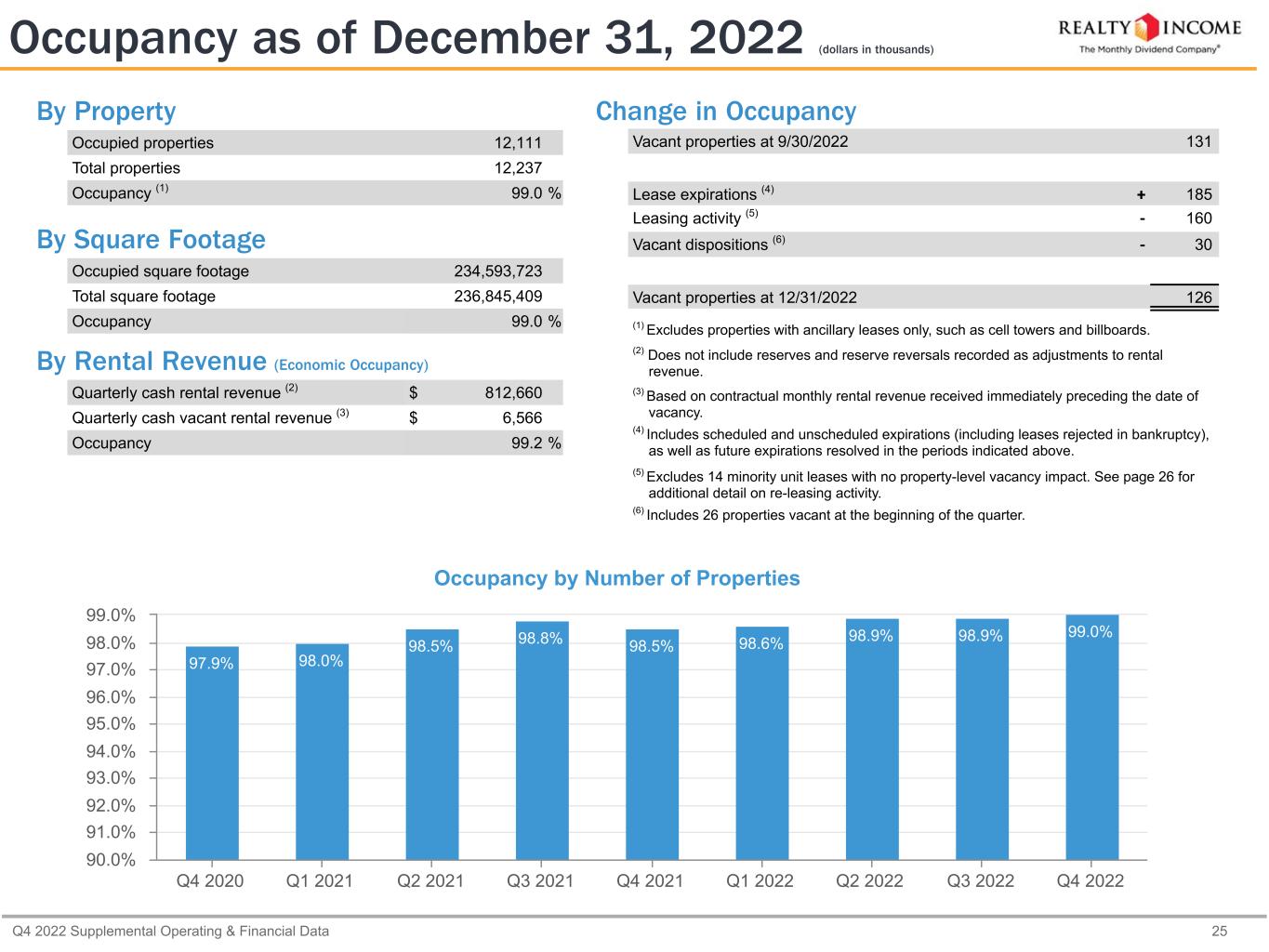 Q4 2022 Supplemental Operating & Financial Data 24 Same Store Rental Revenue (1) (Cont'd) (dollars in thousands) Q4 2022 2022 Three Months Ended Net % Change by Year Ended Net % Change Property Type December 31, 2022 December 31, 2021 Change Property Type December 31, 2022 December 31, 2021 Change Property Retail $ 513,236 $ 514,425 $ (1,189) (0.2)% $ 2,075,709 $ 2,037,611 $ 38,098 1.9 % Industrial 84,643 83,768 875 1.0 % 337,045 332,729 4,316 1.3 % Other (2) 10,107 10,030 77 0.8 % 40,276 39,962 314 0.8 % Total $ 607,986 $ 608,223 $ (237) — % $ 2,453,030 $ 2,410,302 $ 42,728 1.8 % Same Store Rental Revenue by Property Type Reconciliation of Same Store Rental Revenue to Rental Revenue (including reimbursable) Three Months Ended Year Ended December 31, 2022 December 31, 2021 December 31, 2022 December 31, 2021 Same store rental revenue $ 607,986 $ 608,223 $ 2,453,030 $ 2,410,302 Constant currency adjustment (3) (2,381) 5,271 4,385 18,437 Straight-line rent and other non-cash adjustments 5,795 7,043 20,778 20,711 Contractually obligated reimbursements by our clients 55,830 43,945 184,780 175,235 Revenue from excluded properties (4) 202,602 109,957 625,474 399,096 Other excluded revenue (5) 3,514 3,388 11,210 10,551 VEREIT rental revenue (6) — (98,827) — (969,374) Rental revenue (including reimbursable) $ 873,346 $ 679,000 $ 3,299,657 $ 2,064,958 (1) Please see the Glossary to see our definitions of the Same Store Pool and Same Store Rental Revenue. Beginning with the first quarter of 2022, properties acquired through the merger with VEREIT were considered under each element of our Same Store Pool criterion, except for the requirement that the property be owned for the full comparative period. If the property was owned by VEREIT for the full comparative period and each of the other criteria were met, the property was included in our Same Store Pool. (2) "Other" includes properties classified as office and agriculture. (3) For purposes of comparability, same store rental revenue is presented on a constant currency basis using the applicable exchange rate as of December 31, 2022 of 1.20 GBP/USD. None of the properties in Spain or Italy met our same store pool definition for the periods presented. (4) Please see the Glossary for our definition of Same Store Pool. (5) "Other excluded revenue" primarily consists of reimbursements for tenant improvements and rental revenue that is not contractual base rent such as lease termination settlements. (6) Amounts for the three months and year ended December 31, 2021 represent rental revenue from VEREIT properties, which were not included in our financial statements prior to the close of the merger on November 1, 2021.