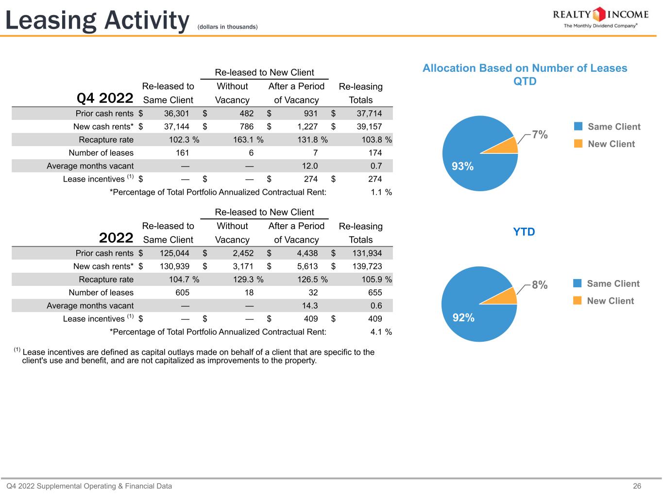 Q4 2022 Supplemental Operating & Financial Data 25 By Property Occupied properties 12,111 Total properties 12,237 Occupancy (1) 99.0 % By Square Footage Occupied square footage 234,593,723 Total square footage 236,845,409 Occupancy 99.0 % By Rental Revenue (Economic Occupancy) Quarterly cash rental revenue (2) $ 812,660 Quarterly cash vacant rental revenue (3) $ 6,566 Occupancy 99.2 % Change in Occupancy Vacant properties at 9/30/2022   131 Lease expirations (4) + 185 Leasing activity (5) - 160 Vacant dispositions (6) - 30 Vacant properties at 12/31/2022   126 (1) Excludes properties with ancillary leases only, such as cell towers and billboards. (2) Does not include reserves and reserve reversals recorded as adjustments to rental revenue. (3) Based on contractual monthly rental revenue received immediately preceding the date of vacancy. (4) Includes scheduled and unscheduled expirations (including leases rejected in bankruptcy), as well as future expirations resolved in the periods indicated above. (5) Excludes 14 minority unit leases with no property-level vacancy impact. See page 26 for additional detail on re-leasing activity. (6) Includes 26 properties vacant at the beginning of the quarter. Occupancy as of December 31, 2022 (dollars in thousands) Occupancy by Number of Properties 97.9% 98.0% 98.5% 98.8% 98.5% 98.6% 98.9% 98.9% 99.0% Q4 2020 Q1 2021 Q2 2021 Q3 2021 Q4 2021 Q1 2022 Q2 2022 Q3 2022 Q4 2022 90.0% 91.0% 92.0% 93.0% 94.0% 95.0% 96.0% 97.0% 98.0% 99.0%