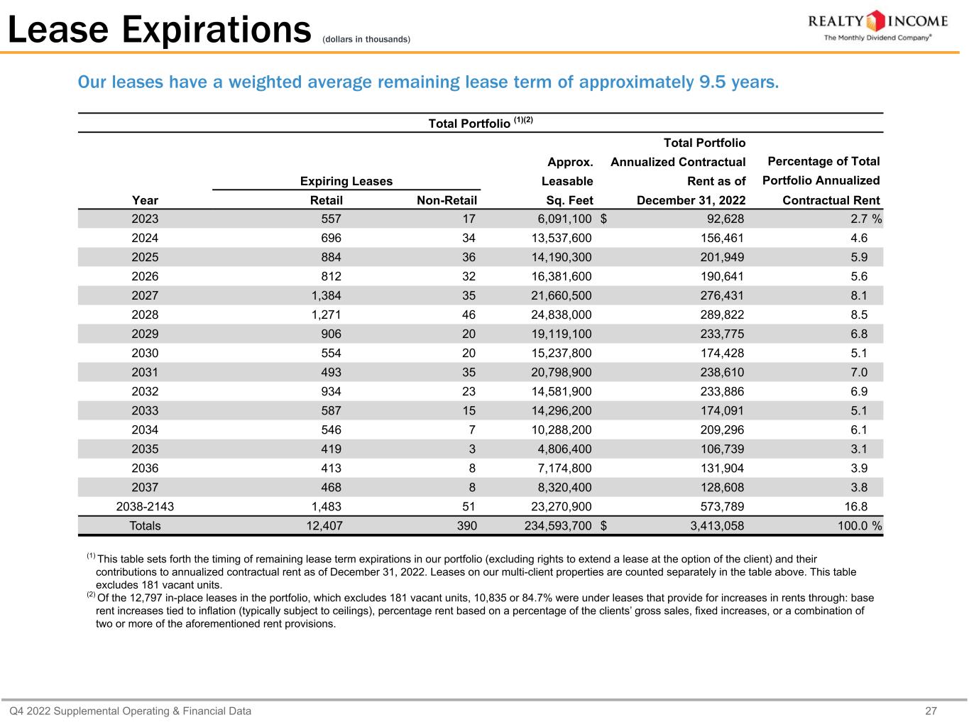 Q4 2022 Supplemental Operating & Financial Data 27 (1) This table sets forth the timing of remaining lease term expirations in our portfolio (excluding rights to extend a lease at the option of the client) and their contributions to annualized contractual rent as of December 31, 2022. Leases on our multi-client properties are counted separately in the table above. This table excludes 181 vacant units. (2) Of the 12,797 in-place leases in the portfolio, which excludes 181 vacant units, 10,835 or 84.7% were under leases that provide for increases in rents through: base rent increases tied to inflation (typically subject to ceilings), percentage rent based on a percentage of the clients’ gross sales, fixed increases, or a combination of two or more of the aforementioned rent provisions. Our leases have a weighted average remaining lease term of approximately 9.5 years. Lease Expirations (dollars in thousands) Total Portfolio (1)(2) Total Portfolio Approx. Annualized Contractual Percentage of Total Expiring Leases Leasable Rent as of Portfolio Annualized Year Retail Non-Retail Sq. Feet December 31, 2022 Contractual Rent 2023 557 17 6,091,100 $ 92,628 2.7 % 2024 696 34 13,537,600 156,461 4.6 2025 884 36 14,190,300 201,949 5.9 2026 812 32 16,381,600 190,641 5.6 2027 1,384 35 21,660,500 276,431 8.1 2028 1,271 46 24,838,000 289,822 8.5 2029 906 20 19,119,100 233,775 6.8 2030 554 20 15,237,800 174,428 5.1 2031 493 35 20,798,900 238,610 7.0 2032 934 23 14,581,900 233,886 6.9 2033 587 15 14,296,200 174,091 5.1 2034 546 7 10,288,200 209,296 6.1 2035 419 3 4,806,400 106,739 3.1 2036 413 8 7,174,800 131,904 3.9 2037 468 8 8,320,400 128,608 3.8 2038-2143 1,483 51 23,270,900 573,789 16.8 Totals 12,407 390 234,593,700 $ 3,413,058 100.0 %