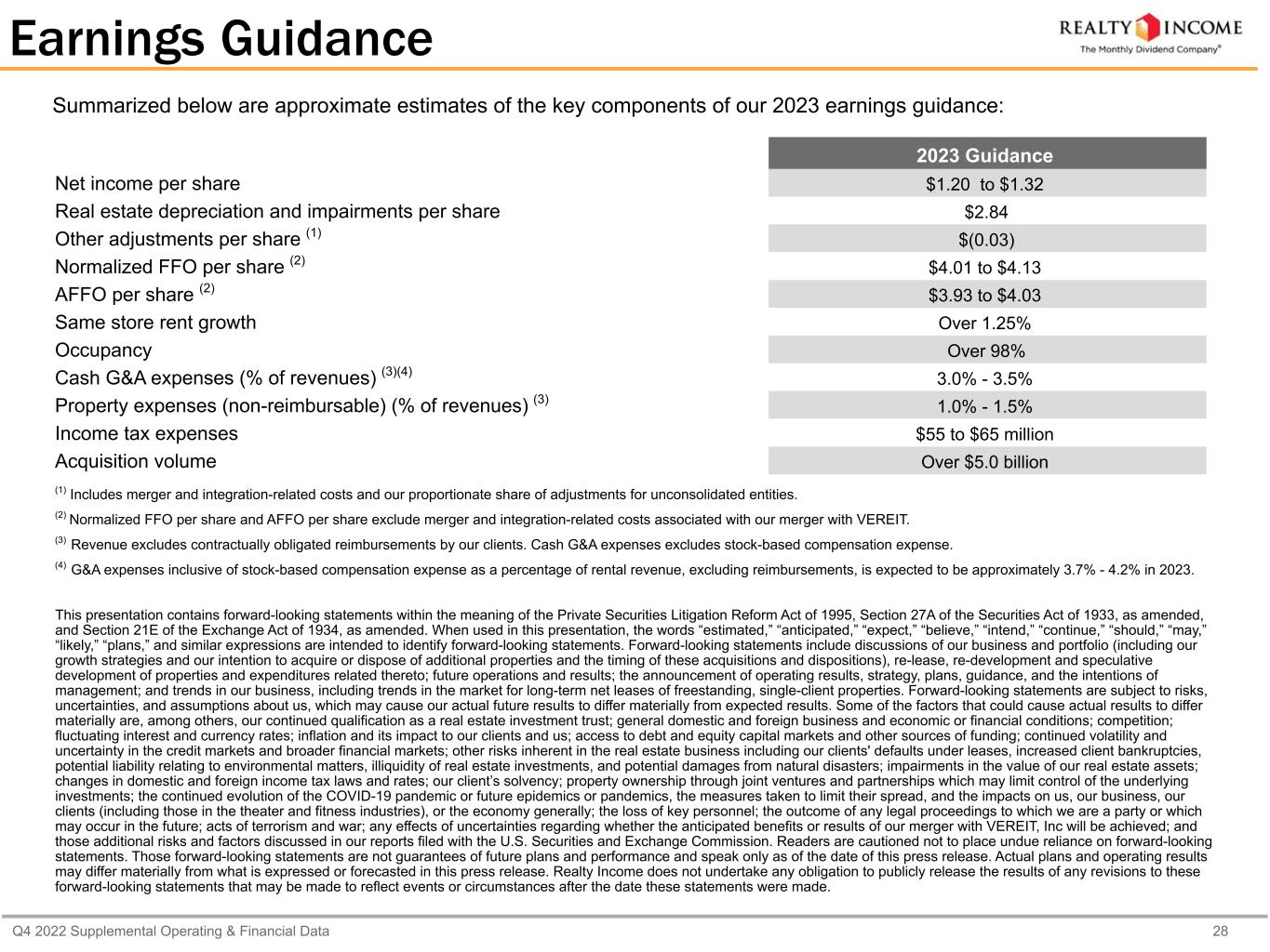 Q4 2022 Supplemental Operating & Financial Data 28 Earnings Guidance Summarized below are approximate estimates of the key components of our 2023 earnings guidance: 2023 Guidance Net income per share $1.20 to $1.32 Real estate depreciation and impairments per share $2.84 Other adjustments per share (1) $(0.03) Normalized FFO per share (2) $4.01 to $4.13 AFFO per share (2) $3.93 to $4.03 Same store rent growth Over 1.25% Occupancy Over 98% Cash G&A expenses (% of revenues) (3)(4) 3.0% - 3.5% Property expenses (non-reimbursable) (% of revenues) (3) 1.0% - 1.5% Income tax expenses $55 to $65 million Acquisition volume Over $5.0 billion (1) Includes merger and integration-related costs and our proportionate share of adjustments for unconsolidated entities. (2) Normalized FFO per share and AFFO per share exclude merger and integration-related costs associated with our merger with VEREIT. (3) Revenue excludes contractually obligated reimbursements by our clients. Cash G&A expenses excludes stock-based compensation expense. (4) G&A expenses inclusive of stock-based compensation expense as a percentage of rental revenue, excluding reimbursements, is expected to be approximately 3.7% - 4.2% in 2023. This presentation contains forward-looking statements within the meaning of the Private Securities Litigation Reform Act of 1995, Section 27A of the Securities Act of 1933, as amended, and Section 21E of the Exchange Act of 1934, as amended. When used in this presentation, the words “estimated,” “anticipated,” “expect,” “believe,” “intend,” “continue,” “should,” “may,” “likely,” “plans,” and similar expressions are intended to identify forward-looking statements. Forward-looking statements include discussions of our business and portfolio (including our growth strategies and our intention to acquire or dispose of additional properties and the timing of these acquisitions and dispositions), re-lease, re-development and speculative development of properties and expenditures related thereto; future operations and results; the announcement of operating results, strategy, plans, guidance, and the intentions of management; and trends in our business, including trends in the market for long-term net leases of freestanding, single-client properties. Forward-looking statements are subject to risks, uncertainties, and assumptions about us, which may cause our actual future results to differ materially from expected results. Some of the factors that could cause actual results to differ materially are, among others, our continued qualification as a real estate investment trust; general domestic and foreign business and economic or financial conditions; competition; fluctuating interest and currency rates; inflation and its impact to our clients and us; access to debt and equity capital markets and other sources of funding; continued volatility and uncertainty in the credit markets and broader financial markets; other risks inherent in the real estate business including our clients' defaults under leases, increased client bankruptcies, potential liability relating to environmental matters, illiquidity of real estate investments, and potential damages from natural disasters; impairments in the value of our real estate assets; changes in domestic and foreign income tax laws and rates; our client’s solvency; property ownership through joint ventures and partnerships which may limit control of the underlying investments; the continued evolution of the COVID-19 pandemic or future epidemics or pandemics, the measures taken to limit their spread, and the impacts on us, our business, our clients (including those in the theater and fitness industries), or the economy generally; the loss of key personnel; the outcome of any legal proceedings to which we are a party or which may occur in the future; acts of terrorism and war; any effects of uncertainties regarding whether the anticipated benefits or results of our merger with VEREIT, Inc will be achieved; and those additional risks and factors discussed in our reports filed with the U.S. Securities and Exchange Commission. Readers are cautioned not to place undue reliance on forward-looking statements. Those forward-looking statements are not guarantees of future plans and performance and speak only as of the date of this press release. Actual plans and operating results may differ materially from what is expressed or forecasted in this press release. Realty Income does not undertake any obligation to publicly release the results of any revisions to these forward-looking statements that may be made to reflect events or circumstances after the date these statements were made.