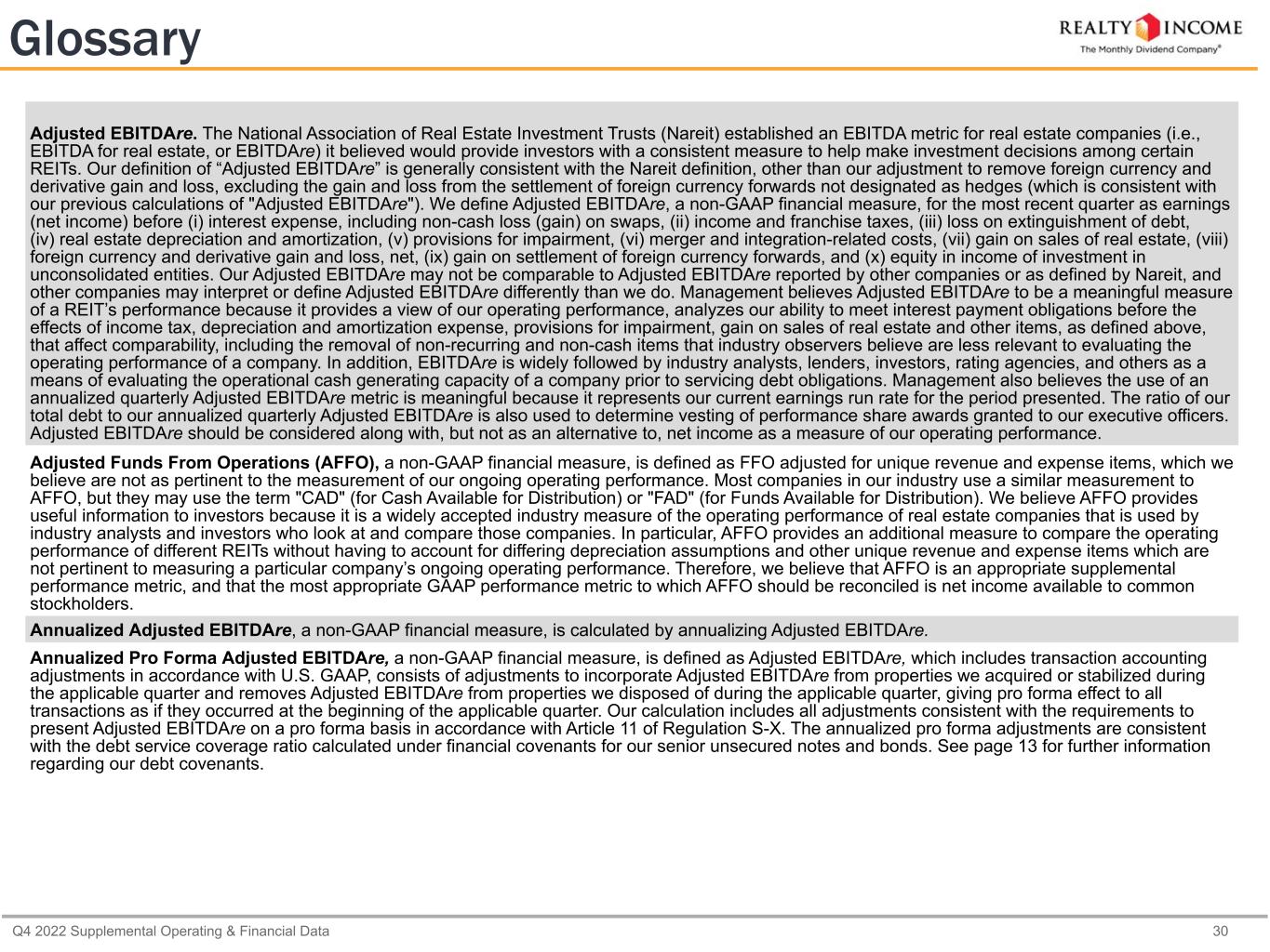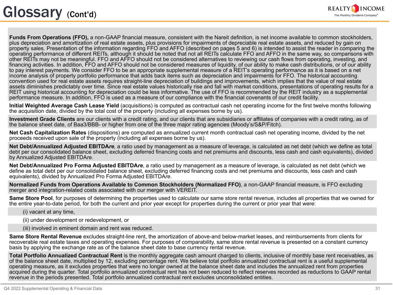 Q4 2022 Supplemental Operating & Financial Data 30 Glossary Adjusted EBITDAre. The National Association of Real Estate Investment Trusts (Nareit) established an EBITDA metric for real estate companies (i.e., EBITDA for real estate, or EBITDAre) it believed would provide investors with a consistent measure to help make investment decisions among certain REITs. Our definition of “Adjusted EBITDAre” is generally consistent with the Nareit definition, other than our adjustment to remove foreign currency and derivative gain and loss, excluding the gain and loss from the settlement of foreign currency forwards not designated as hedges (which is consistent with our previous calculations of "Adjusted EBITDAre"). We define Adjusted EBITDAre, a non-GAAP financial measure, for the most recent quarter as earnings (net income) before (i) interest expense, including non-cash loss (gain) on swaps, (ii) income and franchise taxes, (iii) loss on extinguishment of debt, (iv) real estate depreciation and amortization, (v) provisions for impairment, (vi) merger and integration-related costs, (vii) gain on sales of real estate, (viii) foreign currency and derivative gain and loss, net, (ix) gain on settlement of foreign currency forwards, and (x) equity in income of investment in unconsolidated entities. Our Adjusted EBITDAre may not be comparable to Adjusted EBITDAre reported by other companies or as defined by Nareit, and other companies may interpret or define Adjusted EBITDAre differently than we do. Management believes Adjusted EBITDAre to be a meaningful measure of a REIT’s performance because it provides a view of our operating performance, analyzes our ability to meet interest payment obligations before the effects of income tax, depreciation and amortization expense, provisions for impairment, gain on sales of real estate and other items, as defined above, that affect comparability, including the removal of non-recurring and non-cash items that industry observers believe are less relevant to evaluating the operating performance of a company. In addition, EBITDAre is widely followed by industry analysts, lenders, investors, rating agencies, and others as a means of evaluating the operational cash generating capacity of a company prior to servicing debt obligations. Management also believes the use of an annualized quarterly Adjusted EBITDAre metric is meaningful because it represents our current earnings run rate for the period presented. The ratio of our total debt to our annualized quarterly Adjusted EBITDAre is also used to determine vesting of performance share awards granted to our executive officers. Adjusted EBITDAre should be considered along with, but not as an alternative to, net income as a measure of our operating performance. Adjusted Funds From Operations (AFFO), a non-GAAP financial measure, is defined as FFO adjusted for unique revenue and expense items, which we believe are not as pertinent to the measurement of our ongoing operating performance. Most companies in our industry use a similar measurement to AFFO, but they may use the term "CAD" (for Cash Available for Distribution) or "FAD" (for Funds Available for Distribution). We believe AFFO provides useful information to investors because it is a widely accepted industry measure of the operating performance of real estate companies that is used by industry analysts and investors who look at and compare those companies. In particular, AFFO provides an additional measure to compare the operating performance of different REITs without having to account for differing depreciation assumptions and other unique revenue and expense items which are not pertinent to measuring a particular company’s ongoing operating performance. Therefore, we believe that AFFO is an appropriate supplemental performance metric, and that the most appropriate GAAP performance metric to which AFFO should be reconciled is net income available to common stockholders. Annualized Adjusted EBITDAre, a non-GAAP financial measure, is calculated by annualizing Adjusted EBITDAre. Annualized Pro Forma Adjusted EBITDAre, a non-GAAP financial measure, is defined as Adjusted EBITDAre, which includes transaction accounting adjustments in accordance with U.S. GAAP, consists of adjustments to incorporate Adjusted EBITDAre from properties we acquired or stabilized during the applicable quarter and removes Adjusted EBITDAre from properties we disposed of during the applicable quarter, giving pro forma effect to all transactions as if they occurred at the beginning of the applicable quarter. Our calculation includes all adjustments consistent with the requirements to present Adjusted EBITDAre on a pro forma basis in accordance with Article 11 of Regulation S-X. The annualized pro forma adjustments are consistent with the debt service coverage ratio calculated under financial covenants for our senior unsecured notes and bonds. See page 13 for further information regarding our debt covenants.