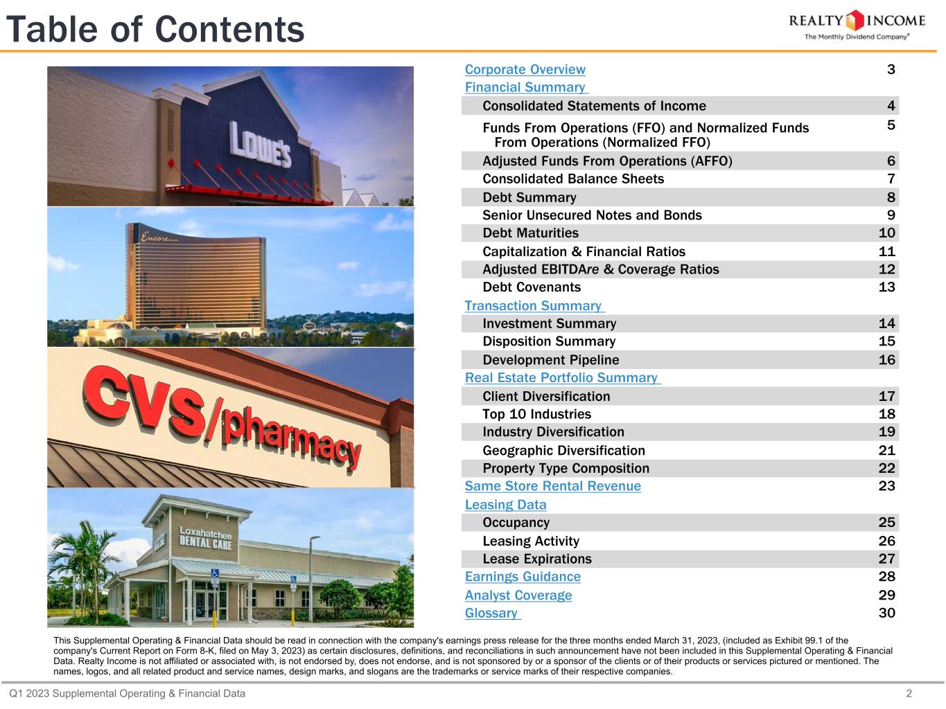 Q1 2023 Supplemental Operating & Financial Data 2 Table of Contents Corporate Overview 3 Financial Summary Consolidated Statements of Income 4 Funds From Operations (FFO) and Normalized Funds From Operations (Normalized FFO) 5 Adjusted Funds From Operations (AFFO) 6 Consolidated Balance Sheets 7 Debt Summary 8 Senior Unsecured Notes and Bonds 9 Debt Maturities 10 Capitalization & Financial Ratios 11 Adjusted EBITDAre & Coverage Ratios 12 Debt Covenants 13 Transaction Summary Investment Summary 14 Disposition Summary 15 Development Pipeline 16 Real Estate Portfolio Summary Client Diversification 17 Top 10 Industries 18 Industry Diversification 19 Geographic Diversification 21 Property Type Composition 22 Same Store Rental Revenue 23 Leasing Data Occupancy 25 Leasing Activity 26 Lease Expirations 27 Earnings Guidance 28 Analyst Coverage 29 Glossary 30 This Supplemental Operating & Financial Data should be read in connection with the company's earnings press release for the three months ended March 31, 2023, (included as Exhibit 99.1 of the company's Current Report on Form 8-K, filed on May 3, 2023) as certain disclosures, definitions, and reconciliations in such announcement have not been included in this Supplemental Operating & Financial Data. Realty Income is not affiliated or associated with, is not endorsed by, does not endorse, and is not sponsored by or a sponsor of the clients or of their products or services pictured or mentioned. The names, logos, and all related product and service names, design marks, and slogans are the trademarks or service marks of their respective companies.