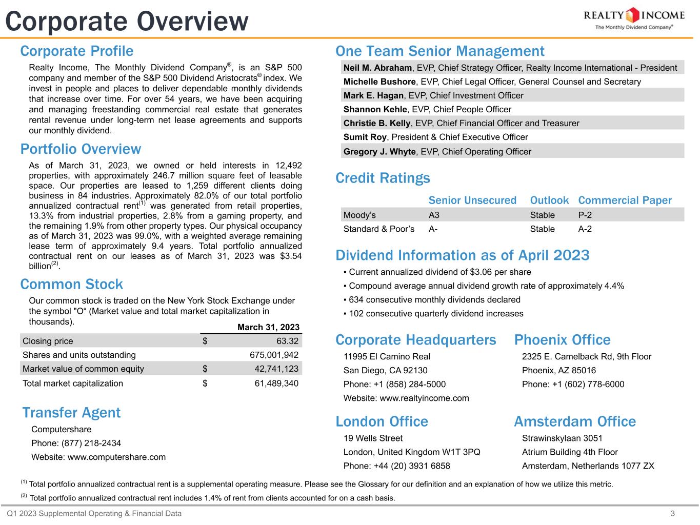 Q1 2023 Supplemental Operating & Financial Data 3 One Team Senior Management Neil M. Abraham, EVP, Chief Strategy Officer, Realty Income International - President Michelle Bushore, EVP, Chief Legal Officer, General Counsel and Secretary Mark E. Hagan, EVP, Chief Investment Officer Shannon Kehle, EVP, Chief People Officer Christie B. Kelly, EVP, Chief Financial Officer and Treasurer Sumit Roy, President & Chief Executive Officer Gregory J. Whyte, EVP, Chief Operating Officer Credit Ratings Senior Unsecured Outlook Commercial Paper Moody’s A3 Stable P-2 Standard & Poor’s A- Stable A-2 Dividend Information as of April 2023 ▪ Current annualized dividend of $3.06 per share ▪ Compound average annual dividend growth rate of approximately 4.4% ▪ 634 consecutive monthly dividends declared ▪ 102 consecutive quarterly dividend increases Corporate Headquarters Phoenix Office 11995 El Camino Real 2325 E. Camelback Rd, 9th Floor San Diego, CA 92130 Phoenix, AZ 85016 Phone: +1 (858) 284-5000 Phone: +1 (602) 778-6000 Website: www.realtyincome.com London Office Amsterdam Office 19 Wells Street Strawinskylaan 3051 London, United Kingdom W1T 3PQ Atrium Building 4th Floor Phone: +44 (20) 3931 6858 Amsterdam, Netherlands 1077 ZX Corporate Overview Transfer Agent Computershare Phone: (877) 218-2434 Website: www.computershare.com (1) Total portfolio annualized contractual rent is a supplemental operating measure. Please see the Glossary for our definition and an explanation of how we utilize this metric. (2) Total portfolio annualized contractual rent includes 1.4% of rent from clients accounted for on a cash basis. March 31, 2023 Closing price $ 63.32 Shares and units outstanding 675,001,942 Market value of common equity $ 42,741,123 Total market capitalization $ 61,489,340 Corporate Profile Realty Income, The Monthly Dividend Company®, is an S&P 500 company and member of the S&P 500 Dividend Aristocrats® index. We invest in people and places to deliver dependable monthly dividends that increase over time. For over 54 years, we have been acquiring and managing freestanding commercial real estate that generates rental revenue under long-term net lease agreements and supports our monthly dividend. Portfolio Overview As of March 31, 2023, we owned or held interests in 12,492 properties, with approximately 246.7 million square feet of leasable space. Our properties are leased to 1,259 different clients doing business in 84 industries. Approximately 82.0% of our total portfolio annualized contractual rent(1) was generated from retail properties, 13.3% from industrial properties, 2.8% from a gaming property, and the remaining 1.9% from other property types. Our physical occupancy as of March 31, 2023 was 99.0%, with a weighted average remaining lease term of approximately 9.4 years. Total portfolio annualized contractual rent on our leases as of March 31, 2023 was $3.54 billion(2). Common Stock Our common stock is traded on the New York Stock Exchange under the symbol "O“ (Market value and total market capitalization in thousands).