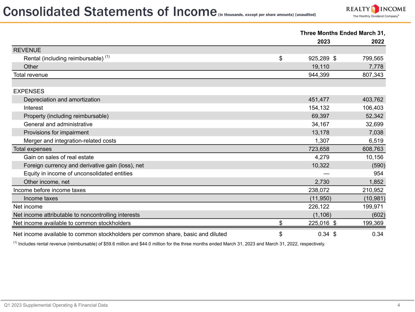 Q1 2023 Supplemental Operating & Financial Data 4 Three Months Ended March 31, 2023 2022 REVENUE Rental (including reimbursable) (1) $ 925,289 $ 799,565 Other 19,110 7,778 Total revenue 944,399 807,343 EXPENSES Depreciation and amortization 451,477 403,762 Interest 154,132 106,403 Property (including reimbursable) 69,397 52,342 General and administrative 34,167 32,699 Provisions for impairment 13,178 7,038 Merger and integration-related costs 1,307 6,519 Total expenses 723,658 608,763 Gain on sales of real estate 4,279 10,156 Foreign currency and derivative gain (loss), net 10,322 (590) Equity in income of unconsolidated entities — 954 Other income, net 2,730 1,852 Income before income taxes 238,072 210,952 Income taxes (11,950) (10,981) Net income 226,122 199,971 Net income attributable to noncontrolling interests (1,106) (602) Net income available to common stockholders $ 225,016 $ 199,369 Net income available to common stockholders per common share, basic and diluted $ 0.34 $ 0.34 (1) Includes rental revenue (reimbursable) of $59.6 million and $44.0 million for the three months ended March 31, 2023 and March 31, 2022, respectively. Consolidated Statements of Income (in thousands, except per share amounts) (unaudited)