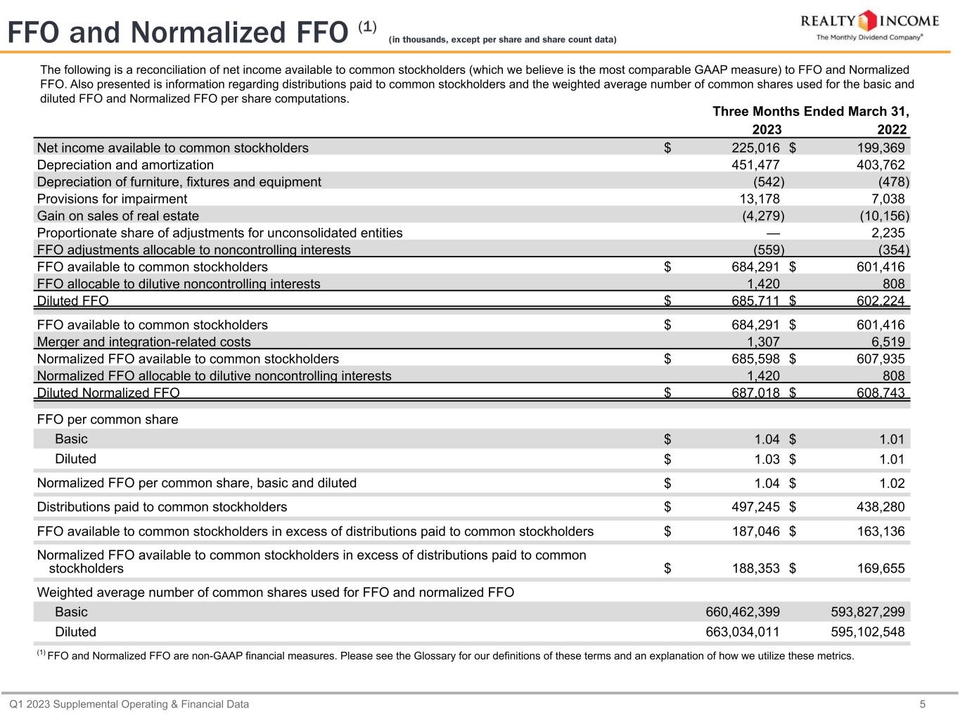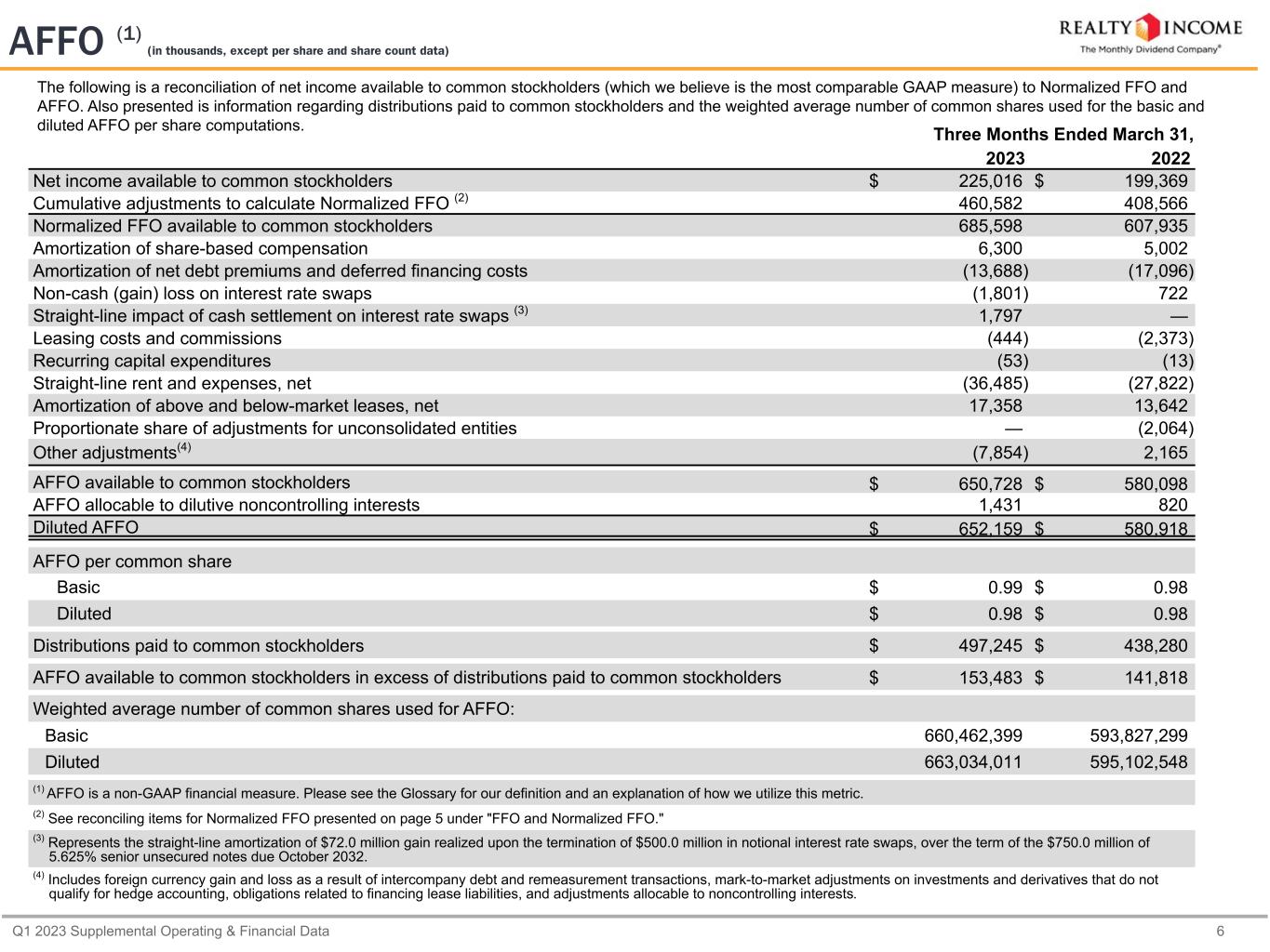 Q1 2023 Supplemental Operating & Financial Data 6 The following is a reconciliation of net income available to common stockholders (which we believe is the most comparable GAAP measure) to Normalized FFO and AFFO. Also presented is information regarding distributions paid to common stockholders and the weighted average number of common shares used for the basic and diluted AFFO per share computations. Three Months Ended March 31, 2023 2022 Net income available to common stockholders $ 225,016 $ 199,369 Cumulative adjustments to calculate Normalized FFO (2) 460,582 408,566 Normalized FFO available to common stockholders 685,598 607,935 Amortization of share-based compensation 6,300 5,002 Amortization of net debt premiums and deferred financing costs (13,688) (17,096) Non-cash (gain) loss on interest rate swaps (1,801) 722 Straight-line impact of cash settlement on interest rate swaps (3) 1,797 — Leasing costs and commissions (444) (2,373) Recurring capital expenditures (53) (13) Straight-line rent and expenses, net (36,485) (27,822) Amortization of above and below-market leases, net 17,358 13,642 Proportionate share of adjustments for unconsolidated entities — (2,064) Other adjustments(4) (7,854) 2,165 AFFO available to common stockholders $ 650,728 $ 580,098 AFFO allocable to dilutive noncontrolling interests 1,431 820 Diluted AFFO $ 652,159 $ 580,918 AFFO per common share Basic $ 0.99 $ 0.98 Diluted $ 0.98 $ 0.98 Distributions paid to common stockholders $ 497,245 $ 438,280 AFFO available to common stockholders in excess of distributions paid to common stockholders $ 153,483 $ 141,818 Weighted average number of common shares used for AFFO: Basic 660,462,399 593,827,299 Diluted 663,034,011 595,102,548 (1) AFFO is a non-GAAP financial measure. Please see the Glossary for our definition and an explanation of how we utilize this metric. (2) See reconciling items for Normalized FFO presented on page 5 under "FFO and Normalized FFO." (3) Represents the straight-line amortization of $72.0 million gain realized upon the termination of $500.0 million in notional interest rate swaps, over the term of the $750.0 million of 5.625% senior unsecured notes due October 2032. (4) Includes foreign currency gain and loss as a result of intercompany debt and remeasurement transactions, mark-to-market adjustments on investments and derivatives that do not qualify for hedge accounting, obligations related to financing lease liabilities, and adjustments allocable to noncontrolling interests. AFFO (1) (in thousands, except per share and share count data)