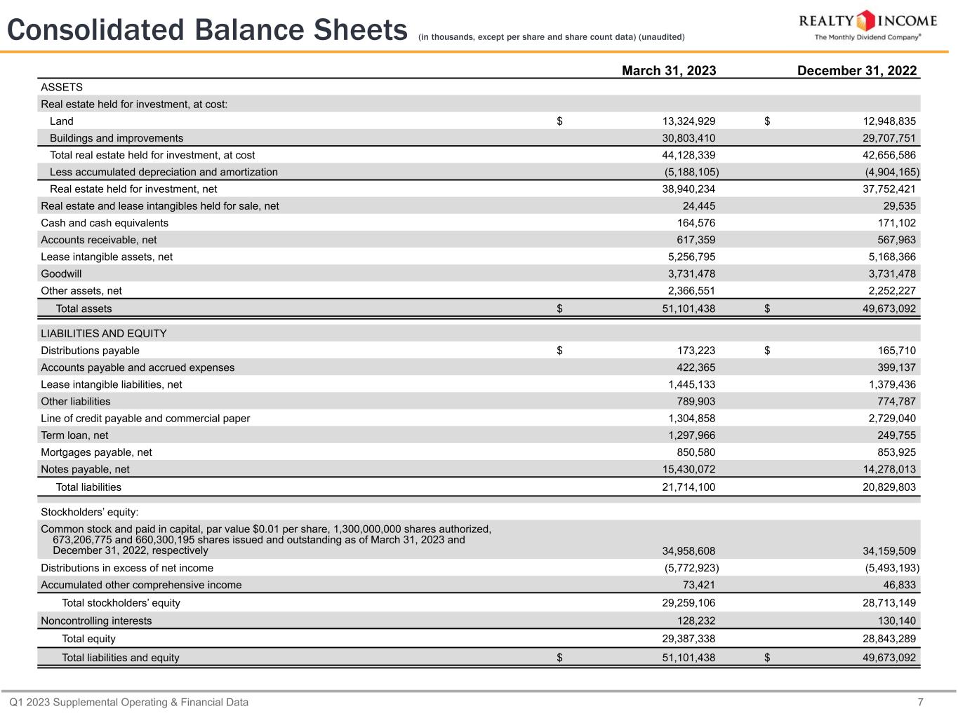 Q1 2023 Supplemental Operating & Financial Data 7 Consolidated Balance Sheets (in thousands, except per share and share count data) (unaudited) March 31, 2023 December 31, 2022 ASSETS Real estate held for investment, at cost: Land $ 13,324,929 $ 12,948,835 Buildings and improvements 30,803,410 29,707,751 Total real estate held for investment, at cost 44,128,339 42,656,586 Less accumulated depreciation and amortization (5,188,105) (4,904,165) Real estate held for investment, net 38,940,234 37,752,421 Real estate and lease intangibles held for sale, net 24,445 29,535 Cash and cash equivalents 164,576 171,102 Accounts receivable, net 617,359 567,963 Lease intangible assets, net 5,256,795 5,168,366 Goodwill 3,731,478 3,731,478 Other assets, net 2,366,551 2,252,227 Total assets $ 51,101,438 $ 49,673,092 LIABILITIES AND EQUITY Distributions payable $ 173,223 $ 165,710 Accounts payable and accrued expenses 422,365 399,137 Lease intangible liabilities, net 1,445,133 1,379,436 Other liabilities 789,903 774,787 Line of credit payable and commercial paper 1,304,858 2,729,040 Term loan, net 1,297,966 249,755 Mortgages payable, net 850,580 853,925 Notes payable, net 15,430,072 14,278,013 Total liabilities 21,714,100 20,829,803 Stockholders’ equity: Common stock and paid in capital, par value $0.01 per share, 1,300,000,000 shares authorized, 673,206,775 and 660,300,195 shares issued and outstanding as of March 31, 2023 and December 31, 2022, respectively 34,958,608 34,159,509 Distributions in excess of net income (5,772,923) (5,493,193) Accumulated other comprehensive income 73,421 46,833 Total stockholders’ equity 29,259,106 28,713,149 Noncontrolling interests 128,232 130,140 Total equity 29,387,338 28,843,289 Total liabilities and equity $ 51,101,438 $ 49,673,092