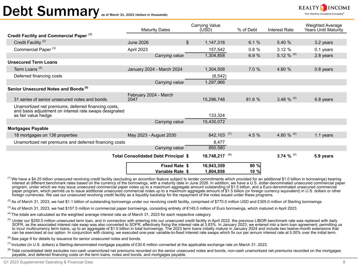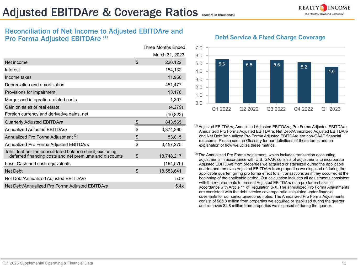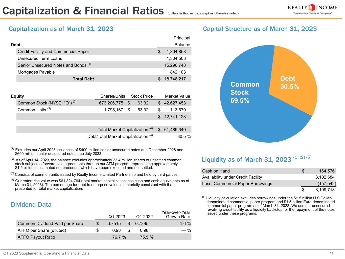 Q1 2023 Supplemental Operating & Financial Data 11 Capitalization & Financial Ratios (dollars in thousands, except as otherwise noted) Cash on Hand $ 164,576 Availability under Credit Facility 3,102,684 Less: Commercial Paper Borrowings (157,542) $ 3,109,718 (5) Liquidity calculation excludes borrowings under the $1.5 billion U.S Dollar- denominated commercial paper program and $1.5 billion Euro-denominated commercial paper program as of March 31, 2023. We use our unsecured revolving credit facility as a liquidity backstop for the repayment of the notes issued under these programs. Principal Debt Balance Credit Facility and Commercial Paper $ 1,304,858 Unsecured Term Loans 1,304,508 Senior Unsecured Notes and Bonds (1) 15,296,748 Mortgages Payable 842,103 Total Debt $ 18,748,217 Equity Shares/Units Stock Price Market Value Common Stock (NYSE: "O") (2) 673,206,775 $ 63.32 $ 42,627,453 Common Units (3) 1,795,167 $ 63.32 $ 113,670 $ 42,741,123 Total Market Capitalization (4) $ 61,489,340 Debt/Total Market Capitalization (4) 30.5 % (1) Excludes our April 2023 issuances of $400 million senior unsecured notes due December 2028 and $600 million senior unsecured notes due July 2033. (2) As of April 14, 2023, the balance excludes approximately 23.4 million shares of unsettled common stock subject to forward sale agreements through our ATM program, representing approximately $1.5 billion in estimated net proceeds, which have been executed and not settled. (3) Consists of common units issued by Realty Income Limited Partnership and held by third parties. (4) Our enterprise value was $61,324,764 (total market capitalization less cash and cash equivalents as of March 31, 2023). The percentage for debt to enterprise value is materially consistent with that presented for total market capitalization. Dividend Data Q1 2023 Q1 2022 Year-over-Year Growth Rate Common Dividend Paid per Share $ 0.7515 $ 0.7395 1.6 % AFFO per Share (diluted) $ 0.98 $ 0.98 — % AFFO Payout Ratio 76.7 % 75.5 % Liquidity as of March 31, 2023 (1) (2) (5) Capitalization as of March 31, 2023 Capital Structure as of March 31, 2023 Common Stock 69.5% Debt 30.5%