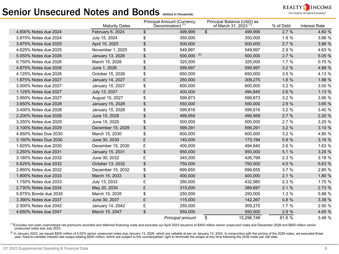 Q1 2023 Supplemental Operating & Financial Data 8 Debt Summary as of March 31, 2023 (dollars in thousands) Maturity Dates Carrying Value (USD) % of Debt Interest Rate Weighted Average Years Until Maturity Credit Facility and Commercial Paper (1) Credit Facility (2) June 2026 $ 1,147,316 6.1 % 5.40 % 3.2 years Commercial Paper (3) April 2023 157,542 0.8 % 3.12 % 0.1 years Carrying value 1,304,858 6.9 % 5.12 % (4) 2.8 years Unsecured Term Loans Term Loans (5) January 2024 - March 2024 1,304,508 7.0 % 4.80 % 0.8 years Deferred financing costs (6,542) Carrying value 1,297,966 Senior Unsecured Notes and Bonds (6) 31 series of senior unsecured notes and bonds February 2024 - March 2047 15,296,748 81.6 % 3.48 % (4) 6.8 years Unamortized net premiums, deferred financing costs, and basis adjustment on interest rate swaps designated as fair value hedge 133,324 Carrying value 15,430,072 Mortgages Payable 18 mortgages on 136 properties May 2023 - August 2030 842,103 (7) 4.5 % 4.80 % (4) 1.1 years Unamortized net premiums and deferred financing costs 8,477 Carrying value 850,580 Total Consolidated Debt Principal $ 18,748,217 (8) 3.74 % (4) 5.9 years Fixed Rate $ 16,943,359 90 % Variable Rate $ 1,804,858 10 % (1) We have a $4.25 billion unsecured revolving credit facility (excluding an accordion feature subject to lender commitments which provided for an additional $1.0 billion in borrowings) bearing interest at different benchmark rates based on the currency of the borrowings, with a maturity date in June 2026. In addition, we have a U.S. dollar-denominated unsecured commercial paper program, under which we may issue unsecured commercial paper notes up to a maximum aggregate amount outstanding of $1.5 billion, and a Euro-denominated unsecured commercial paper program, which permits us to issue additional unsecured commercial notes up to a maximum aggregate amount of $1.5 billion (or foreign currency equivalent) in U.S. dollars or other foreign currencies. We use our unsecured revolving credit facility as a liquidity backstop for the repayment of the notes issued under these programs. (2) As of March 31, 2023, we had $1.1 billion of outstanding borrowings under our revolving credit facility, comprised of $770.0 million USD and £305.0 million of Sterling borrowings. (3) As of March 31, 2023, we had $157.5 million in commercial paper borrowings, consisting entirely of €145.0 million of Euro borrowings, which matured in April 2023. (4) The totals are calculated as the weighted average interest rate as of March 31, 2023 for each respective category. (5) Under our $250.0 million unsecured term loan, and in connection with entering into our unsecured credit facility in April 2022, the previous LIBOR benchmark rate was replaced with daily SOFR, as the associated interest rate swap was also converted to SOFR, effectively fixing the interest rate at 3.83%. In January 2023, we entered into a term loan agreement, permitting us to incur multicurrency term loans, up to an aggregate of $1.5 billion in total borrowings. The 2023 term loans initially mature in January 2024 and include two twelve-month extensions that can be exercised at our option. In conjunction with closing, we executed one-year variable-to-fixed interest rate swaps which fix our per annum interest rate at 5.00% over the initial term. (6) See page 9 for details by issuance for senior unsecured notes and bonds. (7) Includes (in U.S. dollars) a Sterling-denominated mortgage payable of £30.6 million converted at the applicable exchange rate on March 31, 2023. (8) Total consolidated debt excludes non-cash unamortized net premiums recorded on the senior unsecured notes and bonds, non-cash unamortized net premiums recorded on the mortgages payable, and deferred financing costs on the term loans, notes and bonds, and mortgages payable.