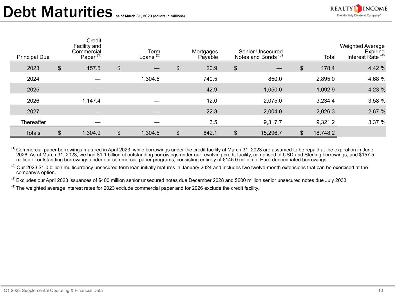 Q1 2023 Supplemental Operating & Financial Data 9 Senior Unsecured Notes and Bonds (dollars in thousands) Maturity Dates Principal Amount (Currency Denomination) (1) Principal Balance (USD) as of March 31, 2023 (1) % of Debt Interest Rate 4.600% Notes due 2024 February 6, 2024 $ 499,999 $ 499,999 2.7 % 4.60 % 3.875% Notes due 2024 July 15, 2024 $ 350,000 350,000 1.9 % 3.88 % 3.875% Notes due 2025 April 15, 2025 $ 500,000 500,000 2.7 % 3.88 % 4.625% Notes due 2025 November 1, 2025 $ 549,997 549,997 2.9 % 4.63 % 5.050% Notes due 2026 January 13, 2026 $ 500,000 (2) 500,000 2.7 % 5.05 % 0.750% Notes due 2026 March 15, 2026 $ 325,000 325,000 1.7 % 0.75 % 4.875% Notes due 2026 June 1, 2026 $ 599,997 599,997 3.2 % 4.88 % 4.125% Notes due 2026 October 15, 2026 $ 650,000 650,000 3.5 % 4.13 % 1.875% Notes due 2027 January 14, 2027 £ 250,000 309,275 1.6 % 1.88 % 3.000% Notes due 2027 January 15, 2027 $ 600,000 600,000 3.2 % 3.00 % 1.125% Notes due 2027 July 13, 2027 £ 400,000 494,840 2.6 % 1.13 % 3.950% Notes due 2027 August 15, 2027 $ 599,873 599,873 3.2 % 3.95 % 3.650% Notes due 2028 January 15, 2028 $ 550,000 550,000 2.9 % 3.65 % 3.400% Notes due 2028 January 15, 2028 $ 599,816 599,816 3.2 % 3.40 % 2.200% Notes due 2028 June 15, 2028 $ 499,959 499,959 2.7 % 2.20 % 3.250% Notes due 2029 June 15, 2029 $ 500,000 500,000 2.7 % 3.25 % 3.100% Notes due 2029 December 15, 2029 $ 599,291 599,291 3.2 % 3.10 % 4.850% Notes Due 2030 March 15, 2030 $ 600,000 600,000 3.2 % 4.85 % 3.160% Notes Due 2030 June 30, 2030 £ 140,000 173,194 0.9 % 3.16 % 1.625% Notes due 2030 December 15, 2030 £ 400,000 494,840 2.6 % 1.63 % 3.250% Notes due 2031 January 15, 2031 $ 950,000 950,000 5.1 % 3.25 % 3.180% Notes due 2032 June 30, 2032 £ 345,000 426,799 2.3 % 3.18 % 5.625% Notes due 2032 October 13, 2032 $ 750,000 750,000 4.0 % 5.63 % 2.850% Notes due 2032 December 15, 2032 $ 699,655 699,655 3.7 % 2.85 % 1.800% Notes due 2033 March 15, 2033 $ 400,000 400,000 2.1 % 1.80 % 1.750% Notes due 2033 July 13, 2033 £ 350,000 432,985 2.3 % 1.75 % 2.730% Notes due 2034 May 20, 2034 £ 315,000 389,687 2.1 % 2.73 % 5.875% Bonds due 2035 March 15, 2035 $ 250,000 250,000 1.3 % 5.88 % 3.390% Notes due 2037 June 30, 2037 £ 115,000 142,267 0.8 % 3.39 % 2.500% Notes due 2042 January 14, 2042 £ 250,000 309,275 1.7 % 2.50 % 4.650% Notes due 2047 March 15, 2047 $ 550,000 550,000 2.9 % 4.65 % Principal amount $ 15,296,748 81.6 % 3.48 % (1) Excludes non-cash unamortized net premiums recorded and deferred financing costs and excludes our April 2023 issuance of $400 million senior unsecured notes due December 2028 and $600 million senior unsecured notes due July 2033. (2) In January 2023, we issued $500 million of 5.05% senior unsecured notes due January 13, 2026, which are callable at par on January 13, 2024. In conjunction with the pricing of the 2026 notes, we executed three- year, fixed-to-variable interest rate swaps totaling $500 million, which are subject to the counterparties' right to terminate the swaps at any time following the 2026 notes par call date.
