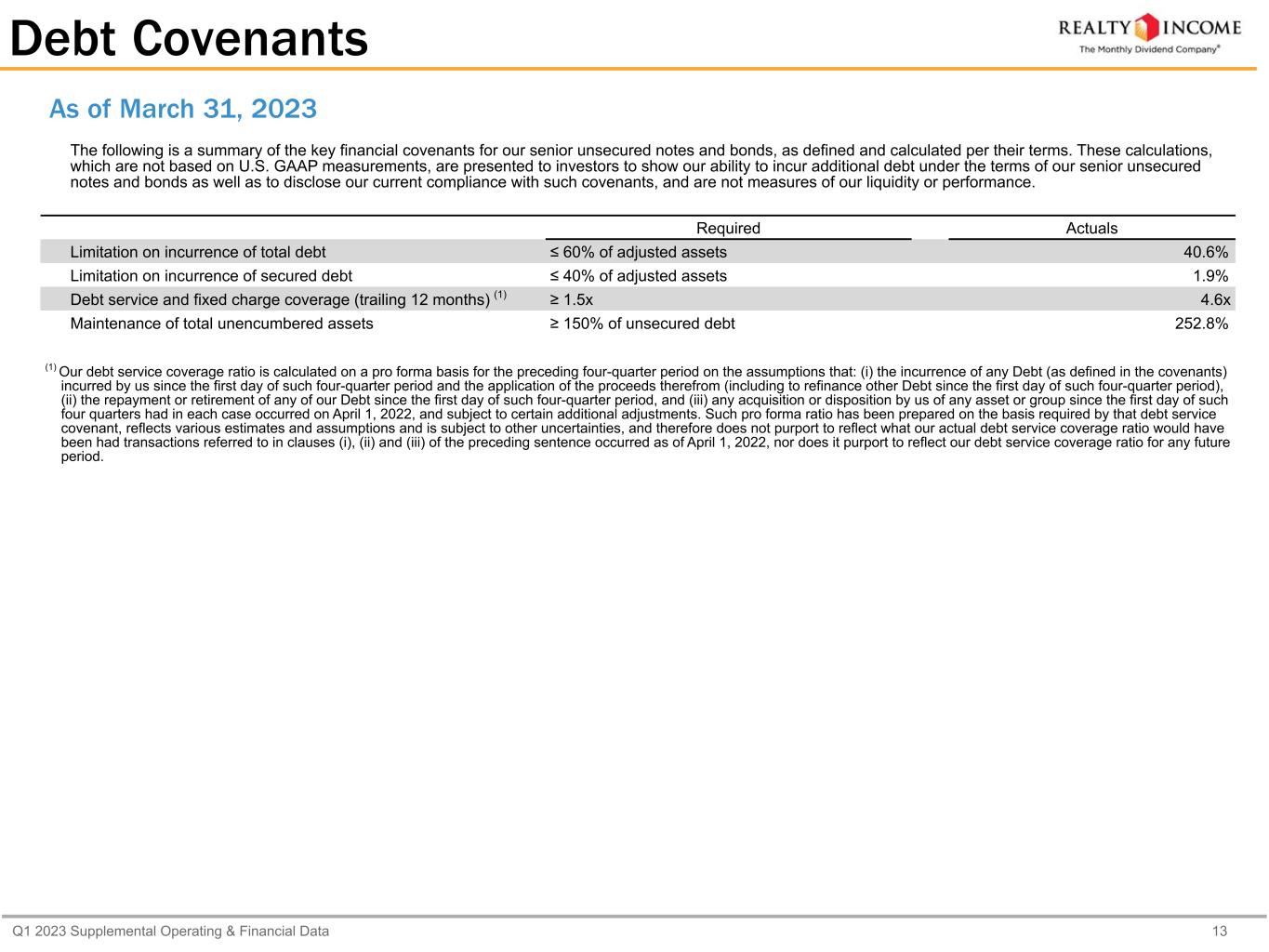 Q1 2023 Supplemental Operating & Financial Data 13 Debt Covenants The following is a summary of the key financial covenants for our senior unsecured notes and bonds, as defined and calculated per their terms. These calculations, which are not based on U.S. GAAP measurements, are presented to investors to show our ability to incur additional debt under the terms of our senior unsecured notes and bonds as well as to disclose our current compliance with such covenants, and are not measures of our liquidity or performance. Required Actuals Limitation on incurrence of total debt ≤ 60% of adjusted assets 40.6% Limitation on incurrence of secured debt ≤ 40% of adjusted assets 1.9% Debt service and fixed charge coverage (trailing 12 months) (1) ≥ 1.5x 4.6x Maintenance of total unencumbered assets ≥ 150% of unsecured debt 252.8% (1) Our debt service coverage ratio is calculated on a pro forma basis for the preceding four-quarter period on the assumptions that: (i) the incurrence of any Debt (as defined in the covenants) incurred by us since the first day of such four-quarter period and the application of the proceeds therefrom (including to refinance other Debt since the first day of such four-quarter period), (ii) the repayment or retirement of any of our Debt since the first day of such four-quarter period, and (iii) any acquisition or disposition by us of any asset or group since the first day of such four quarters had in each case occurred on April 1, 2022, and subject to certain additional adjustments. Such pro forma ratio has been prepared on the basis required by that debt service covenant, reflects various estimates and assumptions and is subject to other uncertainties, and therefore does not purport to reflect what our actual debt service coverage ratio would have been had transactions referred to in clauses (i), (ii) and (iii) of the preceding sentence occurred as of April 1, 2022, nor does it purport to reflect our debt service coverage ratio for any future period. As of March 31, 2023