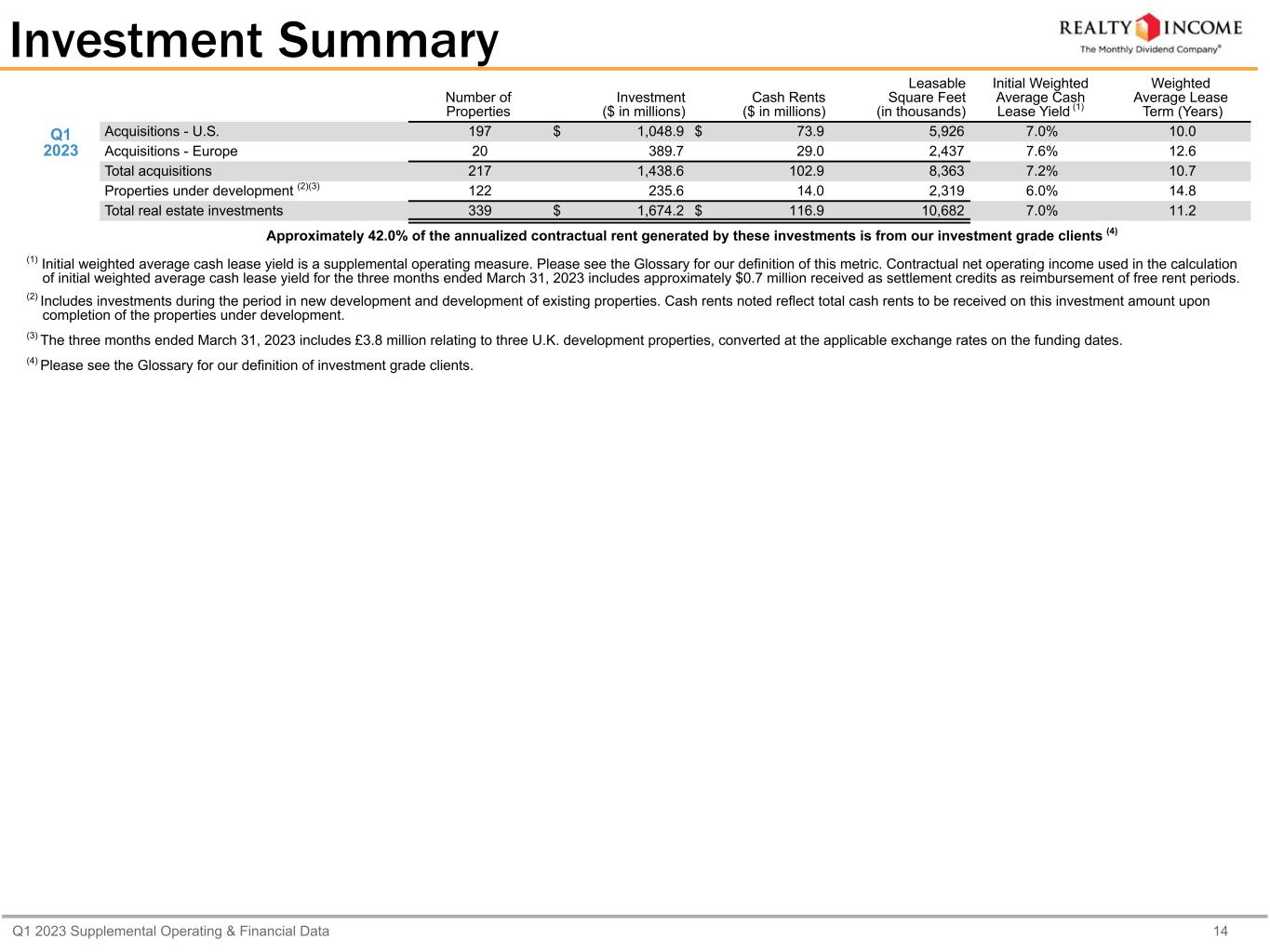 Q1 2023 Supplemental Operating & Financial Data 14 Investment Summary Number of Properties Investment ($ in millions) Cash Rents ($ in millions) Leasable Square Feet (in thousands) Initial Weighted Average Cash Lease Yield (1) Weighted Average Lease Term (Years) Q1 2023 Acquisitions - U.S. 197 $ 1,048.9 $ 73.9 5,926 7.0% 10.0 Acquisitions - Europe 20 389.7 29.0 2,437 7.6% 12.6 Total acquisitions 217 1,438.6 102.9 8,363 7.2% 10.7 Properties under development (2)(3) 122 235.6 14.0 2,319 6.0% 14.8 Total real estate investments 339 $ 1,674.2 $ 116.9 10,682 7.0% 11.2 Approximately 42.0% of the annualized contractual rent generated by these investments is from our investment grade clients (4) (1) Initial weighted average cash lease yield is a supplemental operating measure. Please see the Glossary for our definition of this metric. Contractual net operating income used in the calculation of initial weighted average cash lease yield for the three months ended March 31, 2023 includes approximately $0.7 million received as settlement credits as reimbursement of free rent periods. (2) Includes investments during the period in new development and development of existing properties. Cash rents noted reflect total cash rents to be received on this investment amount upon completion of the properties under development. (3) The three months ended March 31, 2023 includes £3.8 million relating to three U.K. development properties, converted at the applicable exchange rates on the funding dates. (4) Please see the Glossary for our definition of investment grade clients.